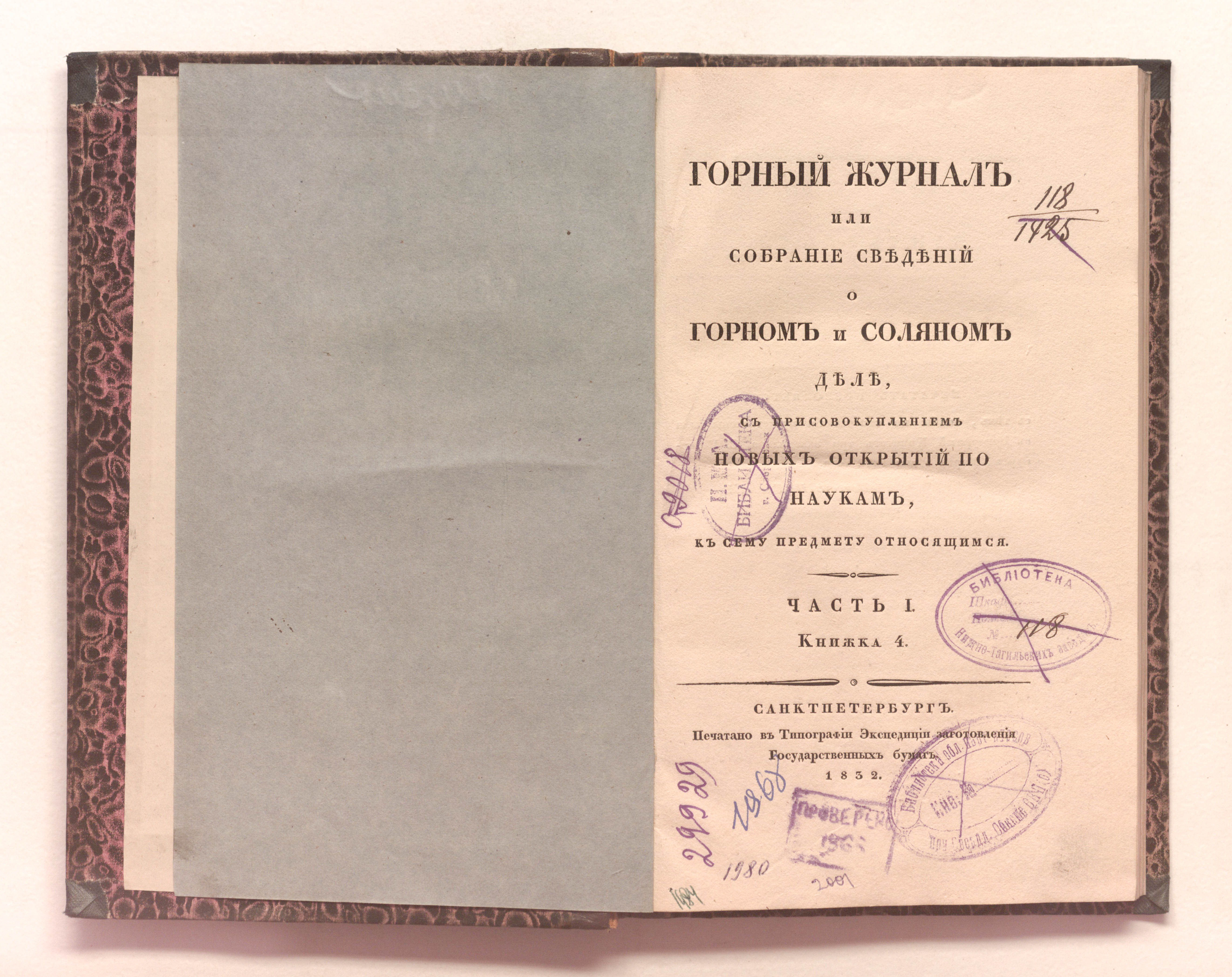 Ч. 1. Кн. 4. – Санкт-Петербург : печатано в типографии Экспедиции заготовления государственных бумаг, 1832. – [4], 153 с. : 1 л. черт. ; 23х14.5 см.