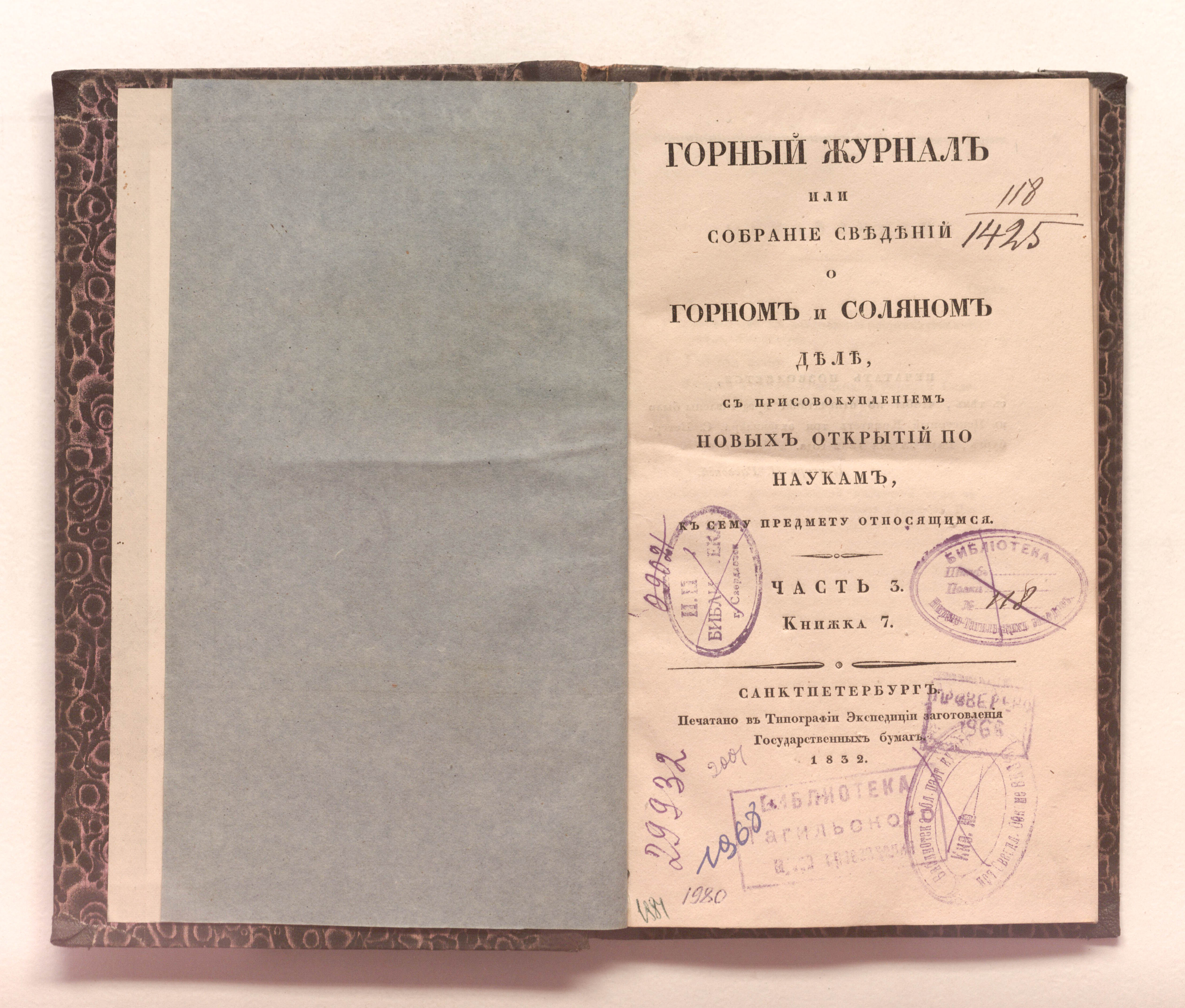 Ч. 3. Кн. 7. – Санкт-Петербург : печатано в типографии Экспедиции заготовления государственных бумаг, 1832. – [4], 144 с. : 1 л. черт. ; 23х14 см.