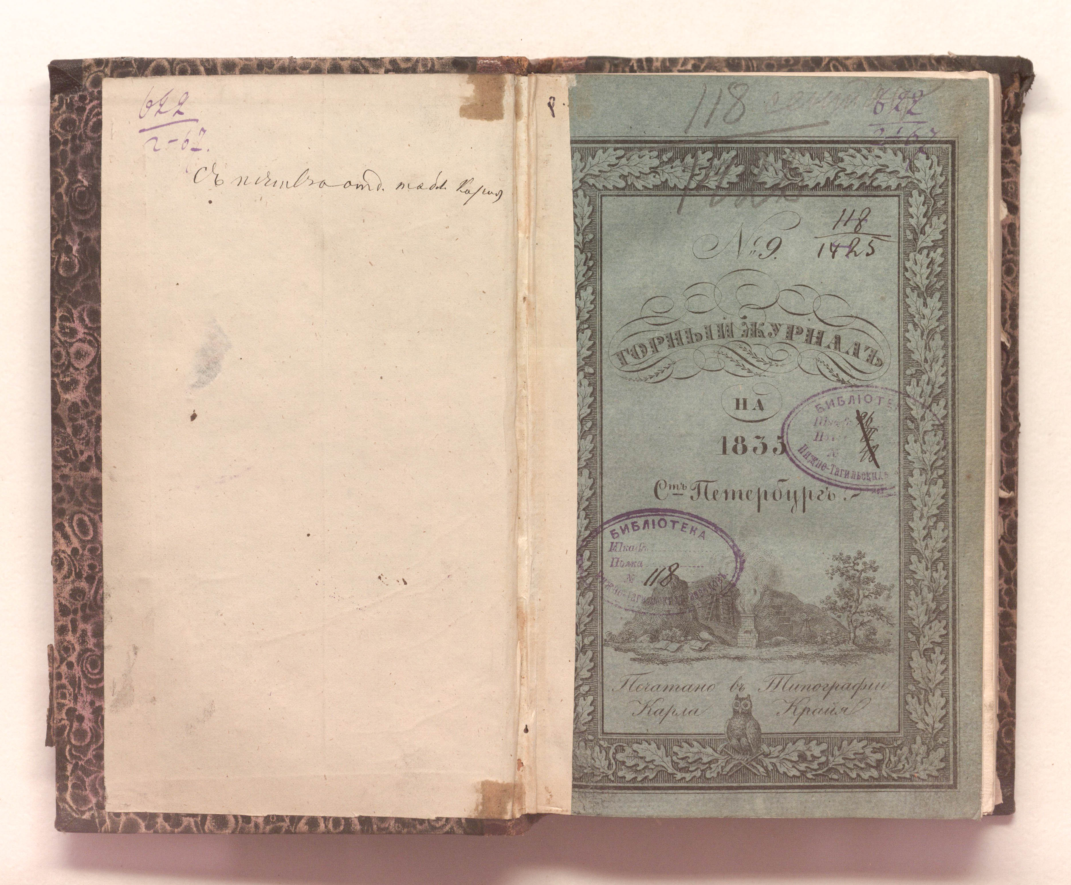 «Библиотека Нижне-Тагильских заводов. № 118» (изд. обл., тит. л.);
