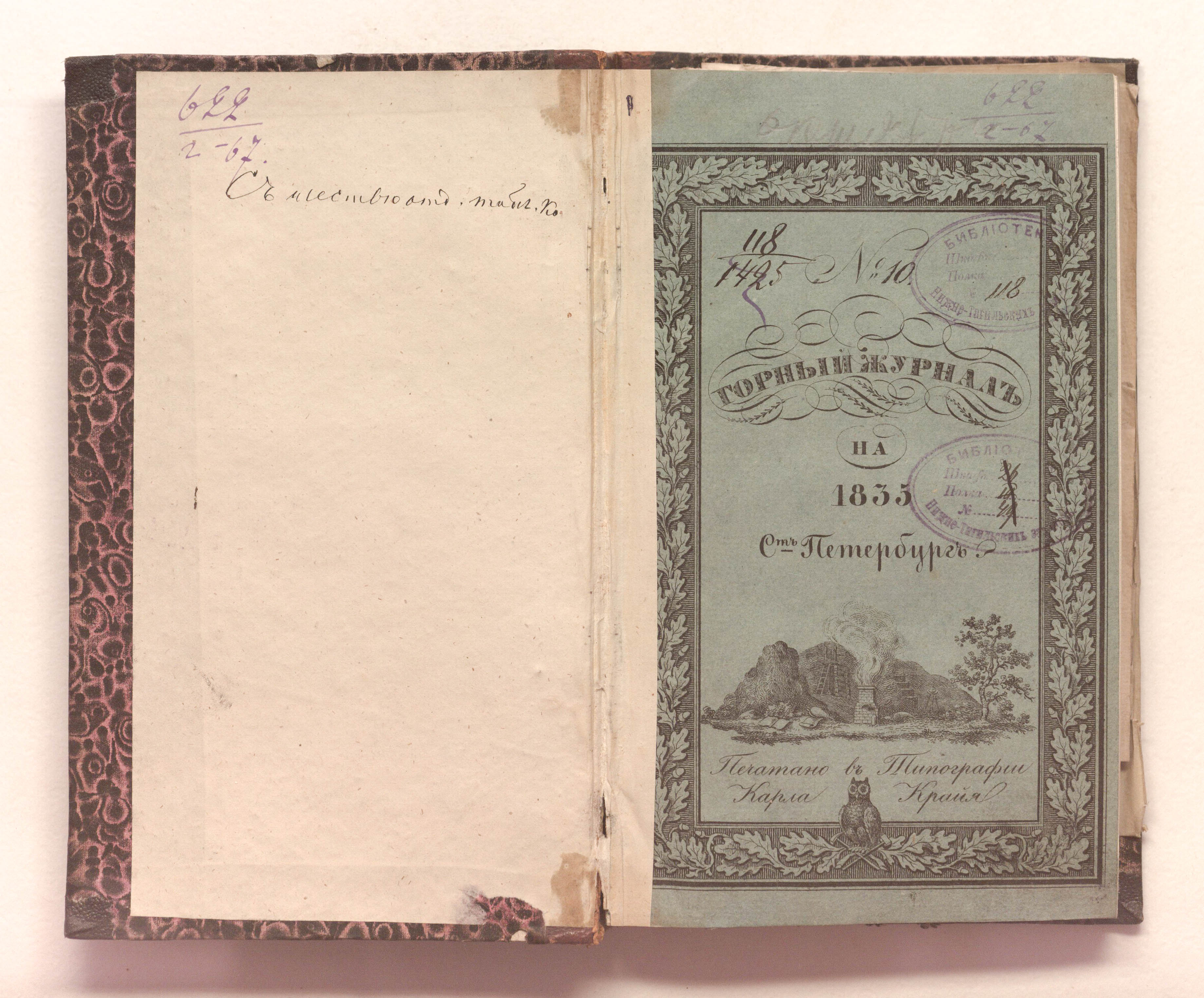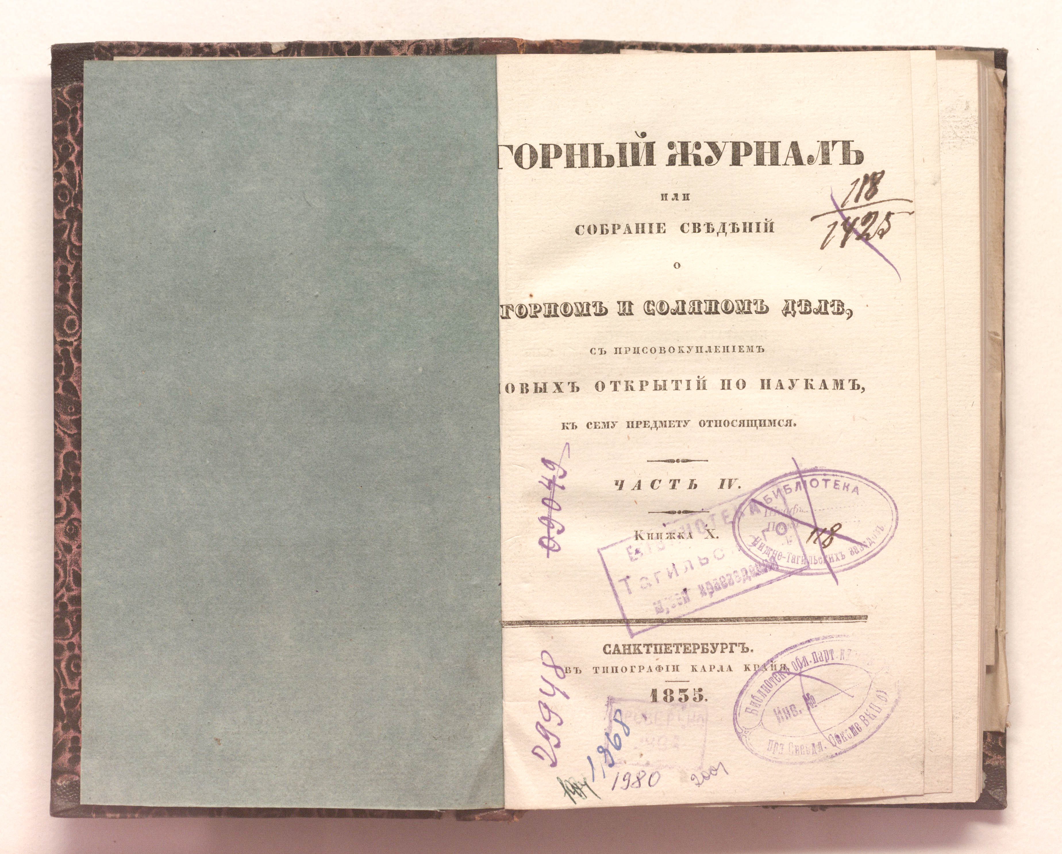 Горный журнал или Собрание сведений о горном и соляном деле, С присовокуплением новых открытий по наукам, к сему предмету относящимся. – Санкт-Петербург : печатано в Военной типографии Главнаго штаба его императорскаго величества ; в типографии Экспедиции заготовления государственных бумаг, 1825 - 1918.