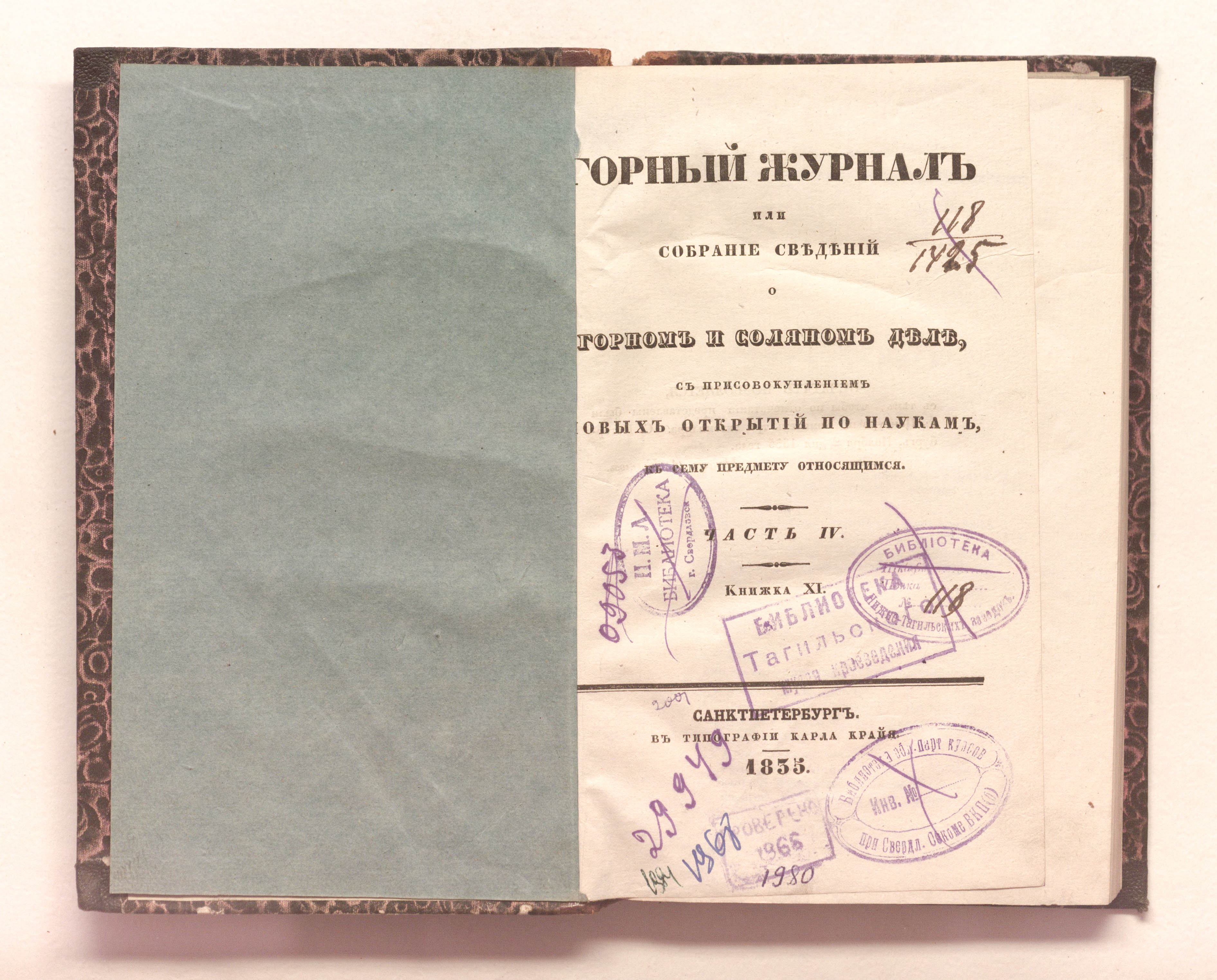 Горный журнал или Собрание сведений о горном и соляном деле, С присовокуплением новых открытий по наукам, к сему предмету относящимся. – Санкт-Петербург : печатано в Военной типографии Главнаго штаба его императорскаго величества ; в типографии Экспедиции заготовления государственных бумаг, 1825 - 1918.