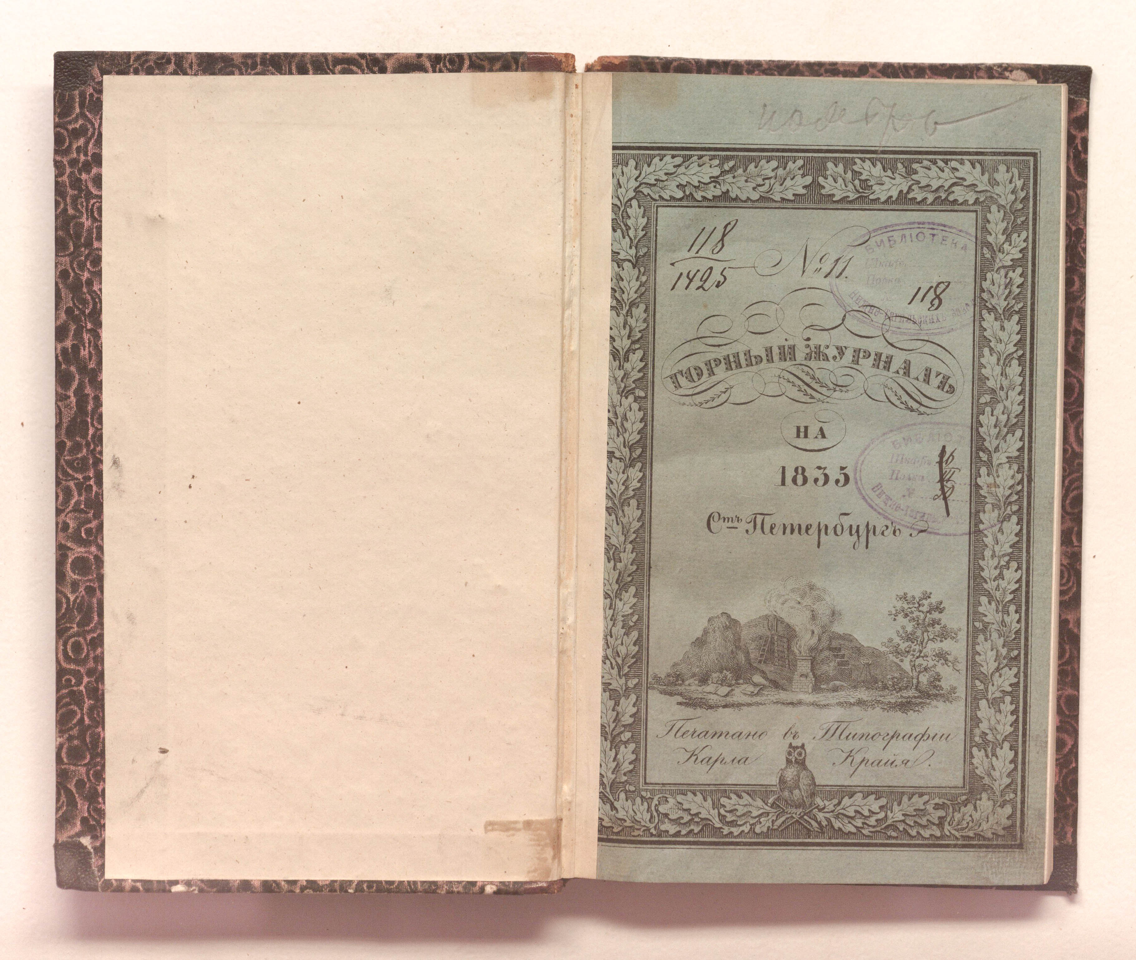 «Библиотека Нижне-Тагильских заводов. № 118» (изд. обл., тит. л.);