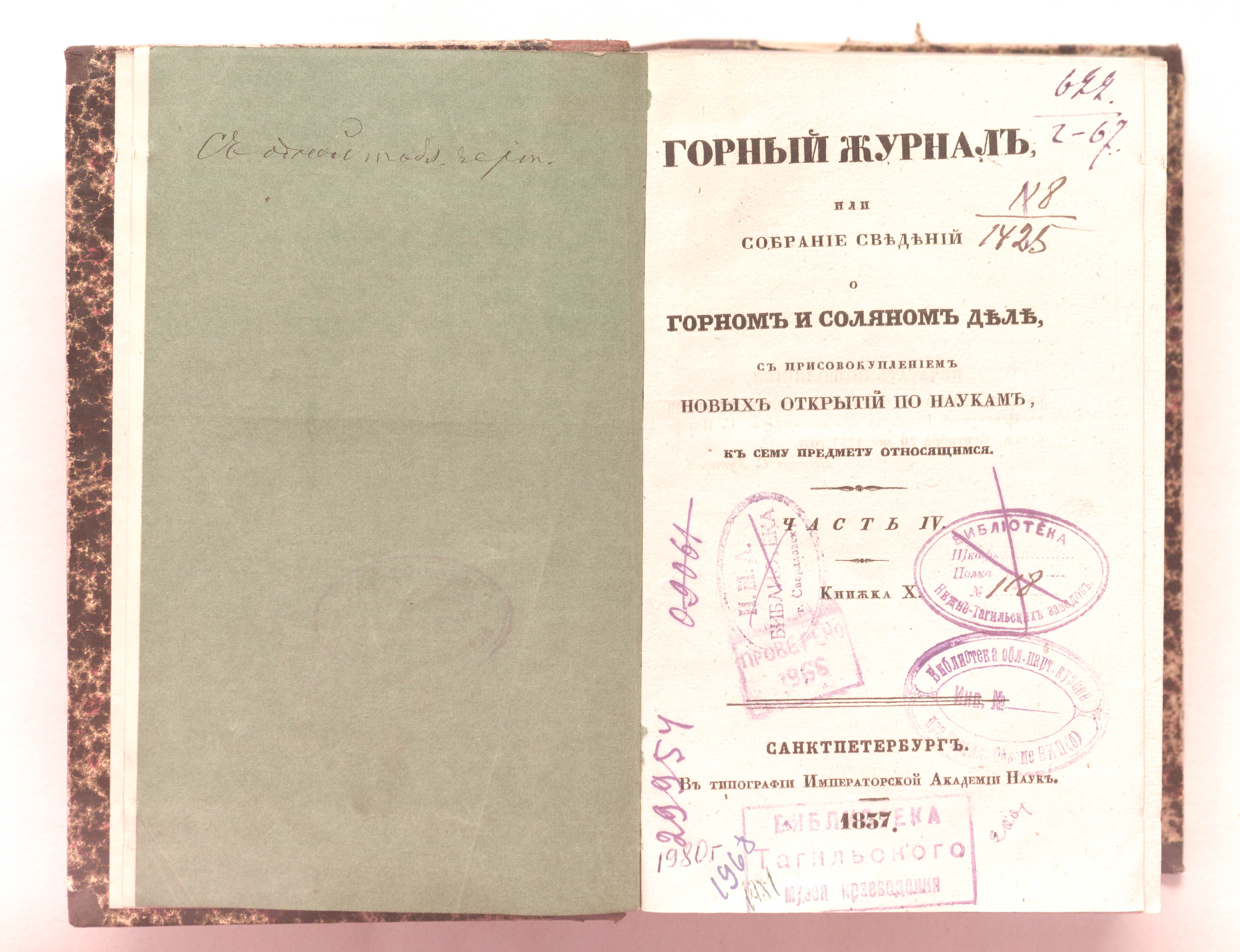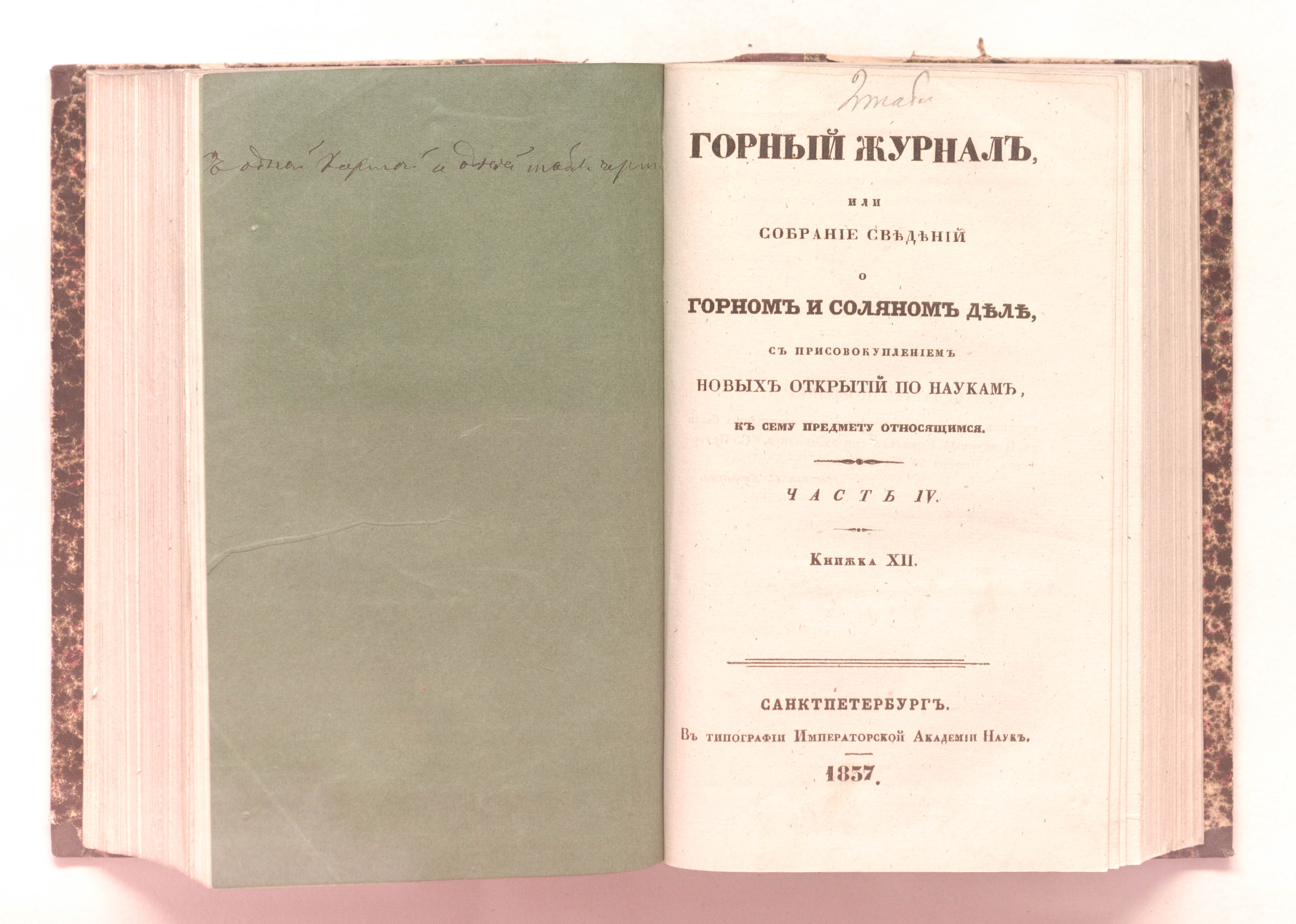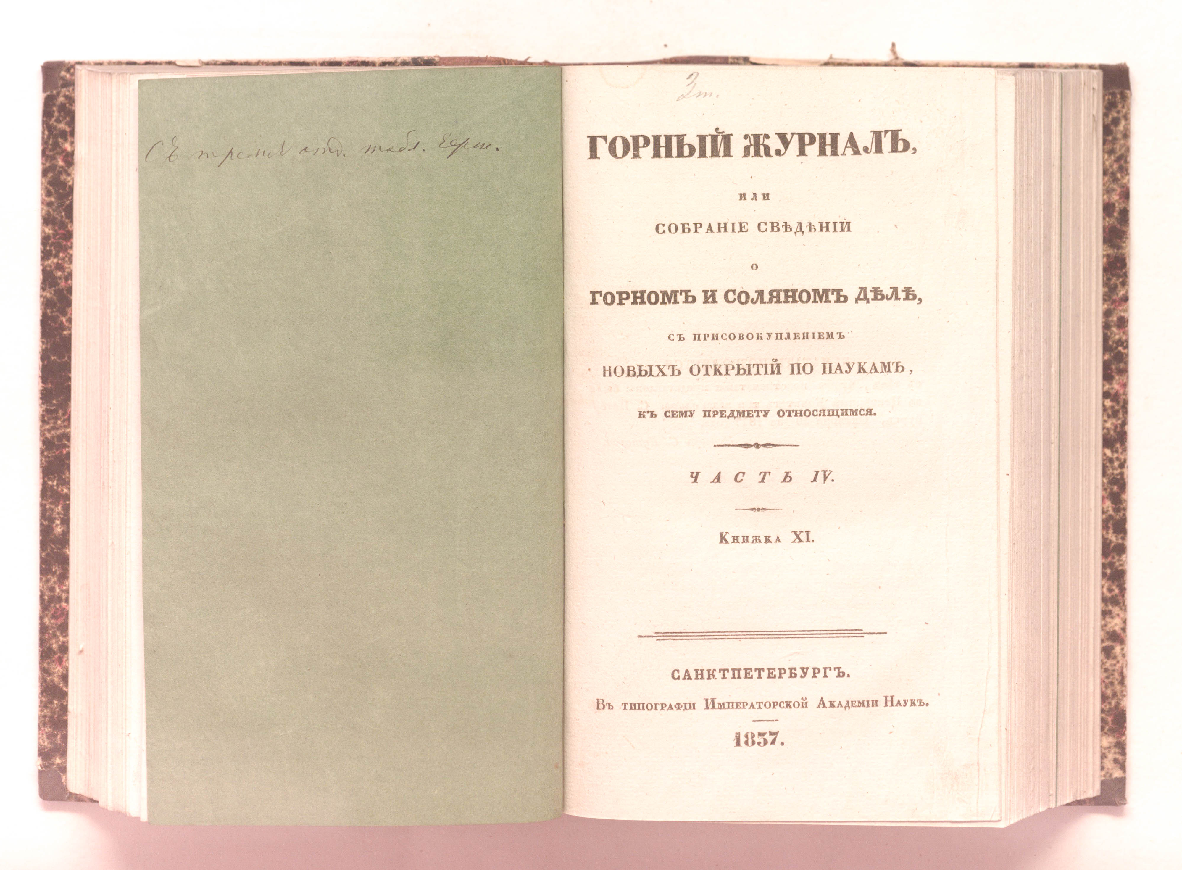 Горный журнал или Собрание сведений о горном и соляном деле, С присовокуплением новых открытий по наукам, к сему предмету относящимся. – Санкт-Петербург : печатано в Военной типографии Главнаго штаба его императорскаго величества ; в типографии Экспедиции заготовления государственных бумаг ; в типографии Карла Крайя ; в типографии императорской академии наук, 1825 - 1918.