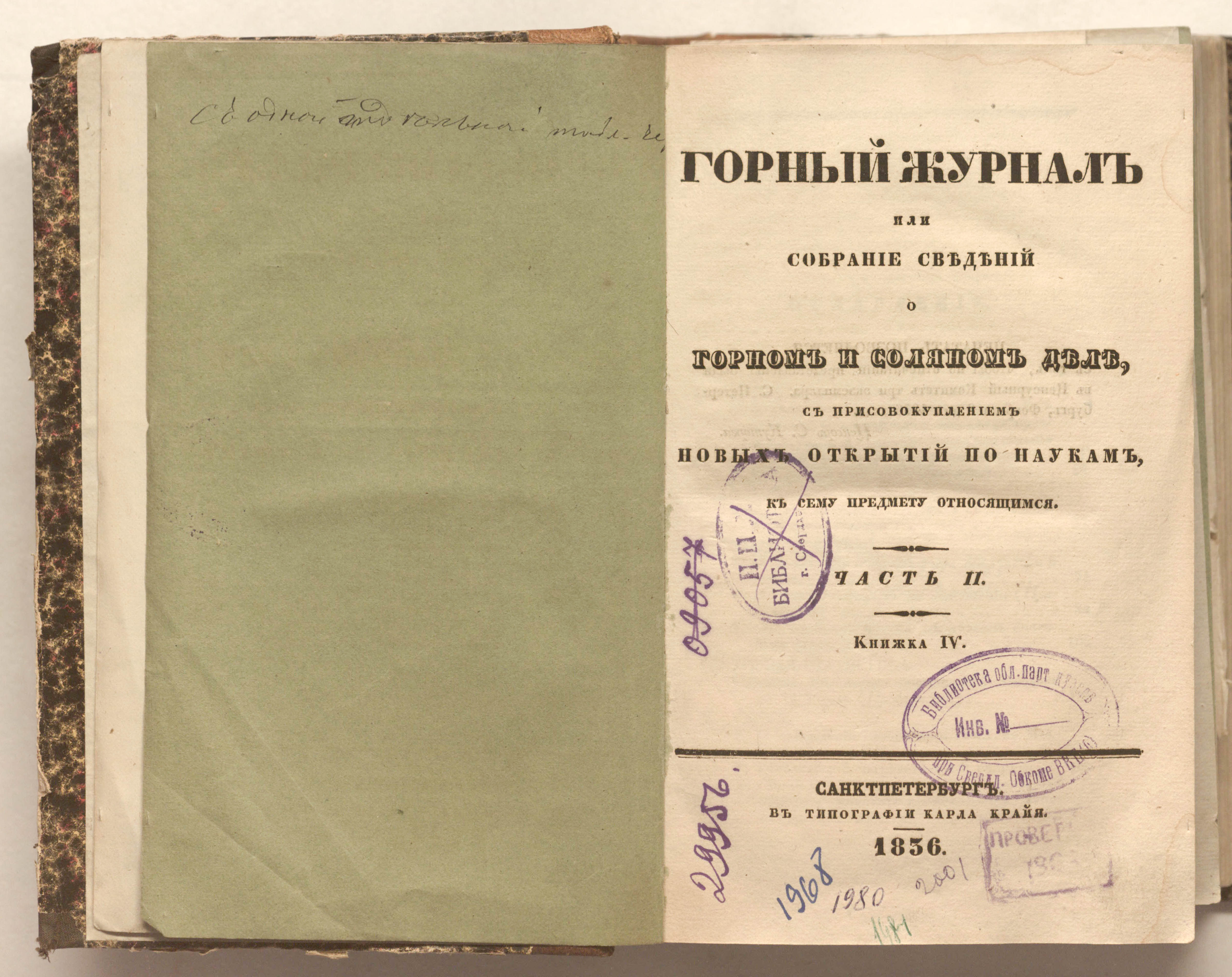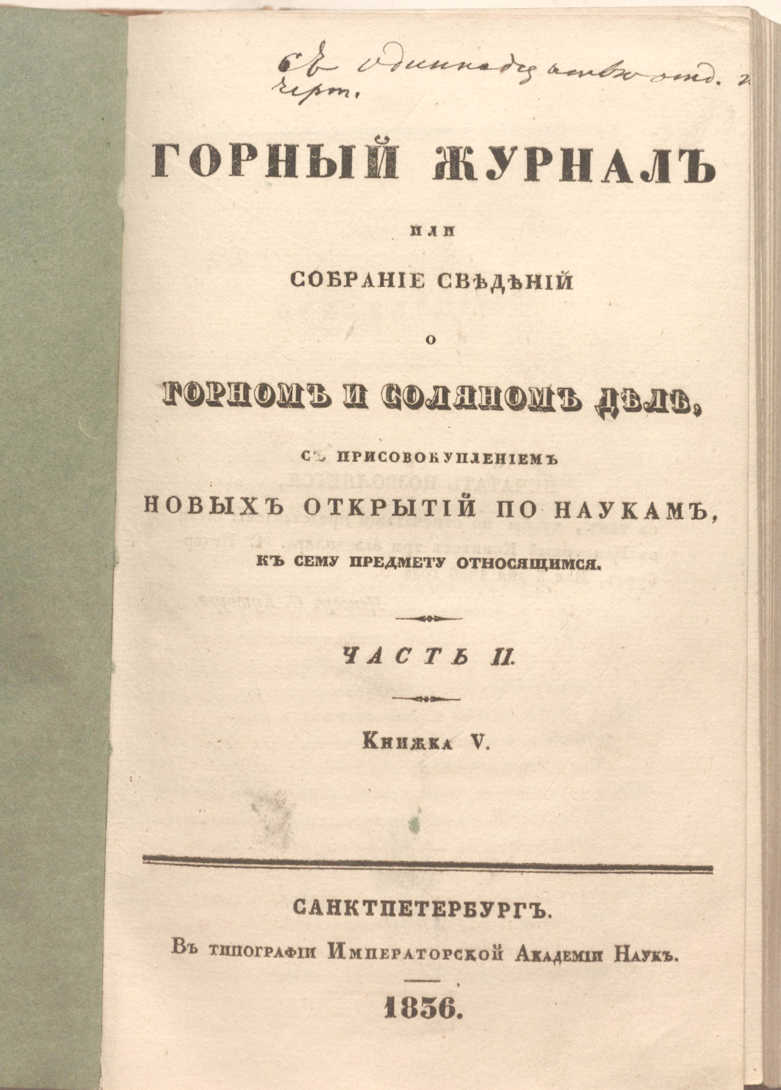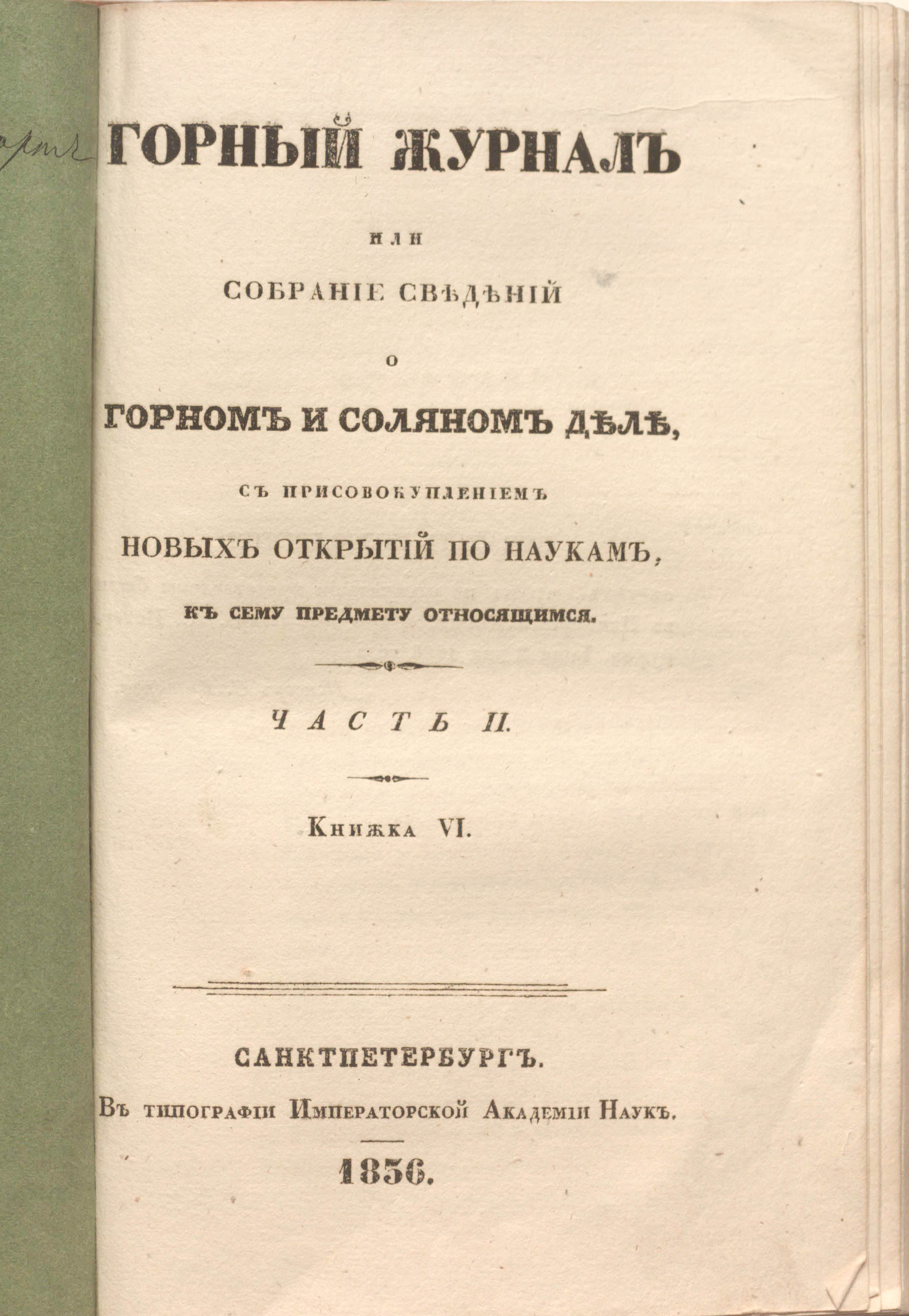 Горный журнал или Собрание сведений о горном и соляном деле, С присовокуплением новых открытий по наукам, к сему предмету относящимся. - Санкт-Петербург : Печатано в Военной типографии Главнаго штаба его императорскаго величества ; в типографии Экспедиции заготовления государственных бумаг ; в типографии Карла Крайя ; в типографии императорской академии наук, 1825 - 1918.