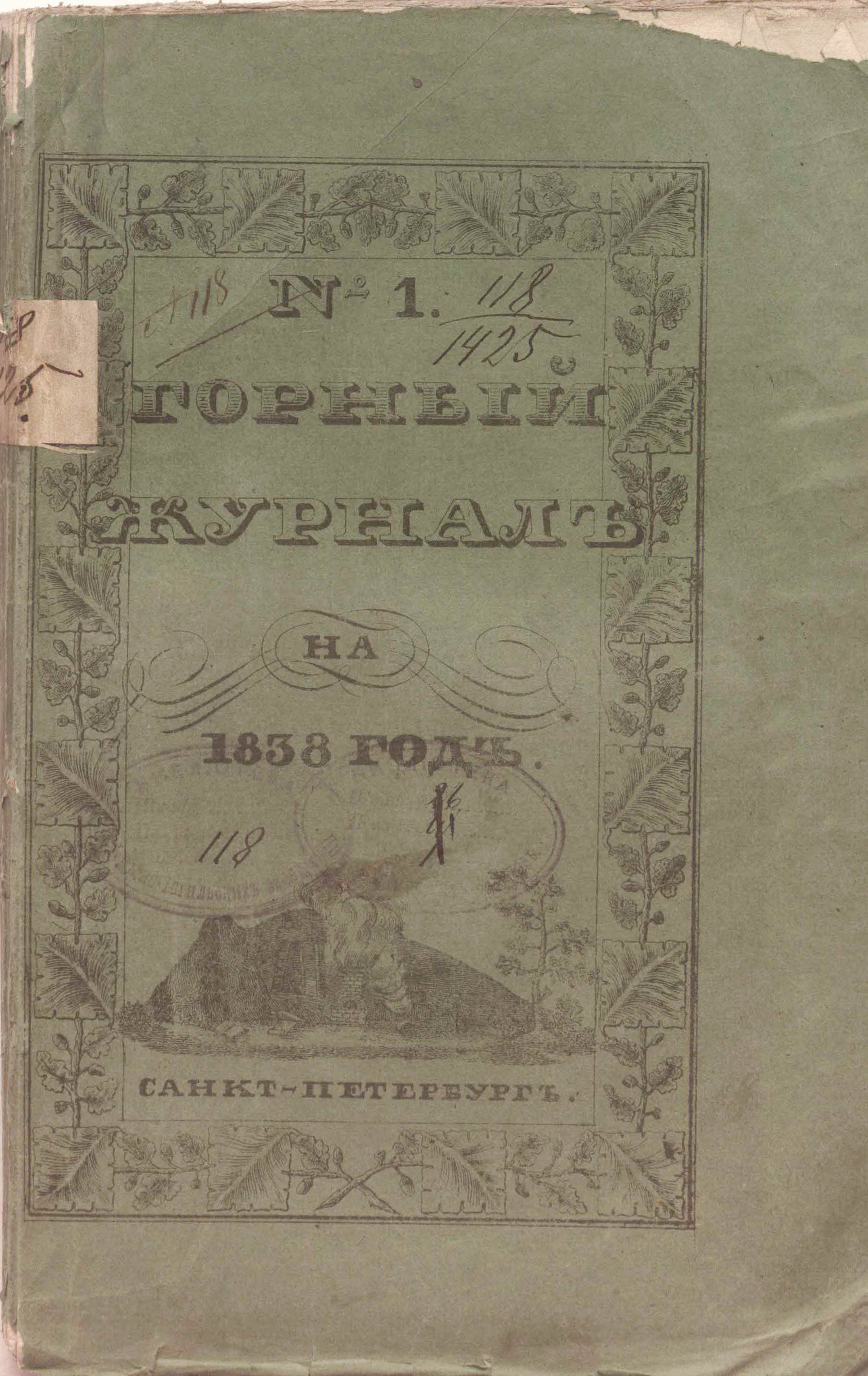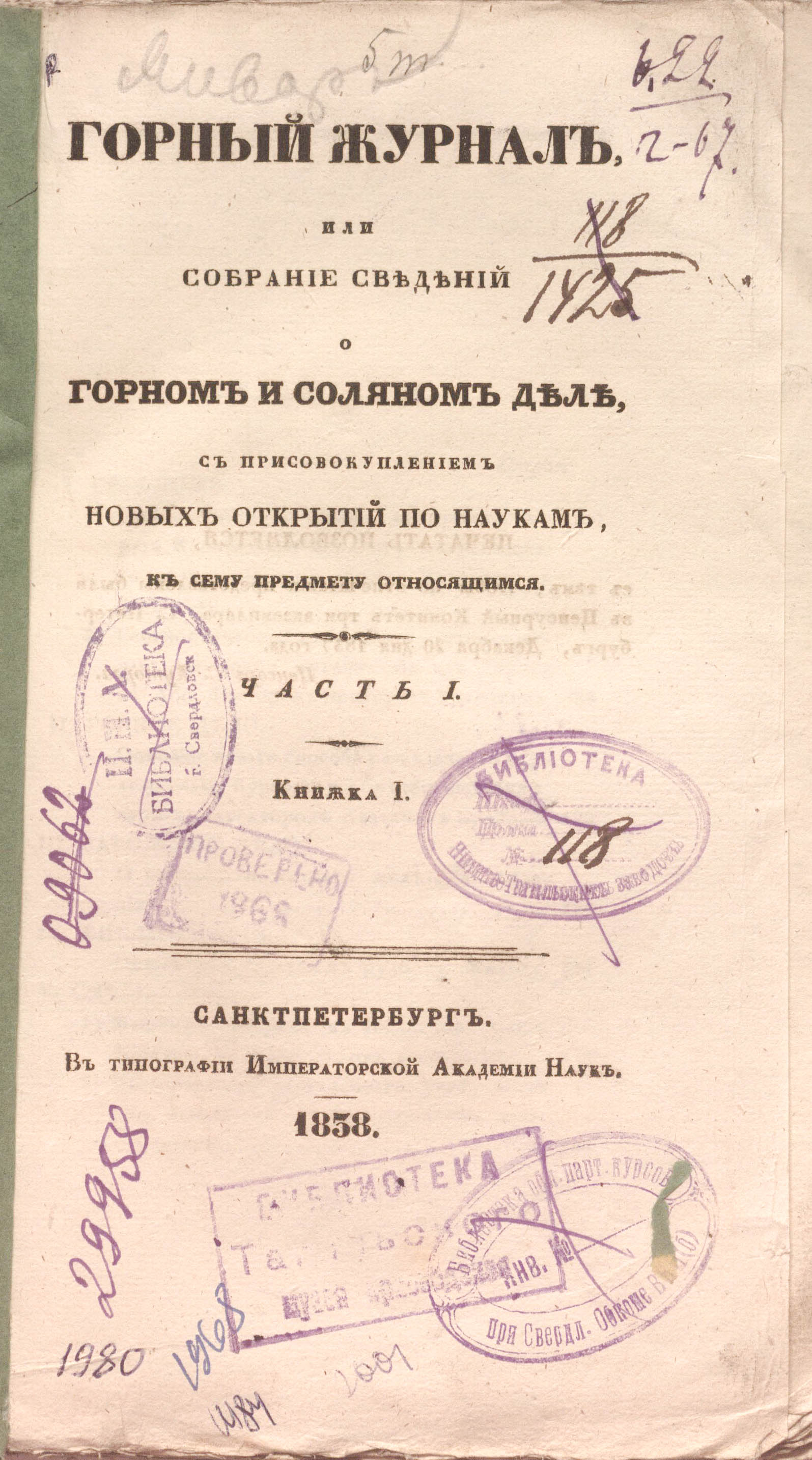 Горный журнал или Собрание сведений о горном и соляном деле, С присовокуплением новых открытий по наукам, к сему предмету относящимся. – Санкт-Петербург : печатано в Военной типографии Главнаго штаба его императорскаго величества ; в типографии Экспедиции заготовления государственных бумаг ; в типографии Карла Крайя ; в типографии императорской академии наук, 1825 - 1918.