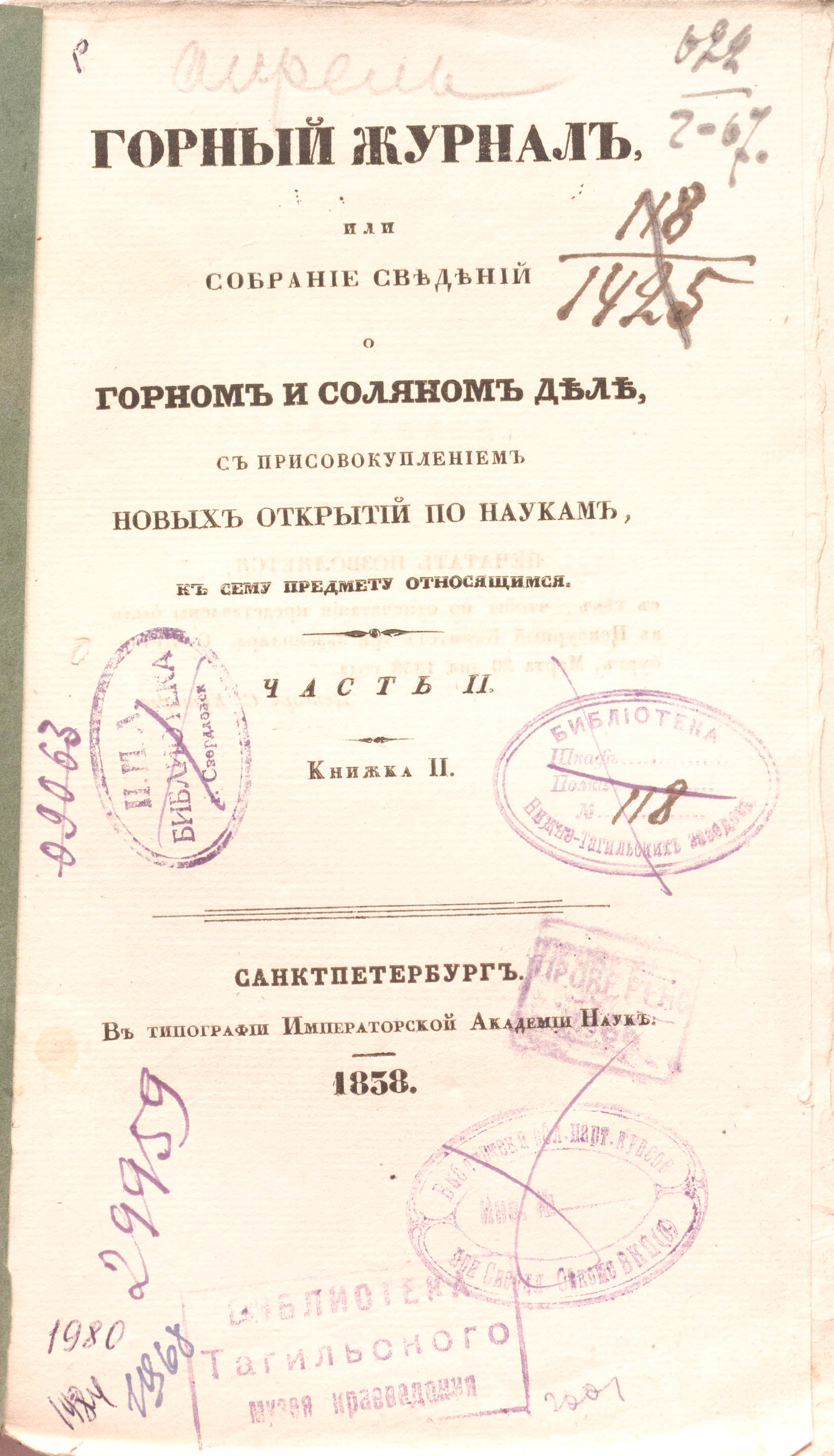 Горный журнал или Собрание сведений о горном и соляном деле, С присовокуплением новых открытий по наукам, к сему предмету относящимся. – Санкт-Петербург : печатано в Военной типографии Главнаго штаба его императорскаго величества ; в типографии Экспедиции заготовления государственных бумаг ; в типографии Карла Крайя ; в типографии императорской академии наук, 1825 - 1918.