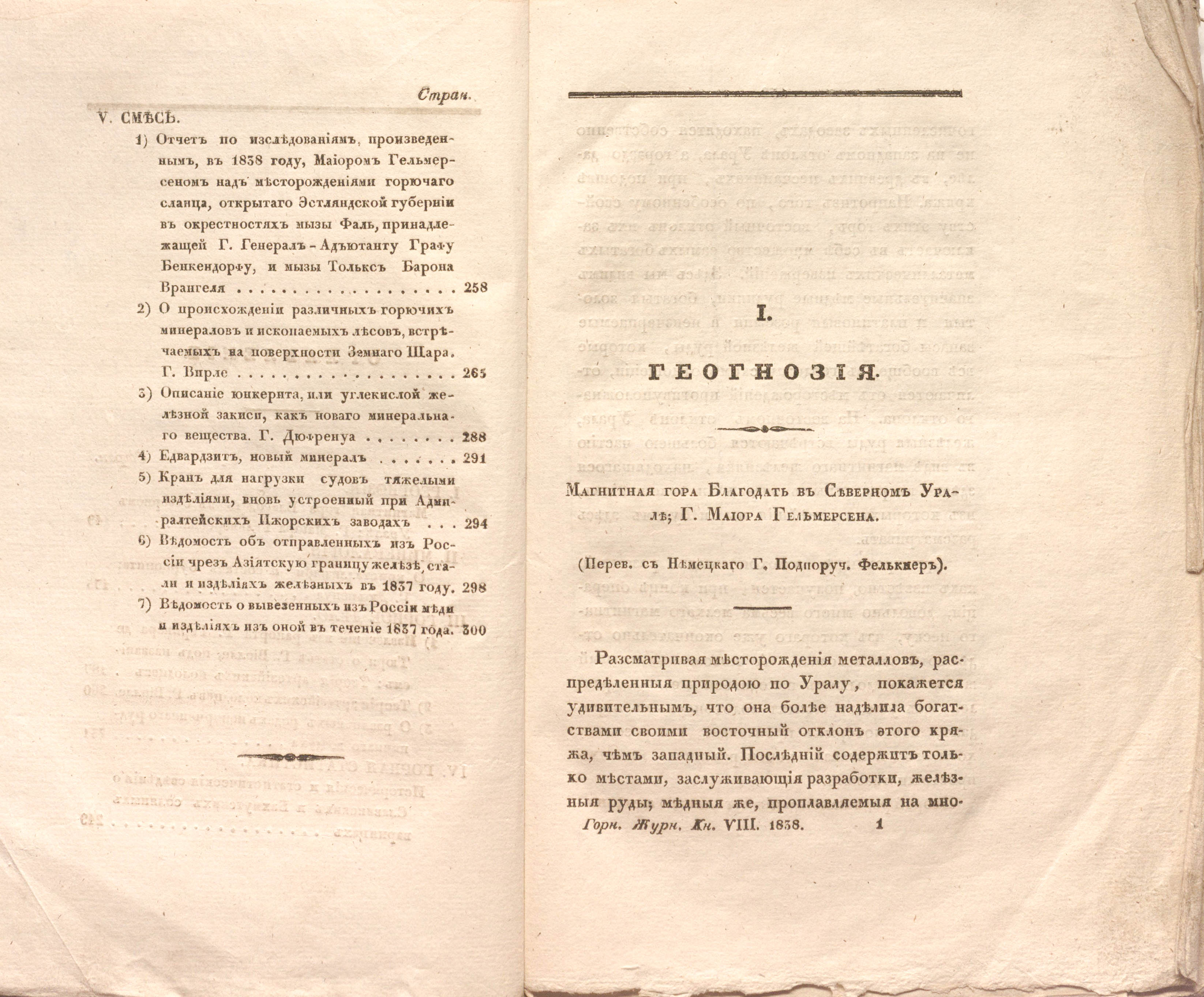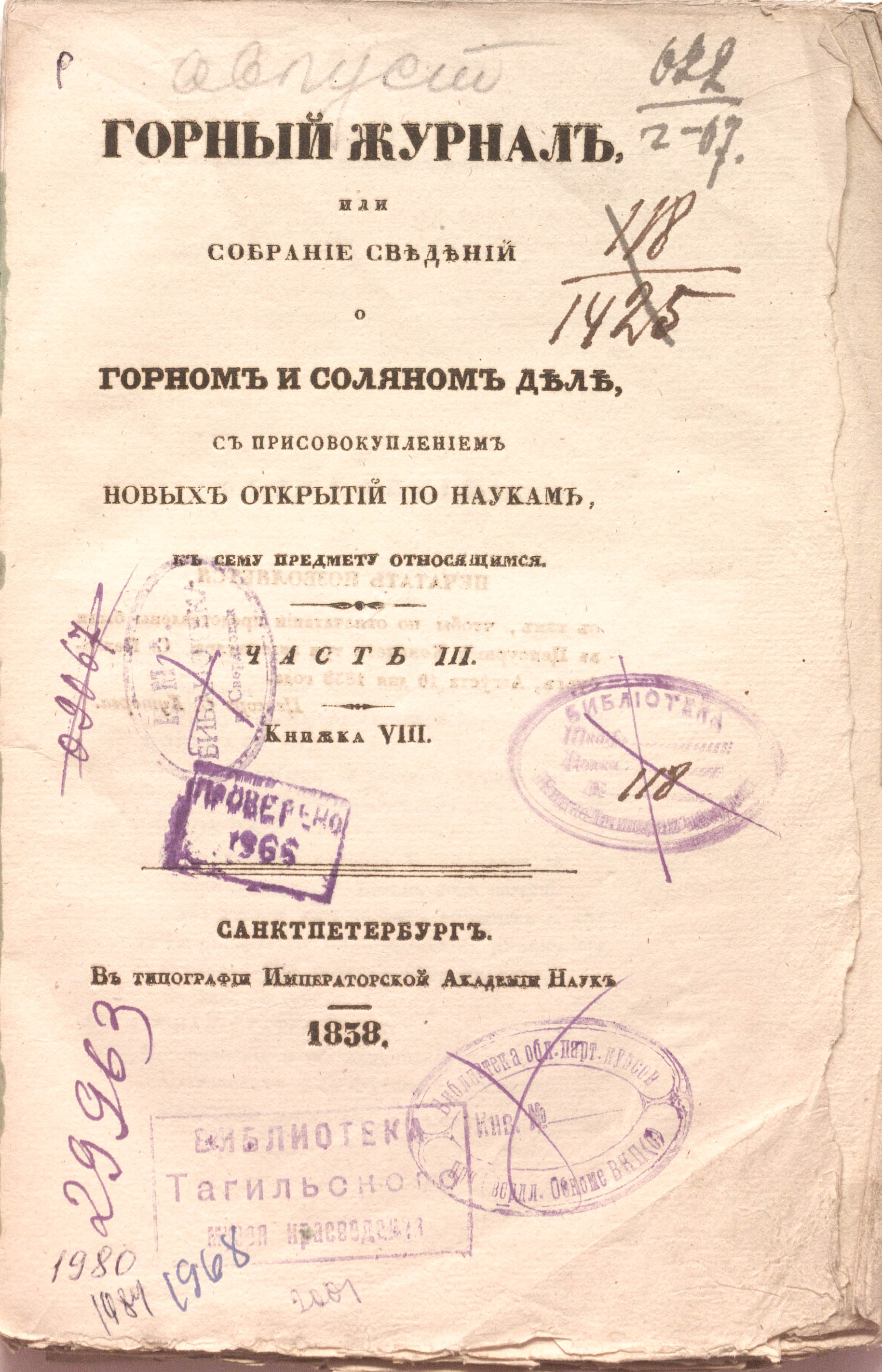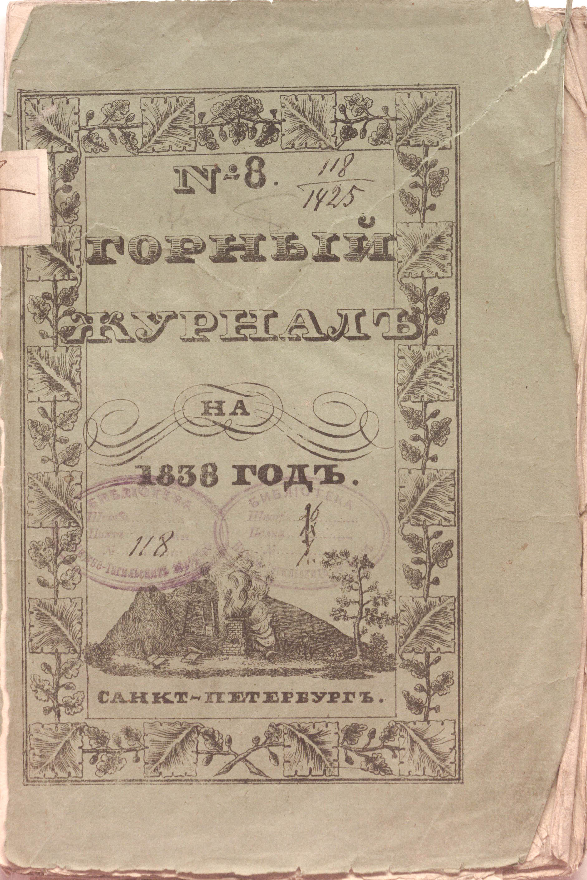 Горный журнал или Собрание сведений о горном и соляном деле, С присовокуплением новых открытий по наукам, к сему предмету относящимся. – Санкт-Петербург : печатано в Военной типографии Главнаго штаба его императорскаго величества ; в типографии Экспедиции заготовления государственных бумаг ; в типографии Карла Крайя ; в типографии императорской академии наук, 1825 - 1918.