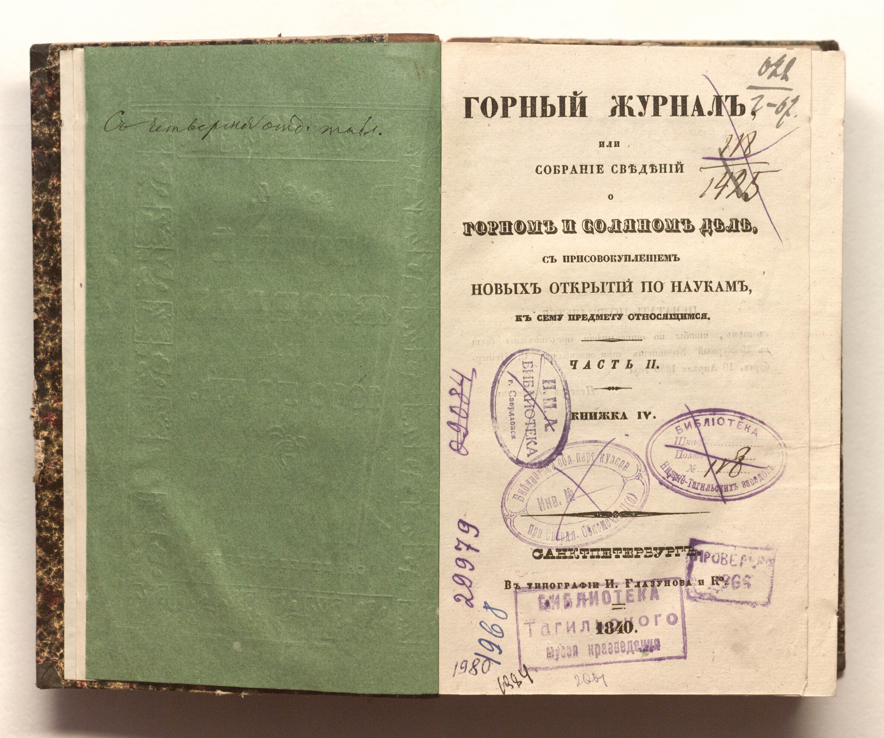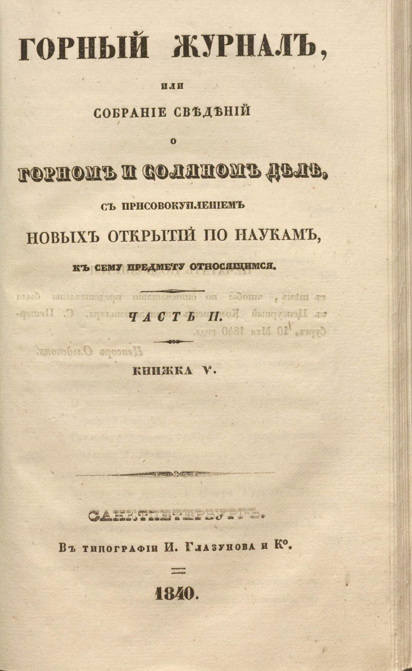 Горный журнал или Собрание сведений о горном и соляном деле, С присовокуплением новых открытий по наукам, к сему предмету относящимся. – Санкт-Петербург : Печатано в Военной типографии Главнаго штаба его императорскаго величества ; в типографии Экспедиции заготовления государственных бумаг ; в типографии Карла Крайя ; в типографии императорской академии наук, 1825 - 1918.