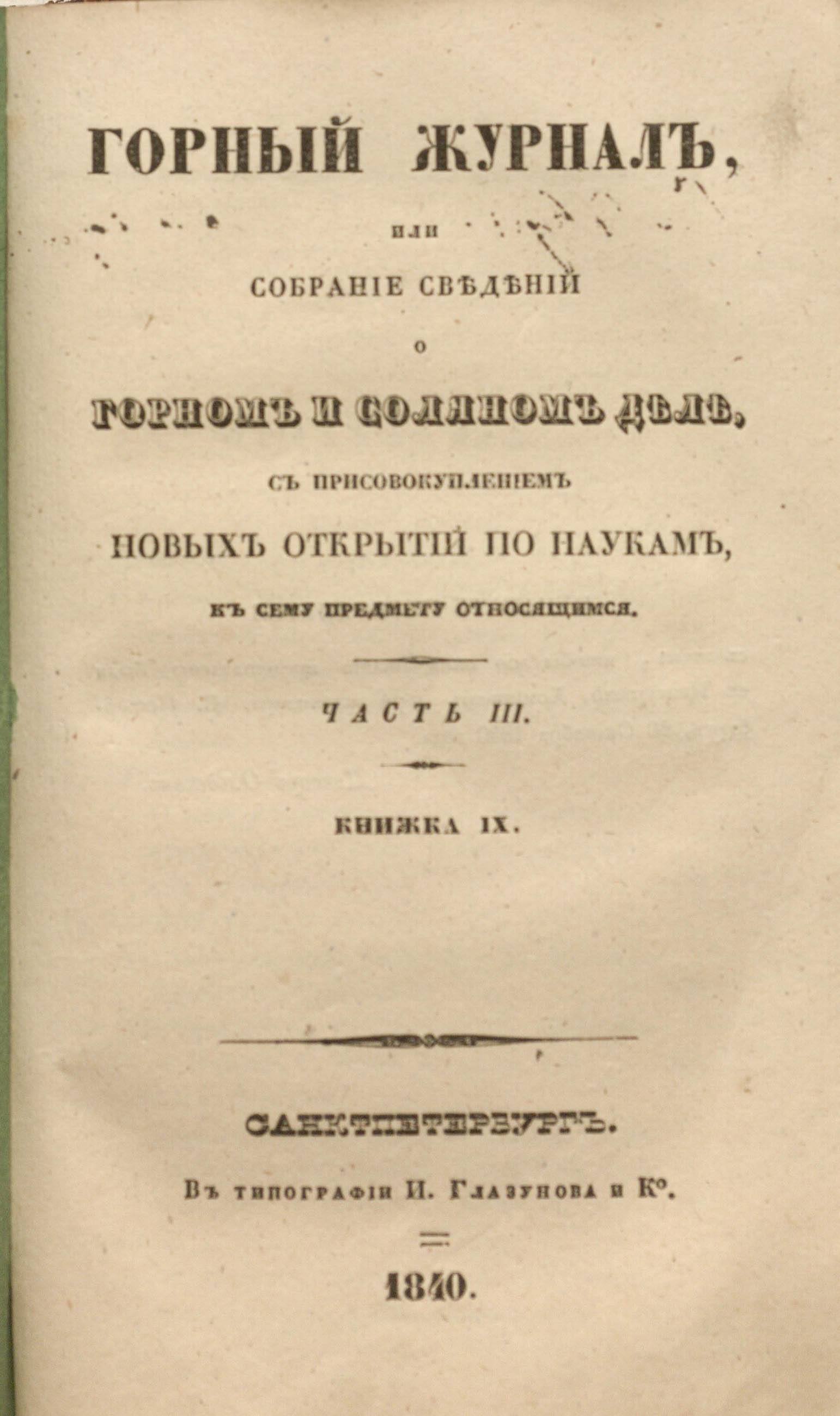 Горный журнал или Собрание сведений о горном и соляном деле, С присовокуплением новых открытий по наукам, к сему предмету относящимся. - Санкт-Петербург : Печатано в Военной типографии Главнаго штаба его императорскаго величества ; в типографии Экспедиции заготовления государственных бумаг ; в типографии Карла Крайя ; в типографии императорской академии наук, 1825 - 1918.