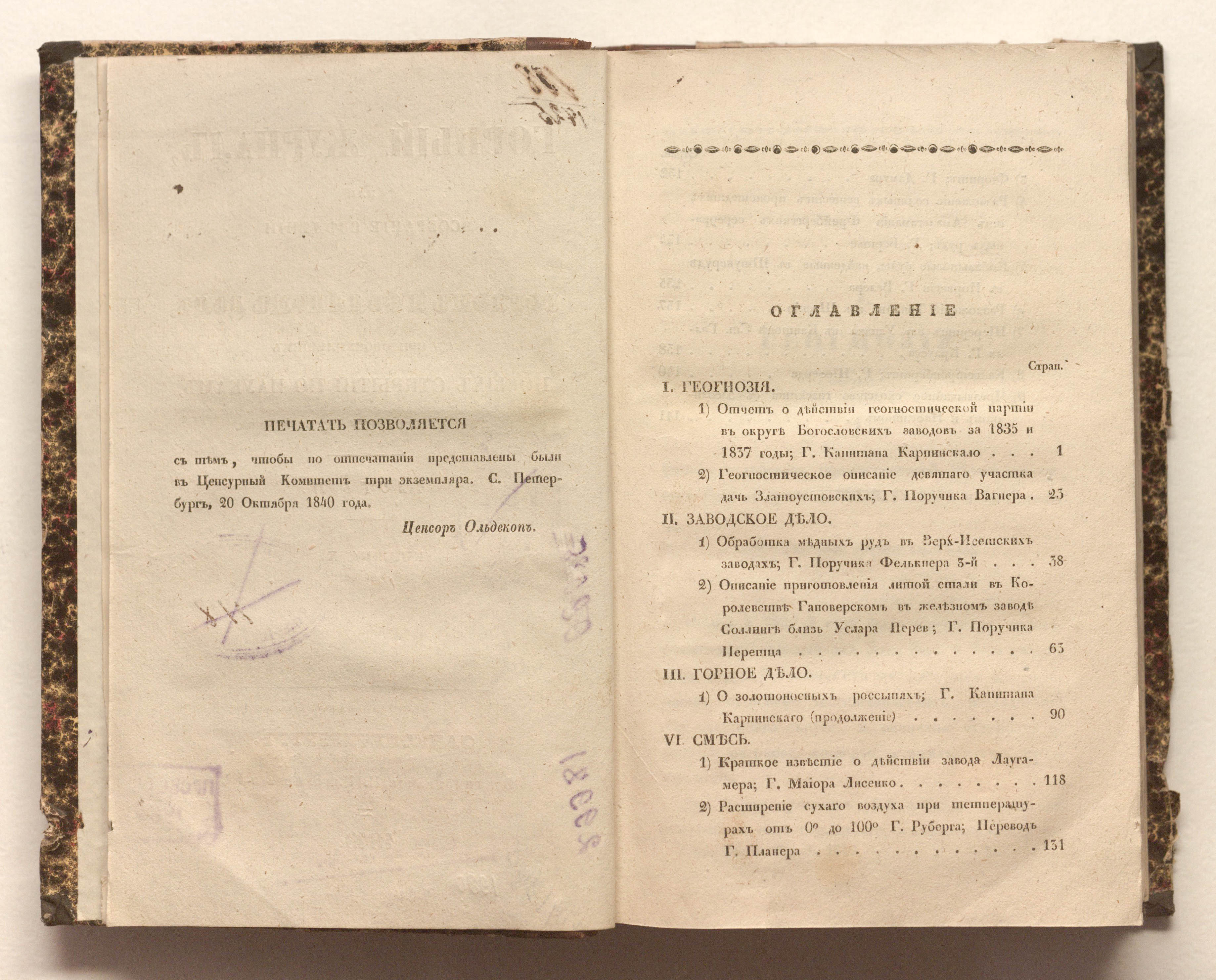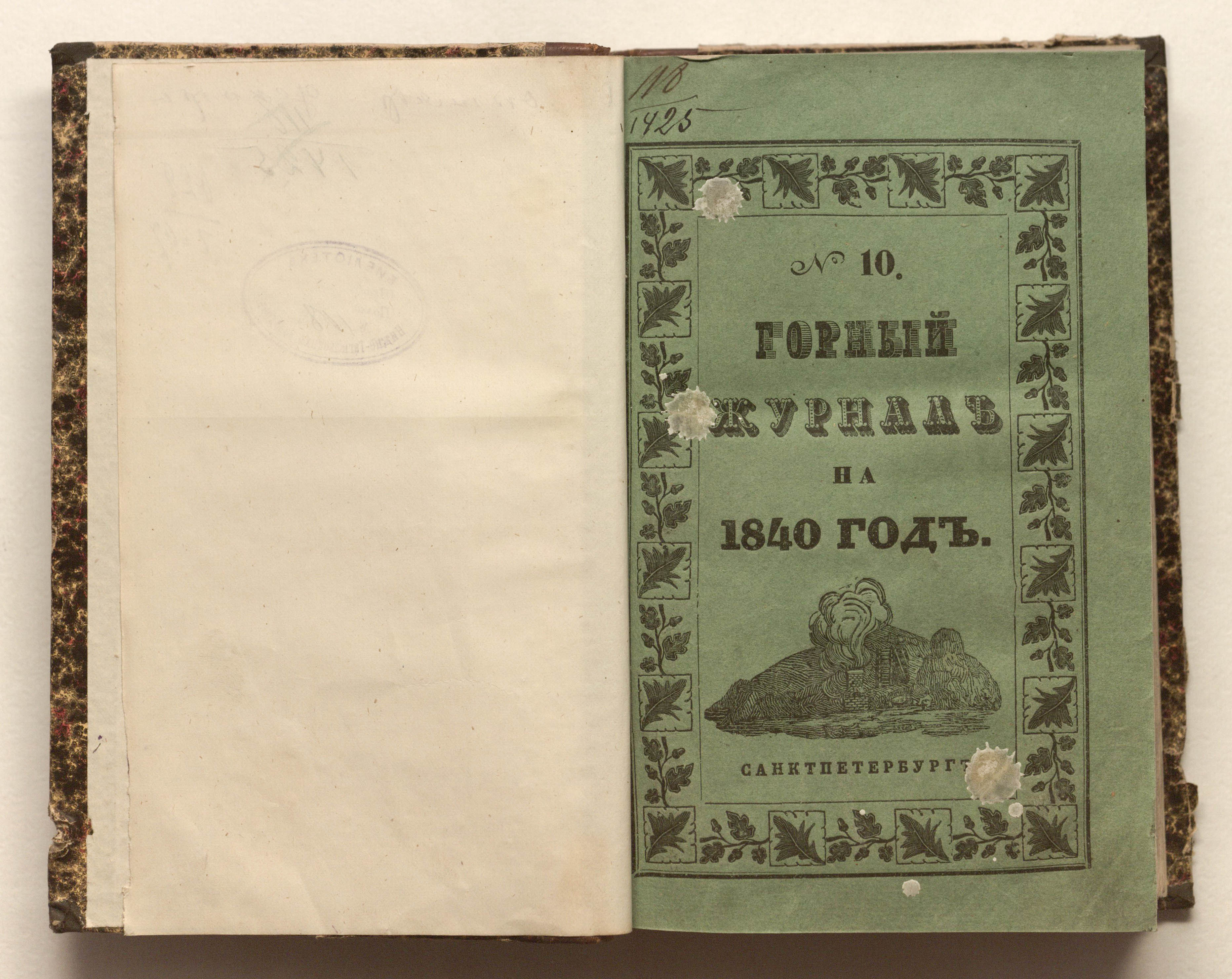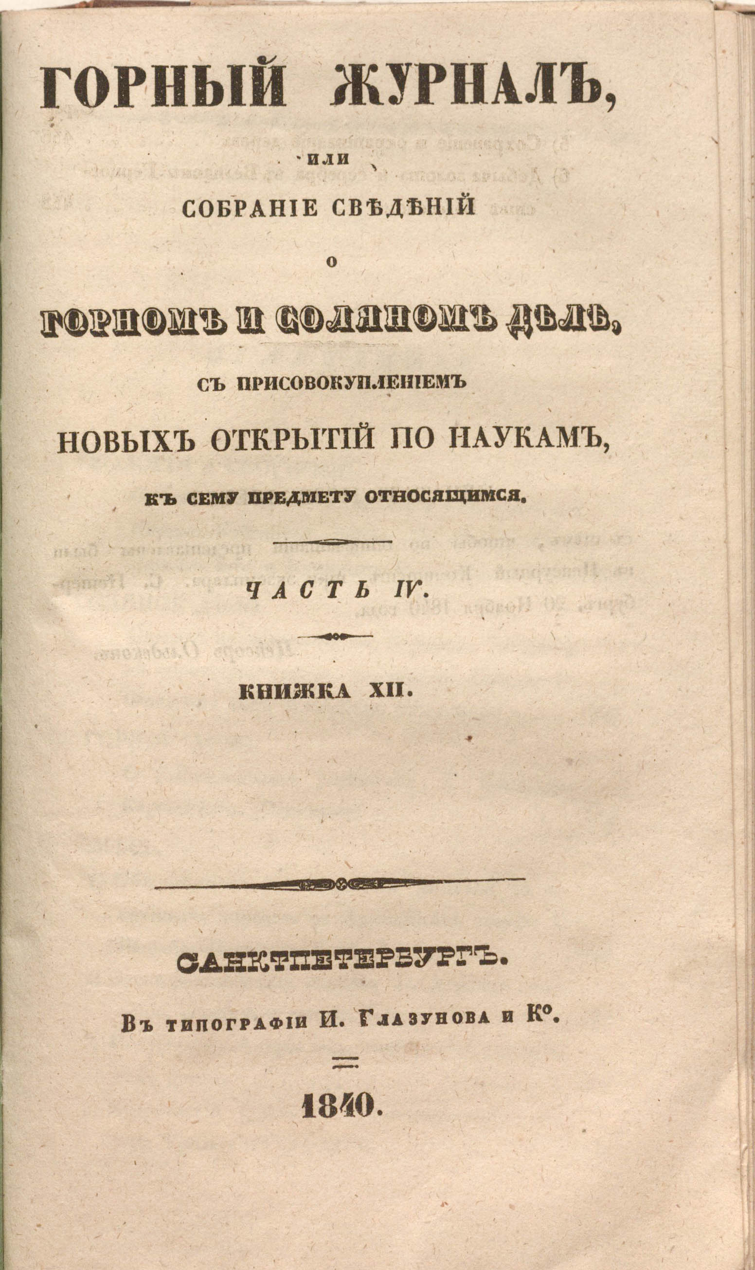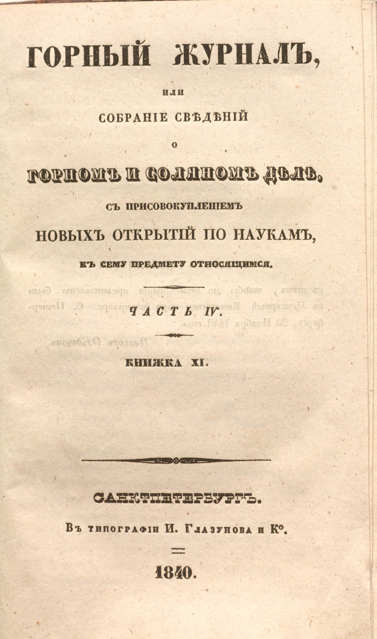 Горный журнал или Собрание сведений о горном и соляном деле, С присовокуплением новых открытий по наукам, к сему предмету относящимся. - Санкт-Петербург : Печатано в Военной типографии Главнаго штаба его императорскаго величества ; в типографии Экспедиции заготовления государственных бумаг ; в типографии Карла Крайя ; в типографии императорской академии наук, 1825 - 1918.