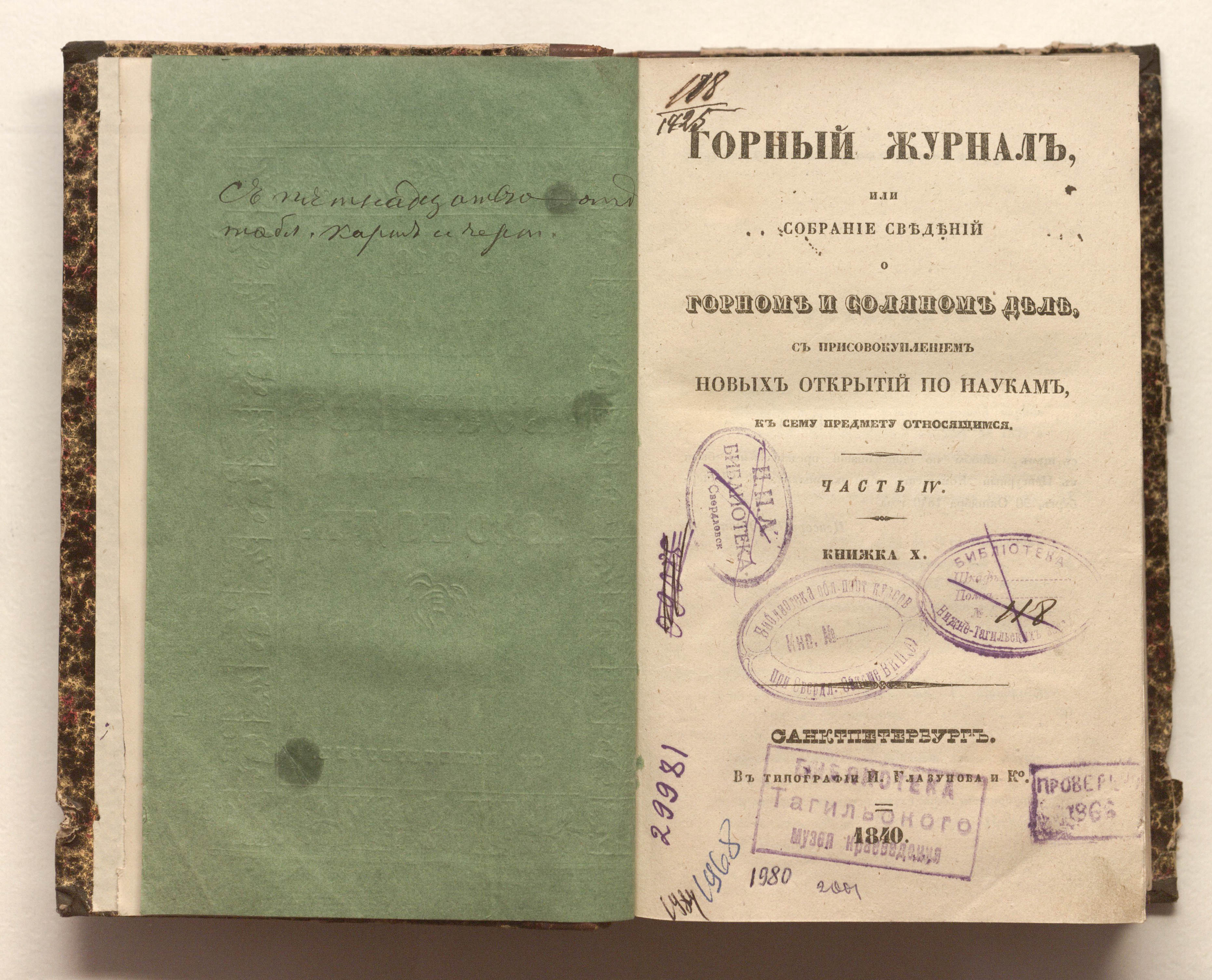 «Библиотека Нижне-Тагильских заводов.» (форзац, тит. л.);