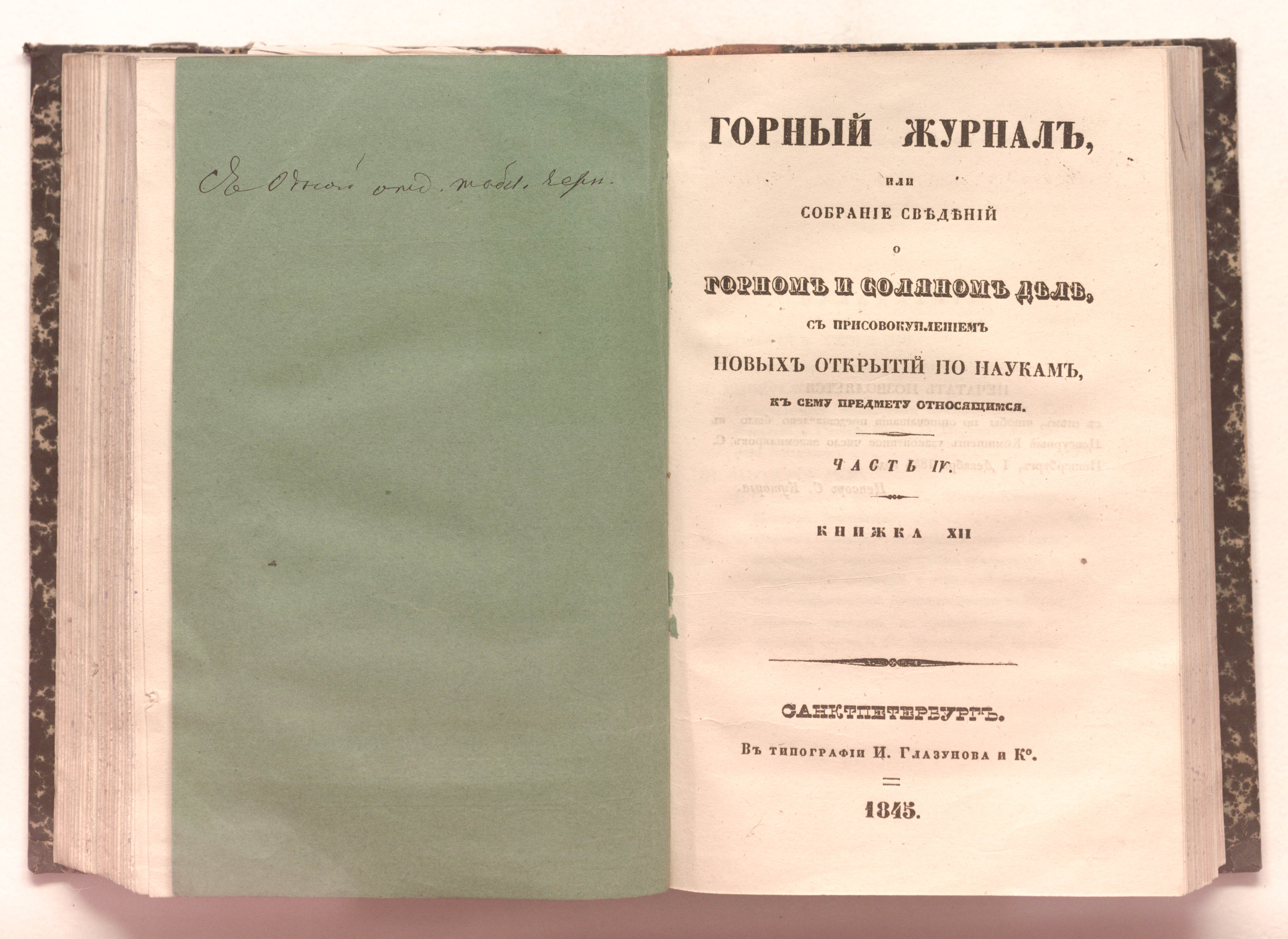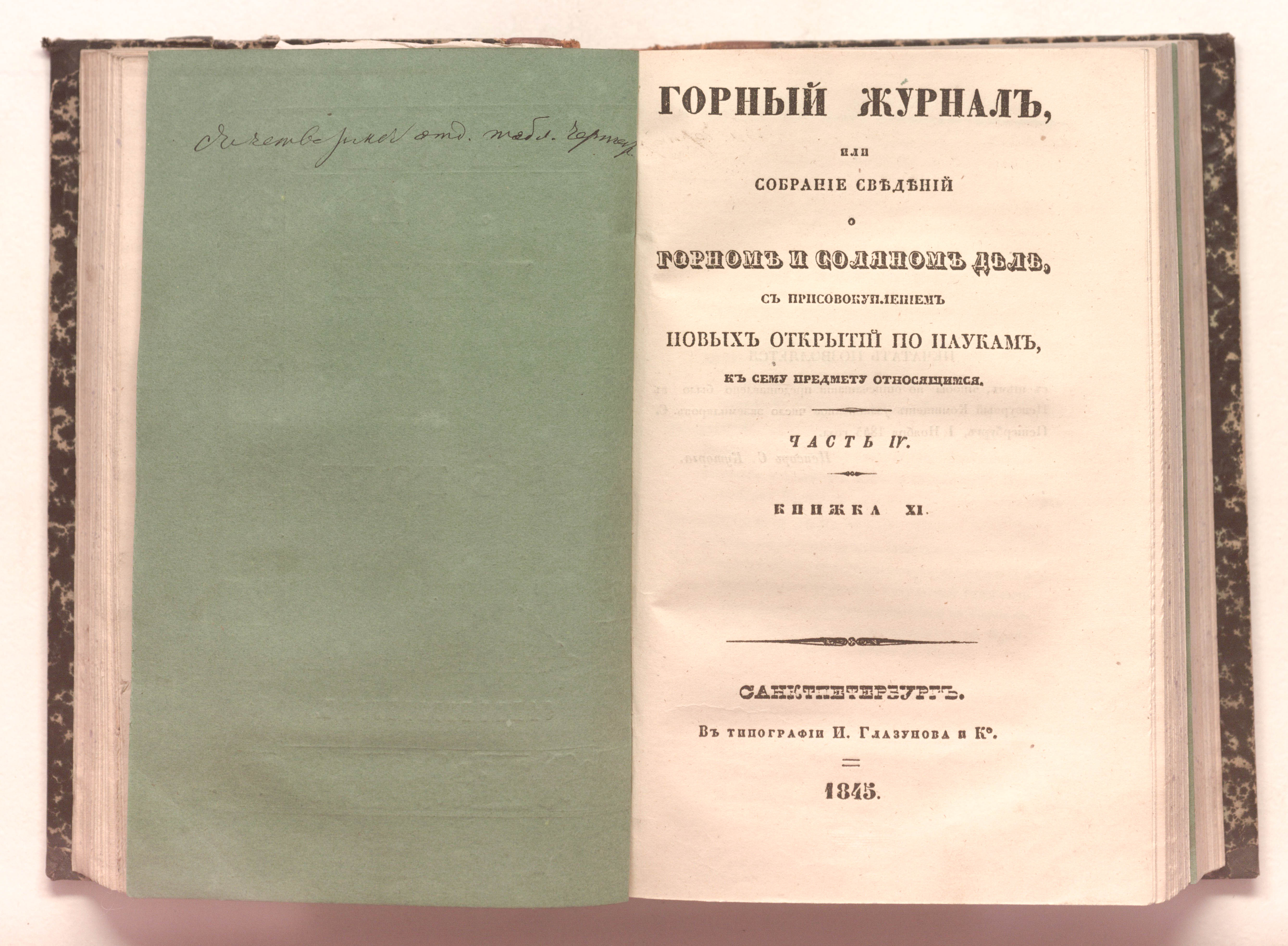 Горный журнал или Собрание сведений о горном и соляном деле, С присовокуплением новых открытий по наукам, к сему предмету относящимся. – Санкт-Петербург : печатано в Военной типографии Главнаго штаба его императорскаго величества ; в типографии Экспедиции заготовления государственных бумаг ; в типографии Карла Крайя ; в типографии императорской академии наук, 1825 - 1918.