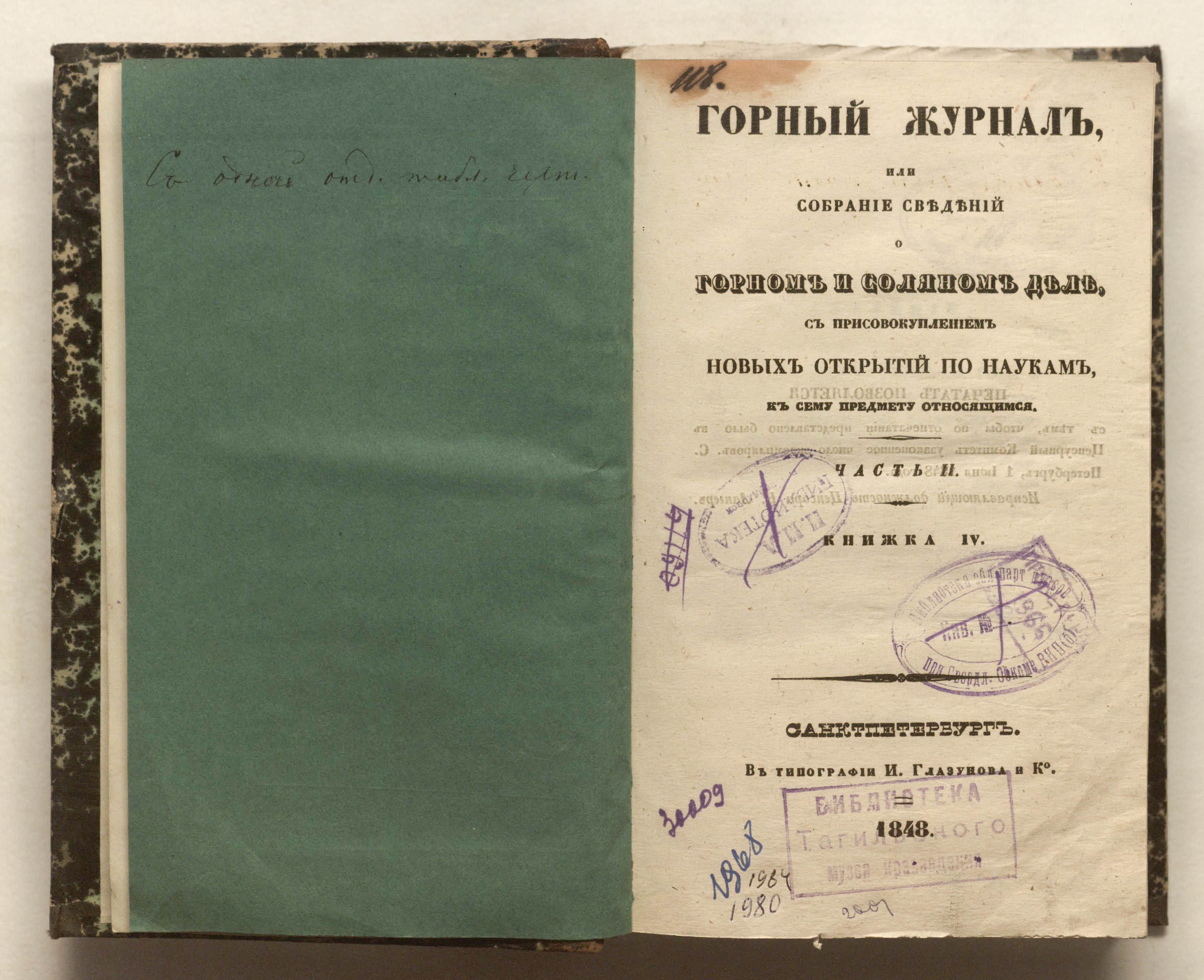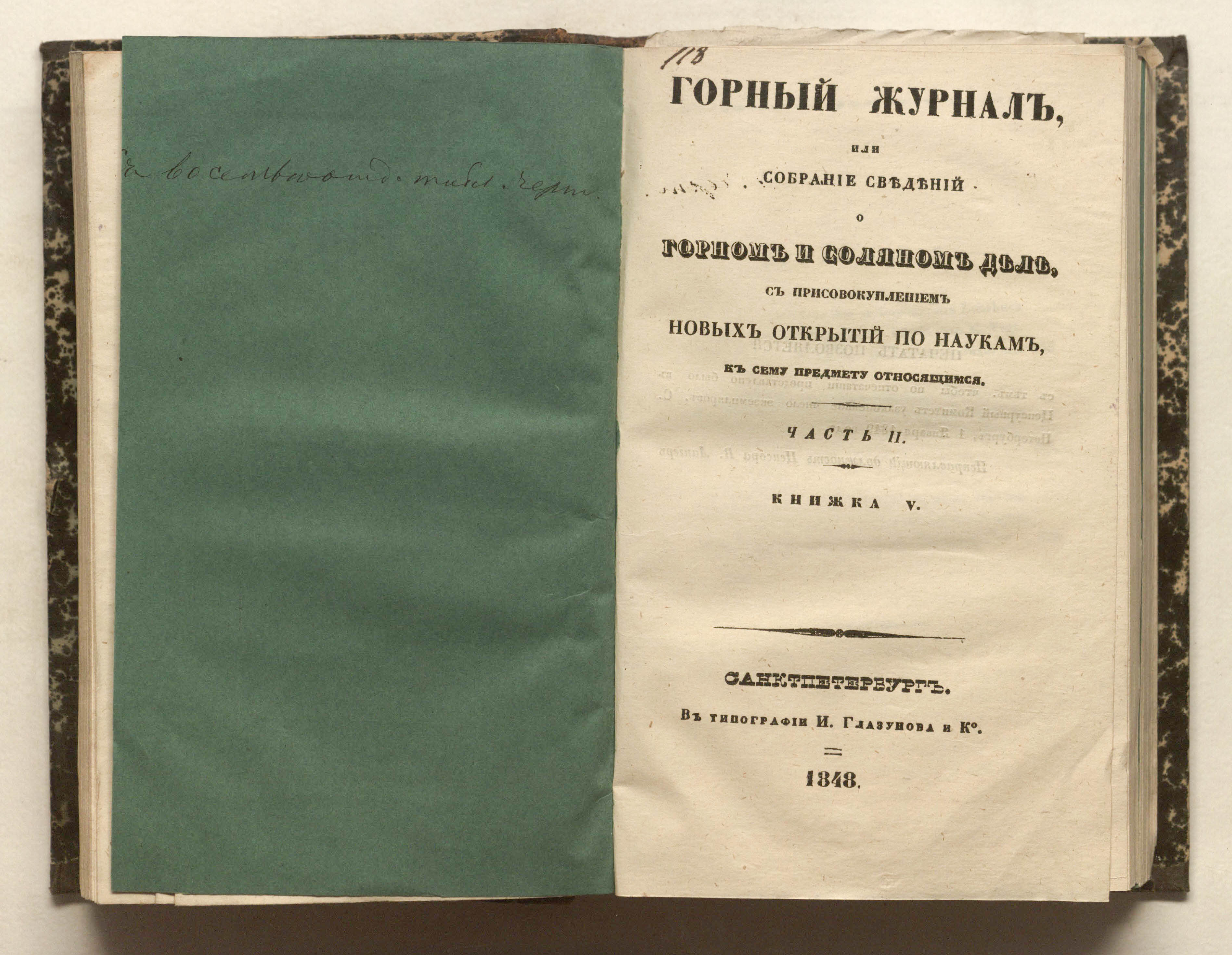 Горный журнал или Собрание сведений о горном и соляном деле, С присовокуплением новых открытий по наукам, к сему предмету относящимся. - Санкт-Петербург : Печатано в Военной типографии Главнаго штаба его императорскаго величества ; в типографии Экспедиции заготовления государственных бумаг ; в типографии Карла Крайя ; в типографии императорской академии наук, 1825 - 1918.