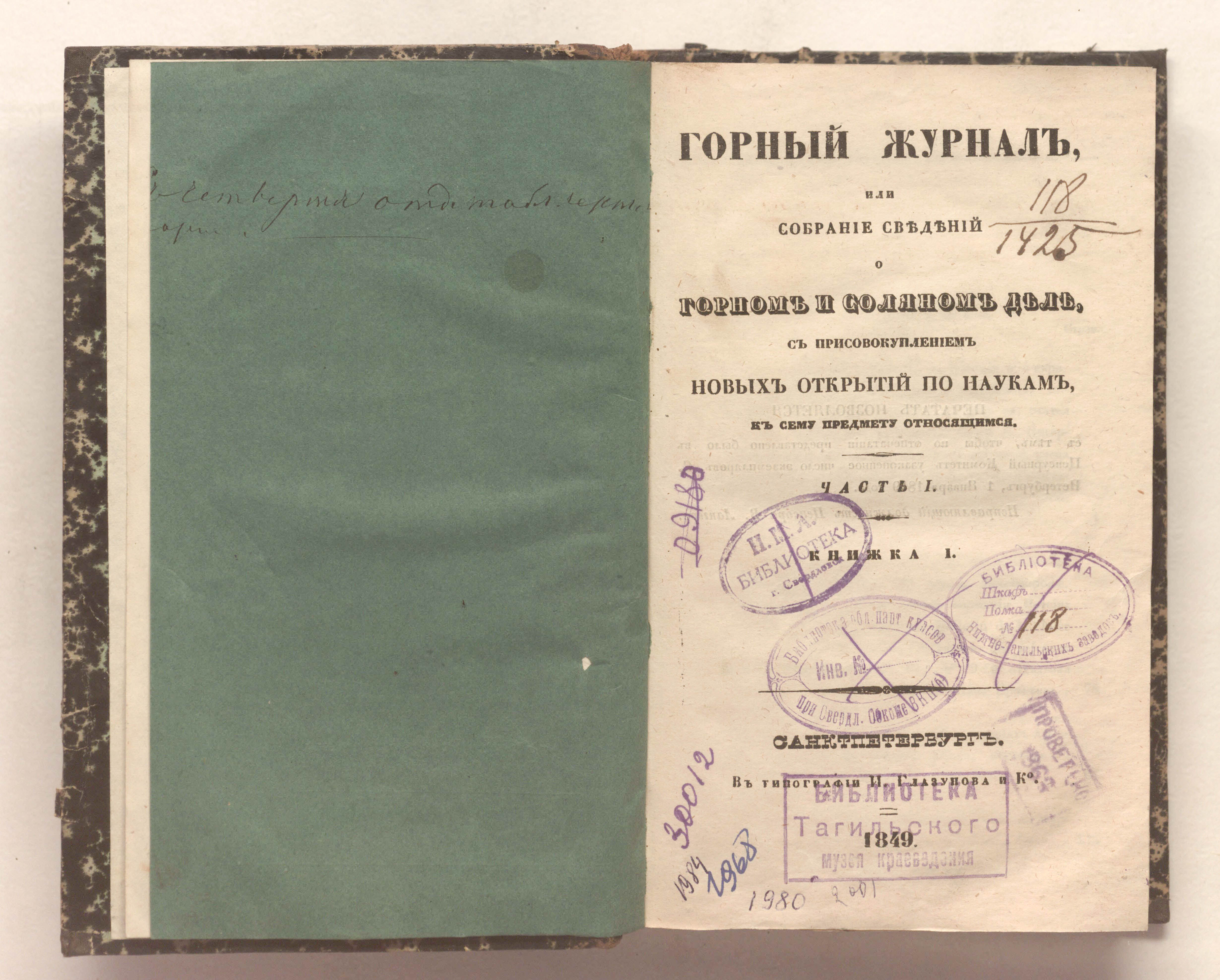 Горный журнал или Собрание сведений о горном и соляном деле, С присовокуплением новых открытий по наукам, к сему предмету относящимся. - Санкт-Петербург : Печатано в Военной типографии Главнаго штаба его императорскаго величества ; в типографии Экспедиции заготовления государственных бумаг ; в типографии Карла Крайя ; в типографии императорской академии наук, 1825 - 1918.
