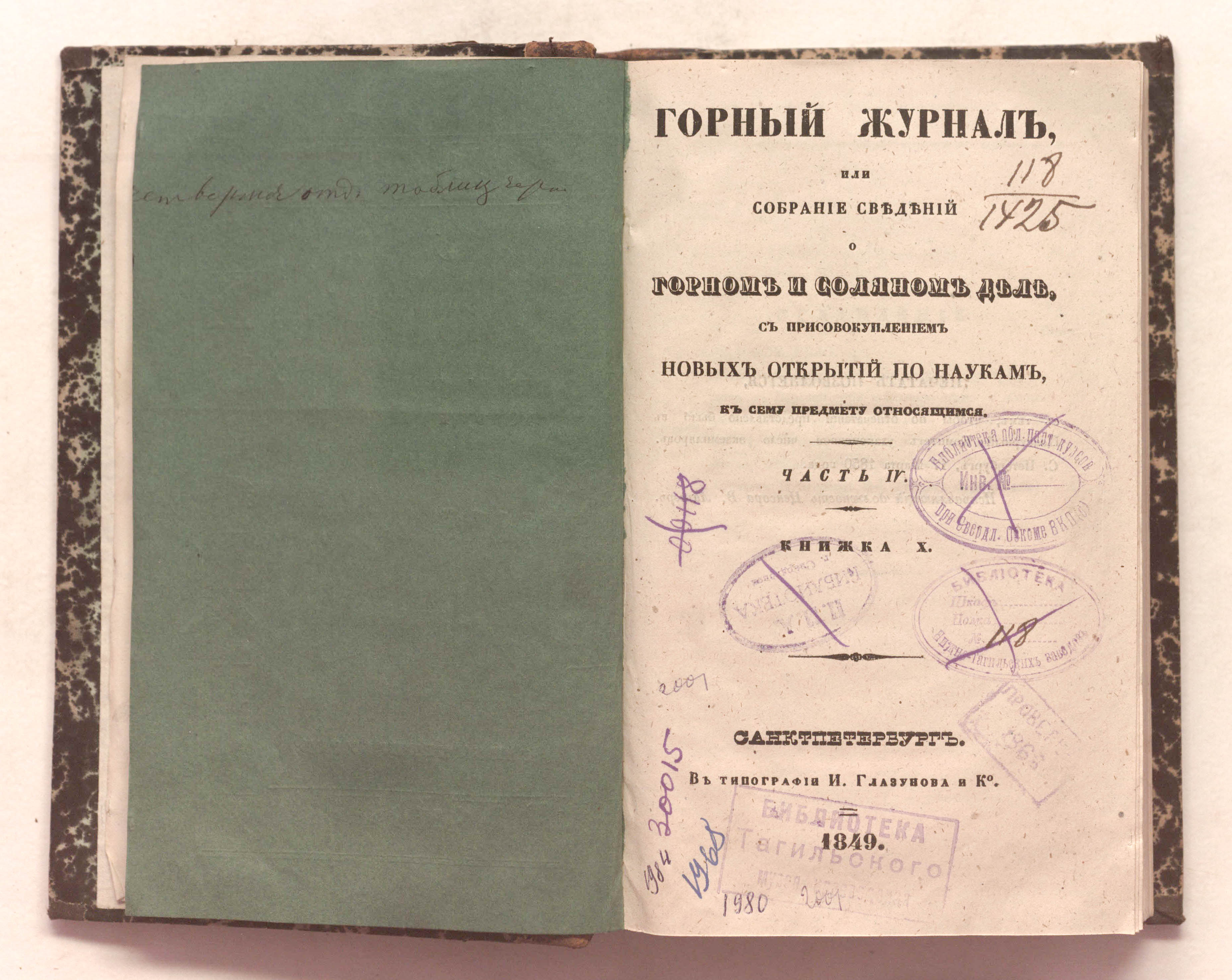 Горный журнал или Собрание сведений о горном и соляном деле, С присовокуплением новых открытий по наукам, к сему предмету относящимся. - Санкт-Петербург : Печатано в Военной типографии Главнаго штаба его императорскаго величества ; в типографии Экспедиции заготовления государственных бумаг ; в типографии Карла Крайя ; в типографии императорской академии наук, 1825 - 1918.