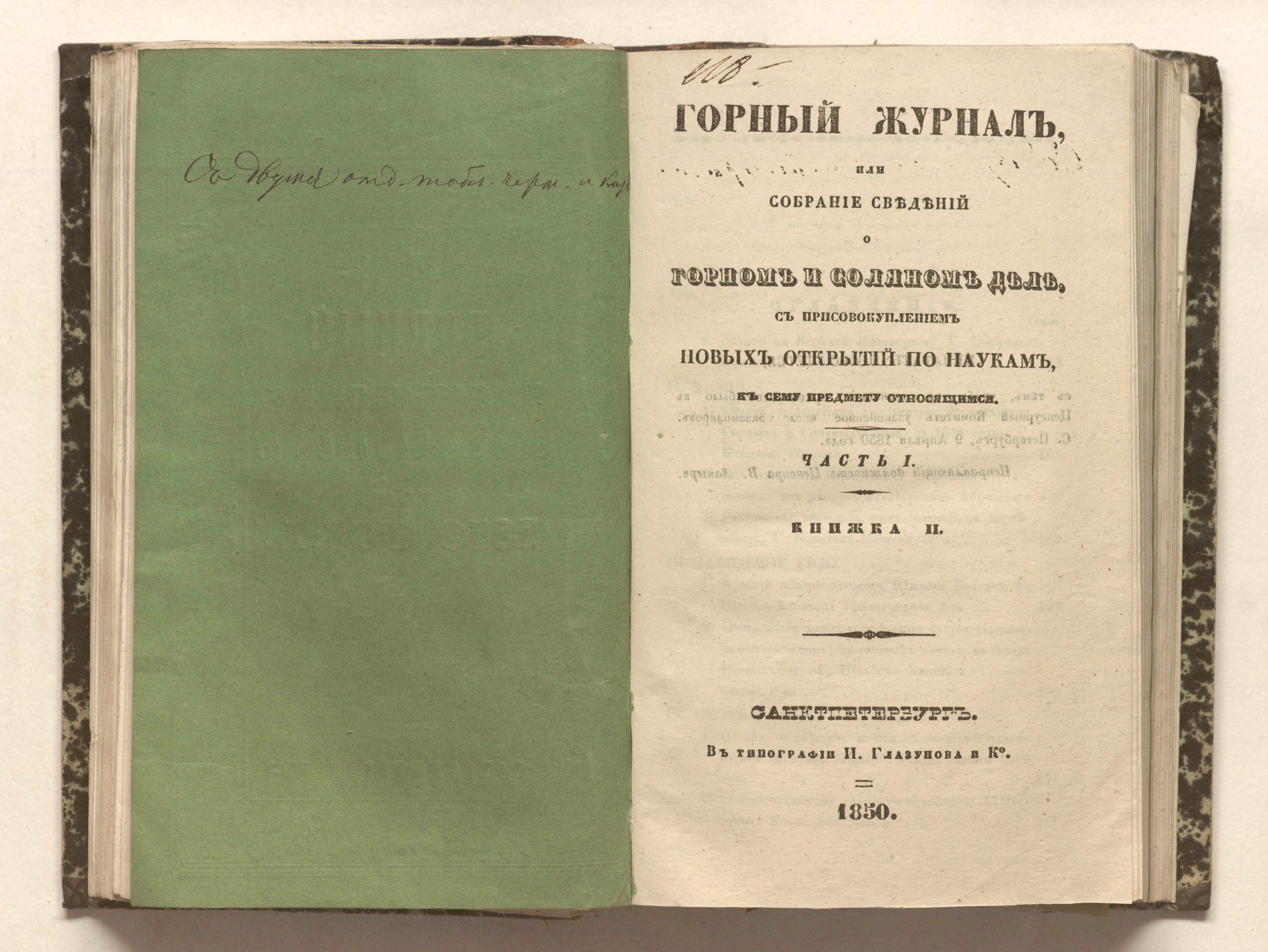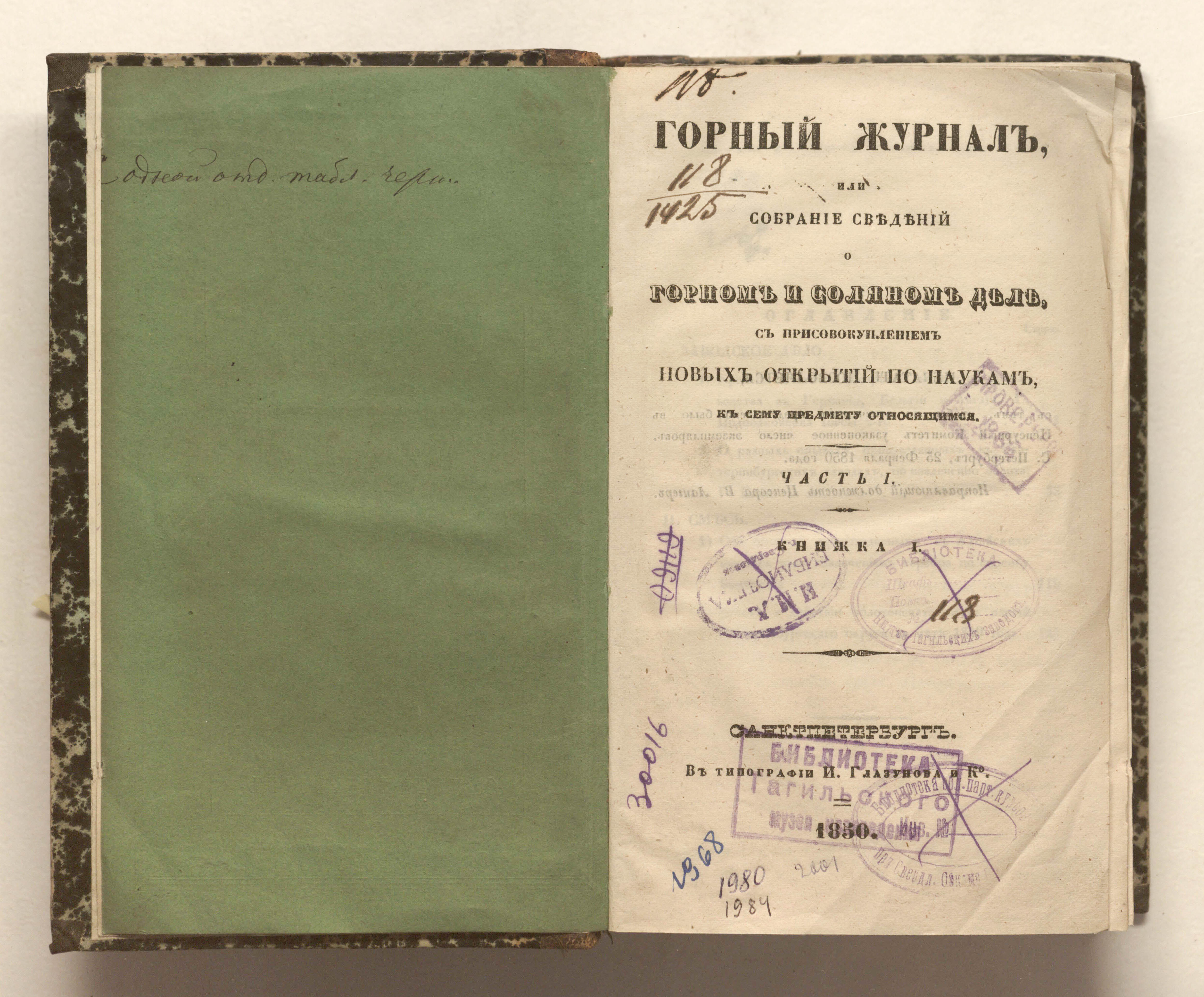 Горный журнал или Собрание сведений о горном и соляном деле, С присовокуплением новых открытий по наукам, к сему предмету относящимся. - Санкт-Петербург : Печатано в Военной типографии Главнаго штаба его императорскаго величества ; в типографии Экспедиции заготовления государственных бумаг ; в типографии Карла Крайя ; в типографии императорской академии наук, 1825 - 1918.