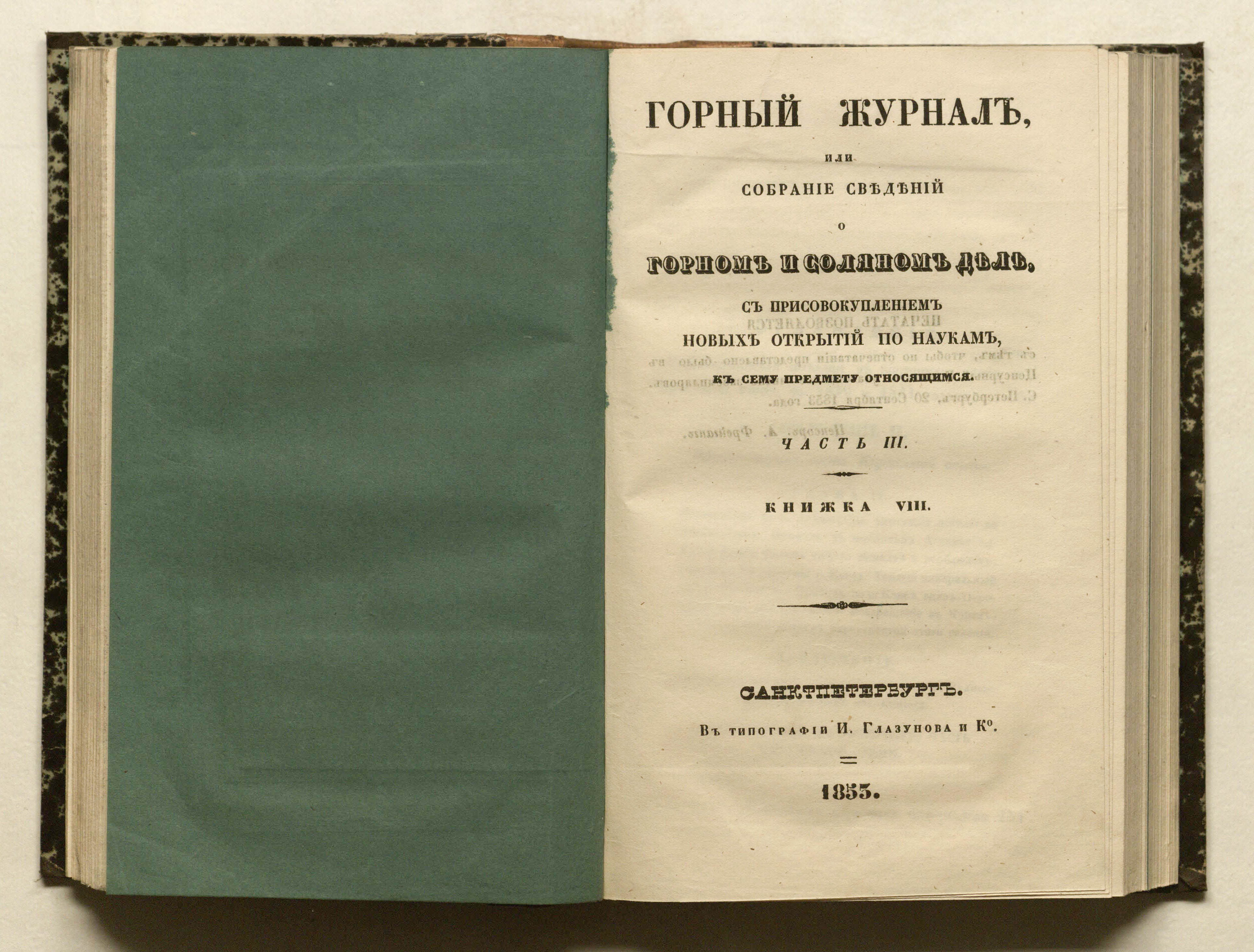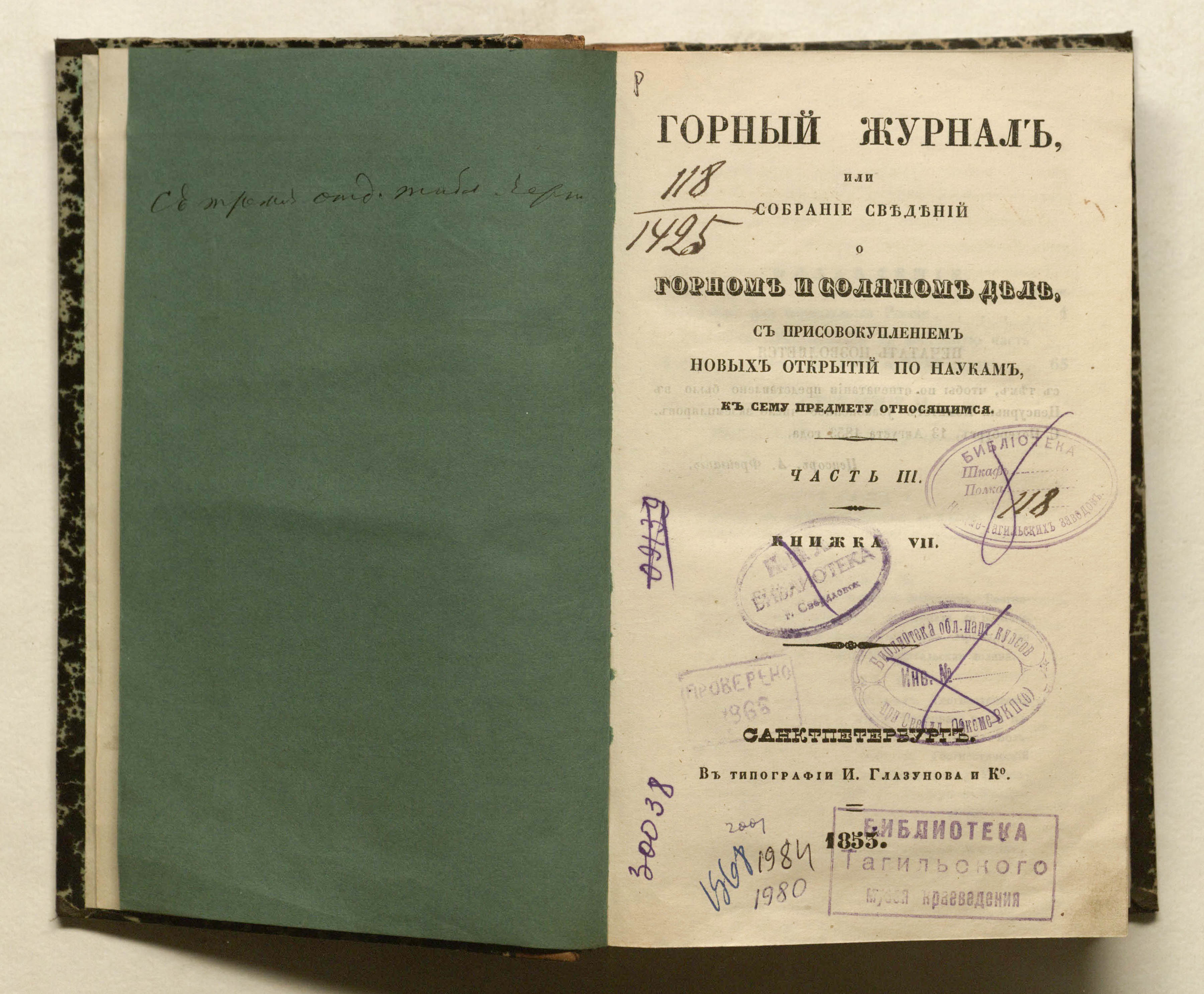Горный журнал или Собрание сведений о горном и соляном деле, С присовокуплением новых открытий по наукам, к сему предмету относящимся. – Санкт-Петербург : печатано в Военной типографии Главнаго штаба его императорскаго величества ; в типографии Экспедиции заготовления государственных бумаг ; в типографии Карла Крайя ; в типографии императорской академии наук, 1825 - 1918.