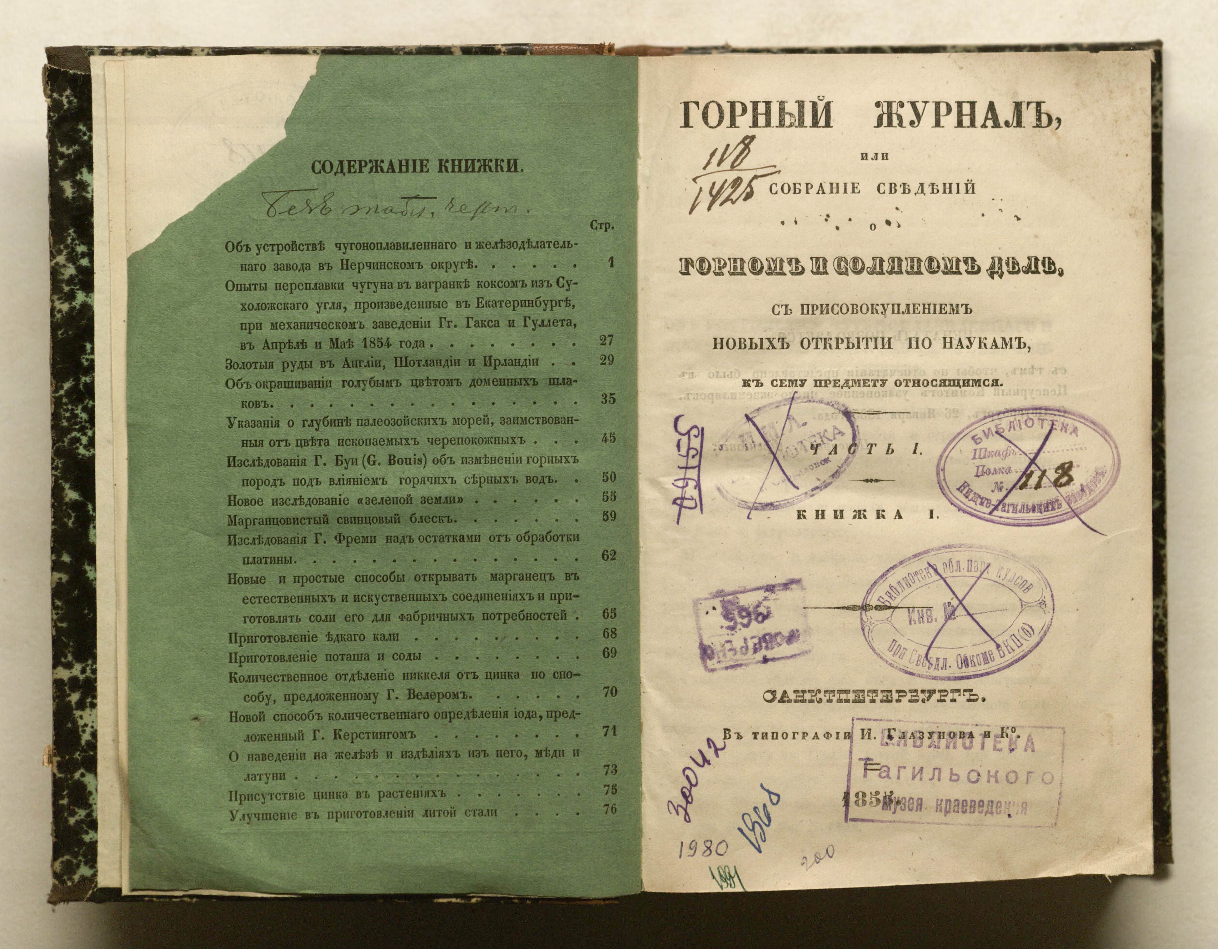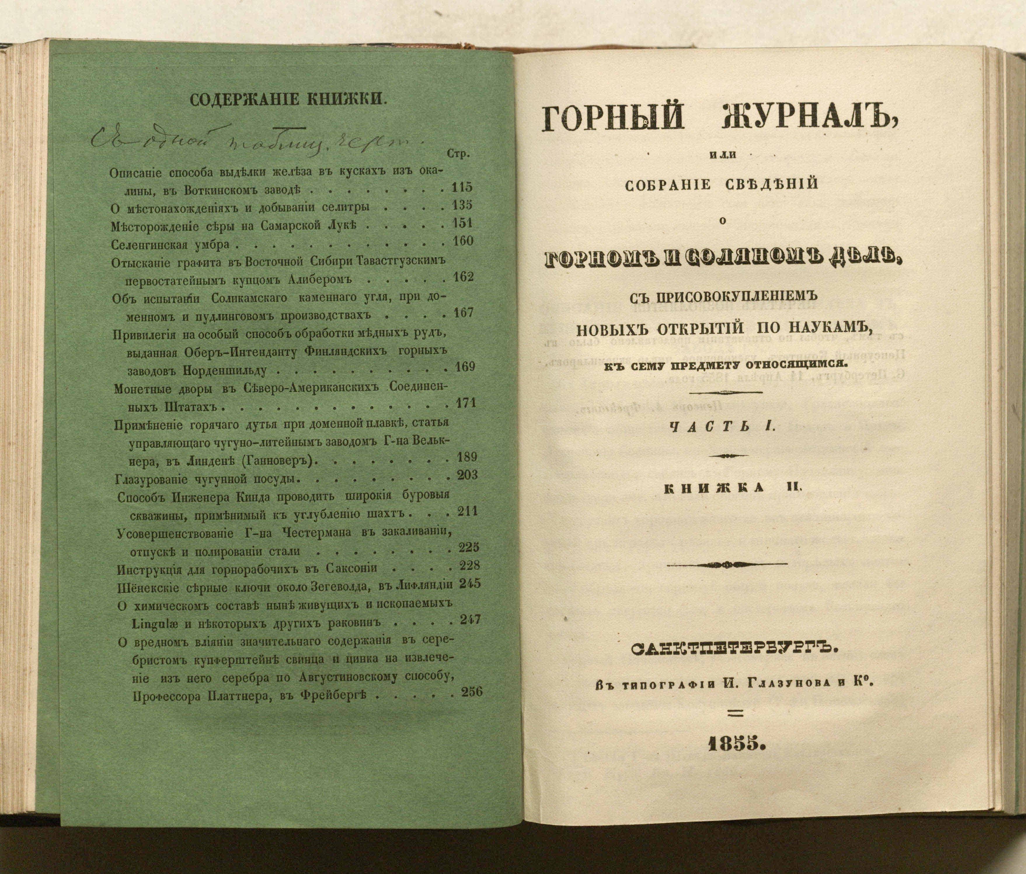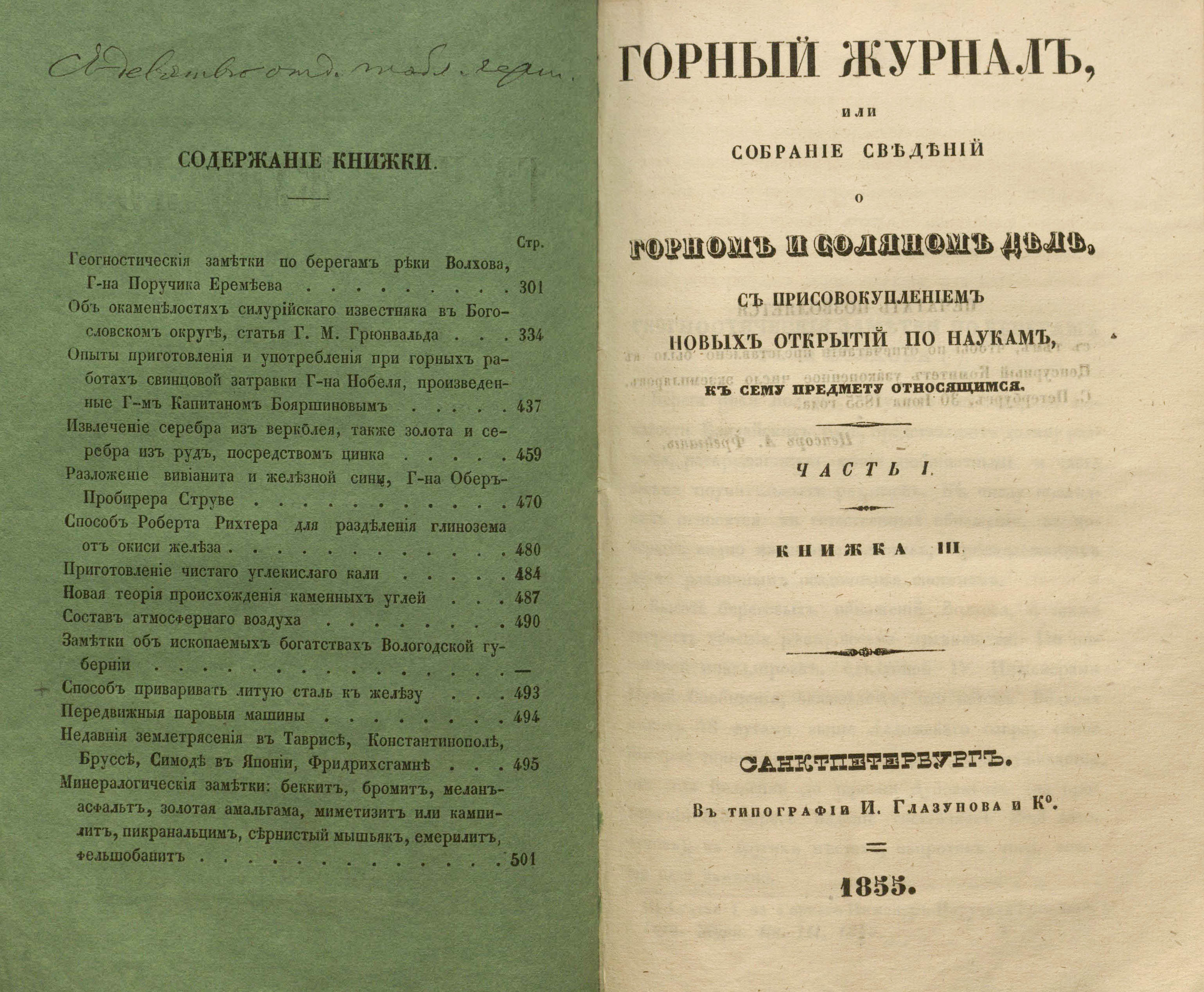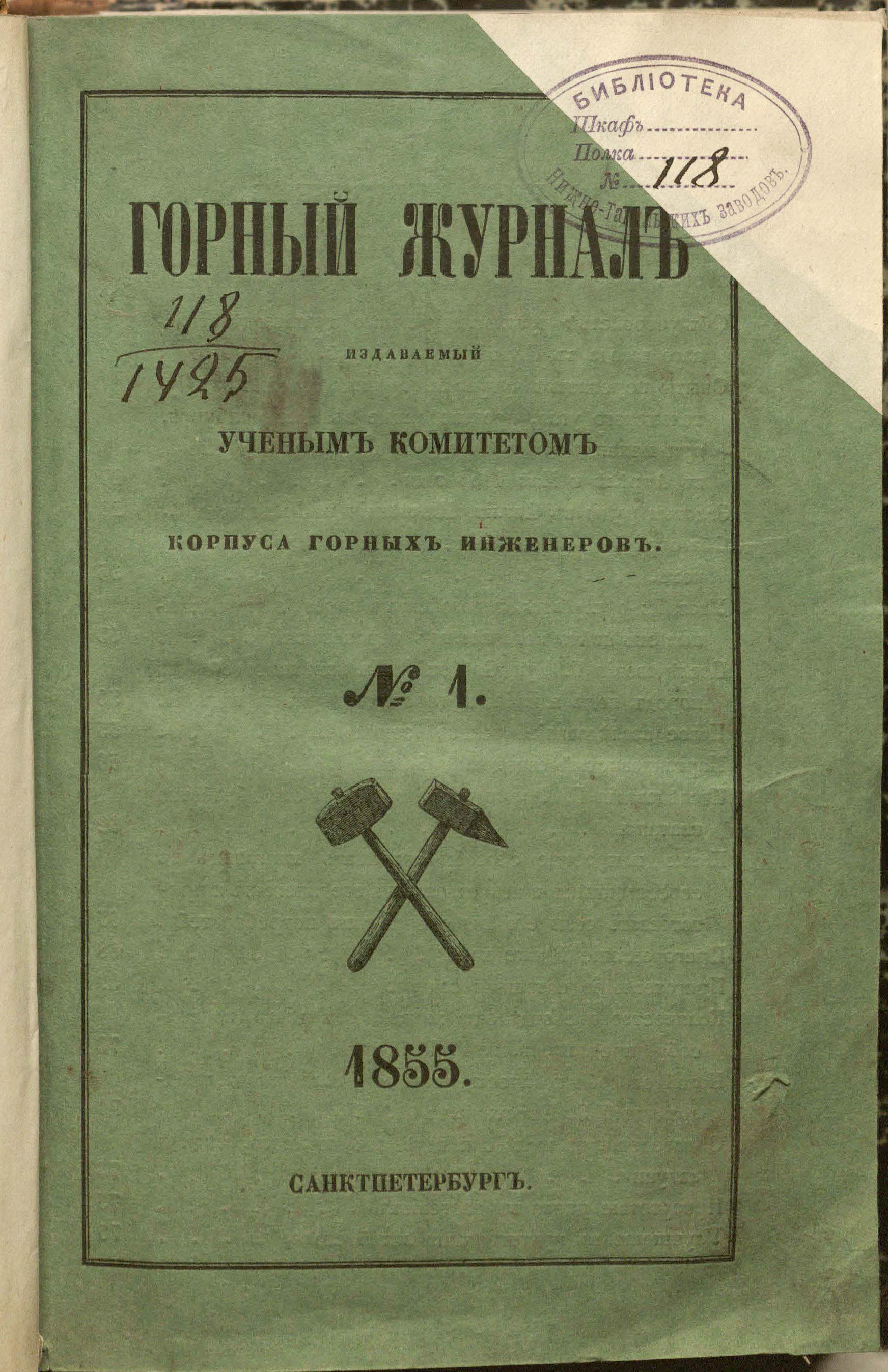 Горный журнал или Собрание сведений о горном и соляном деле, С присовокуплением новых открытий по наукам, к сему предмету относящимся. – Санкт-Петербург : печатано в Военной типографии Главнаго штаба его императорскаго величества ; в типографии Экспедиции заготовления государственных бумаг ; в типографии Карла Крайя ; в типографии императорской академии наук, 1825 - 1918.
