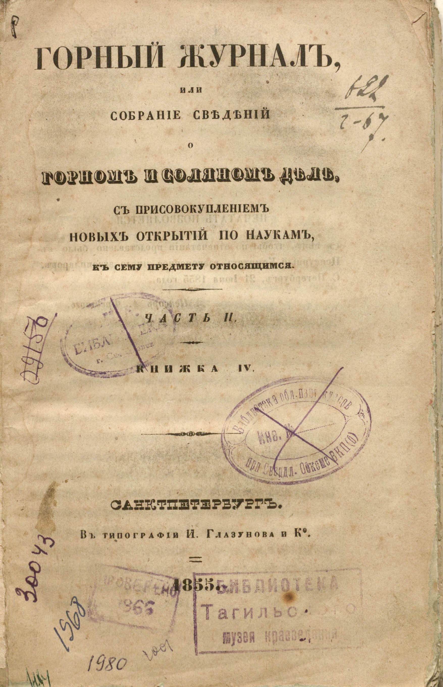 Горный журнал или Собрание сведений о горном и соляном деле, С присовокуплением новых открытий по наукам, к сему предмету относящимся. – Санкт-Петербург : печатано в Военной типографии Главнаго штаба его императорскаго величества ; в типографии Экспедиции заготовления государственных бумаг ; в типографии Карла Крайя ; в типографии императорской академии наук, 1825 - 1918.