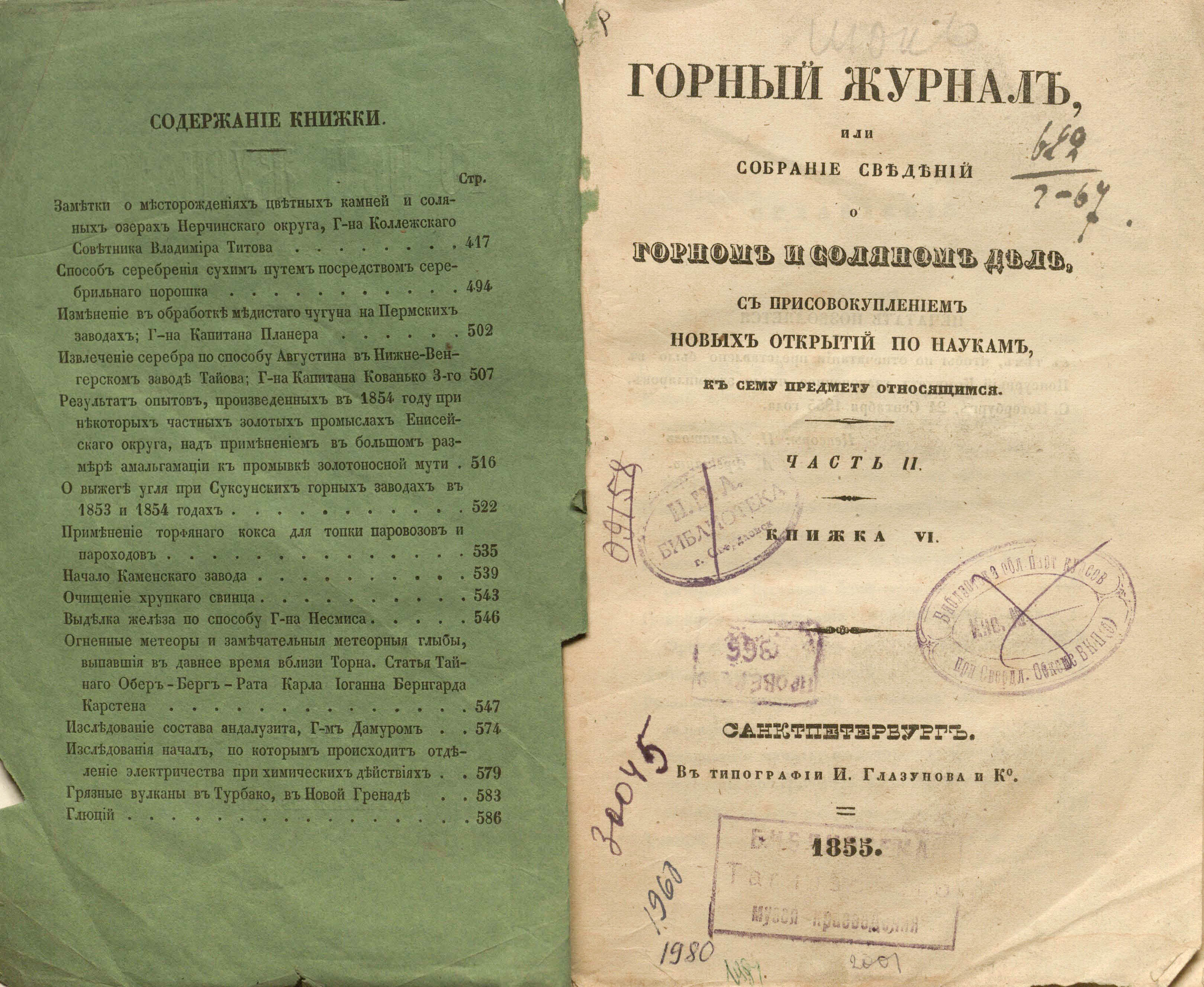 Горный журнал или Собрание сведений о горном и соляном деле, С присовокуплением новых открытий по наукам, к сему предмету относящимся. – Санкт-Петербург : печатано в Военной типографии Главнаго штаба его императорскаго величества ; в типографии Экспедиции заготовления государственных бумаг ; в типографии Карла Крайя ; в типографии императорской академии наук, 1825 - 1918.