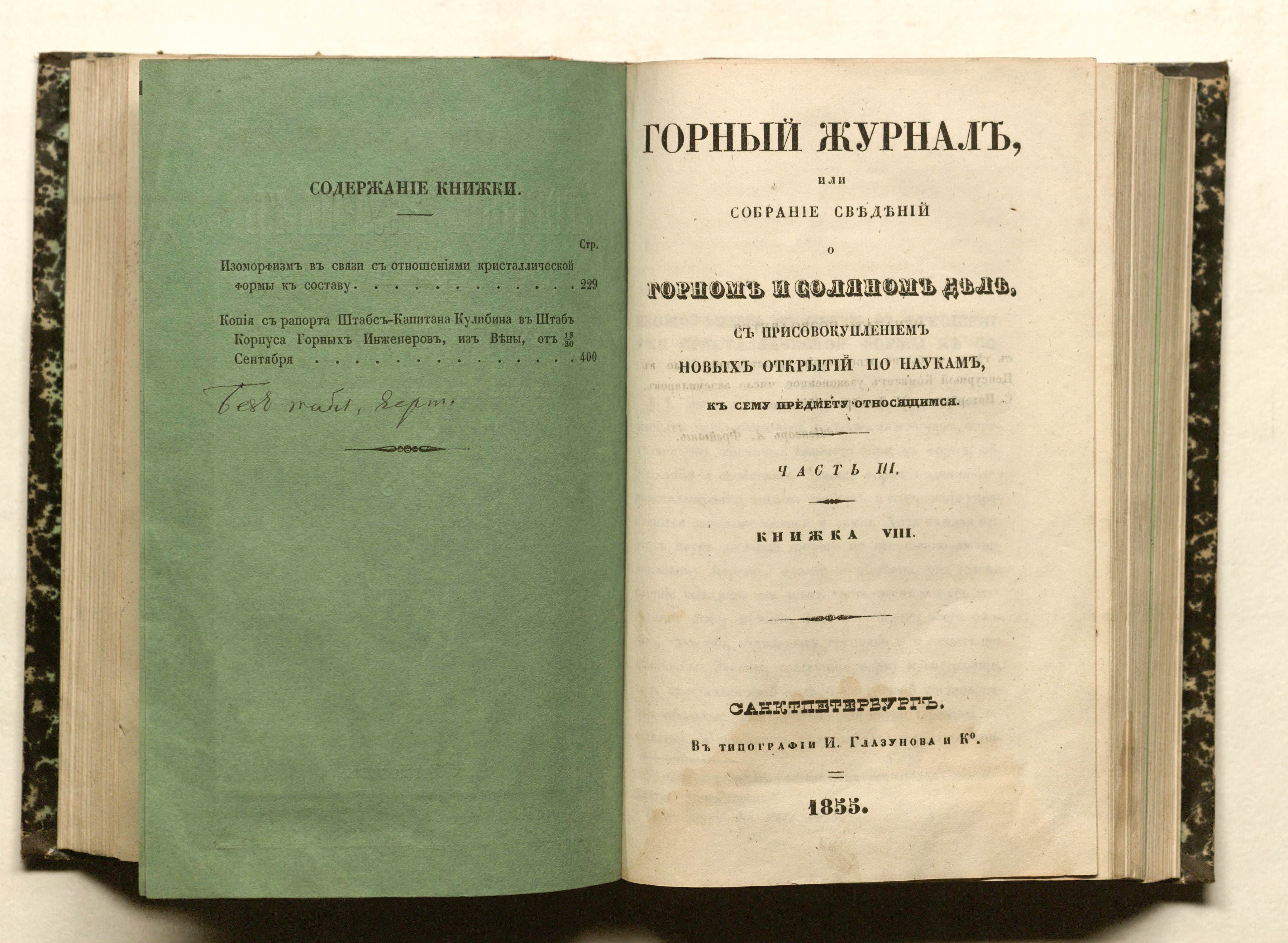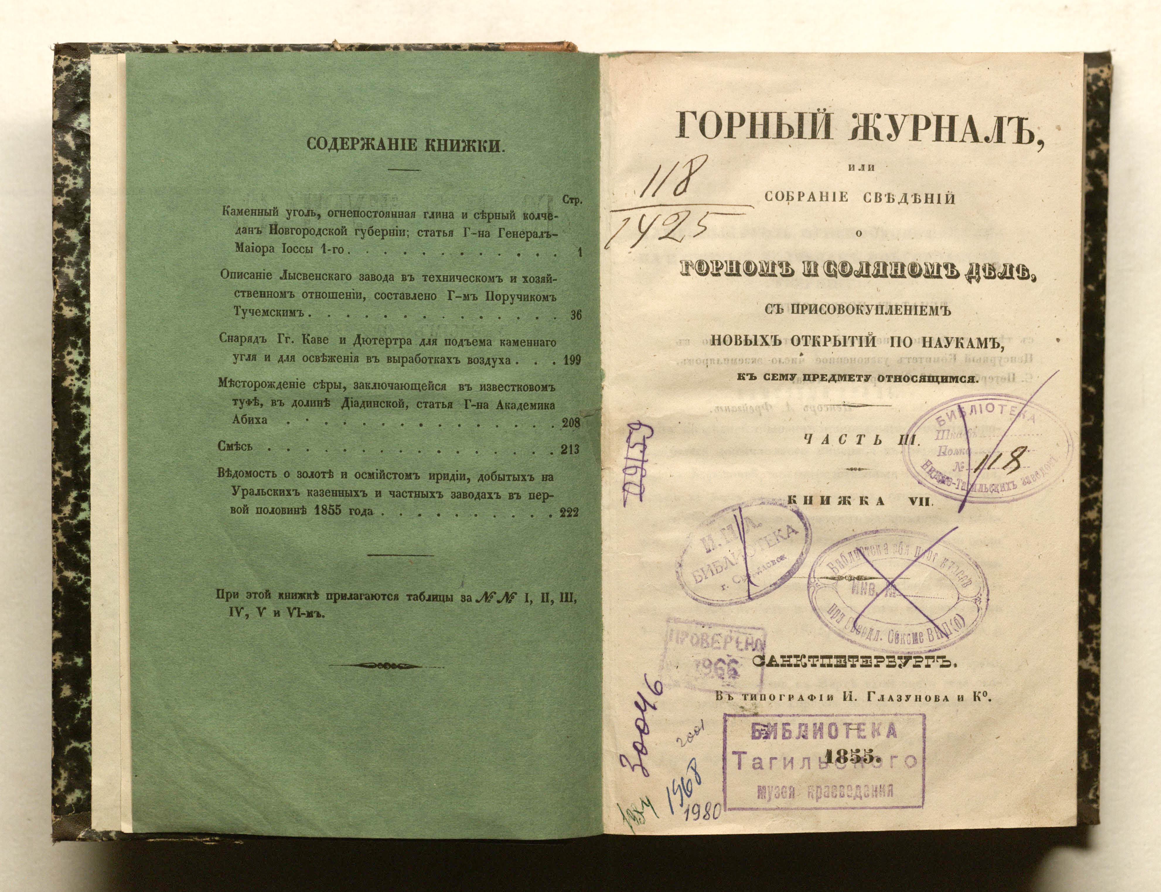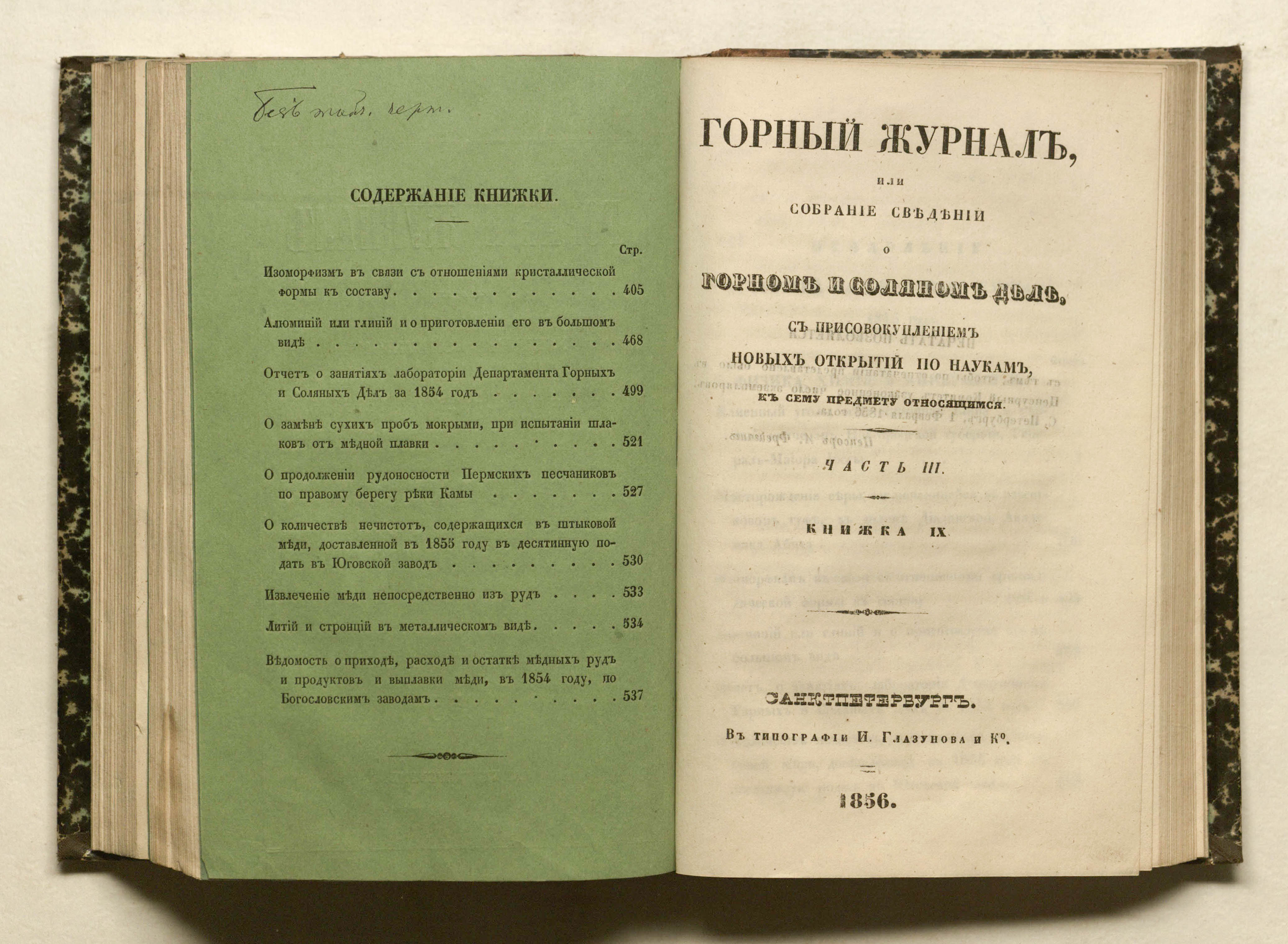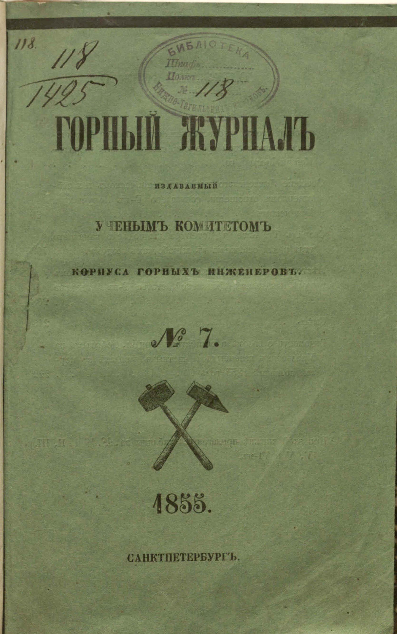 Горный журнал или Собрание сведений о горном и соляном деле, С присовокуплением новых открытий по наукам, к сему предмету относящимся. – Санкт-Петербург : печатано в Военной типографии Главнаго штаба его императорскаго величества ; в типографии Экспедиции заготовления государственных бумаг ; в типографии Карла Крайя ; в типографии императорской академии наук, 1825 - 1918.