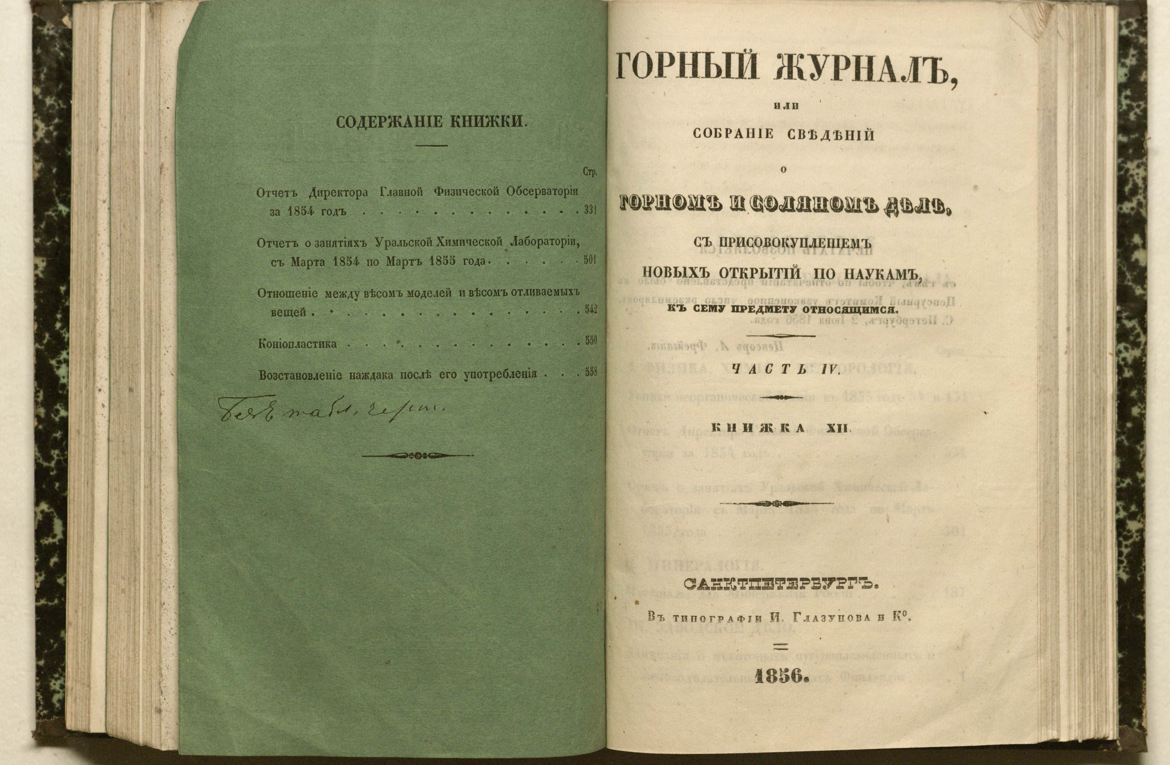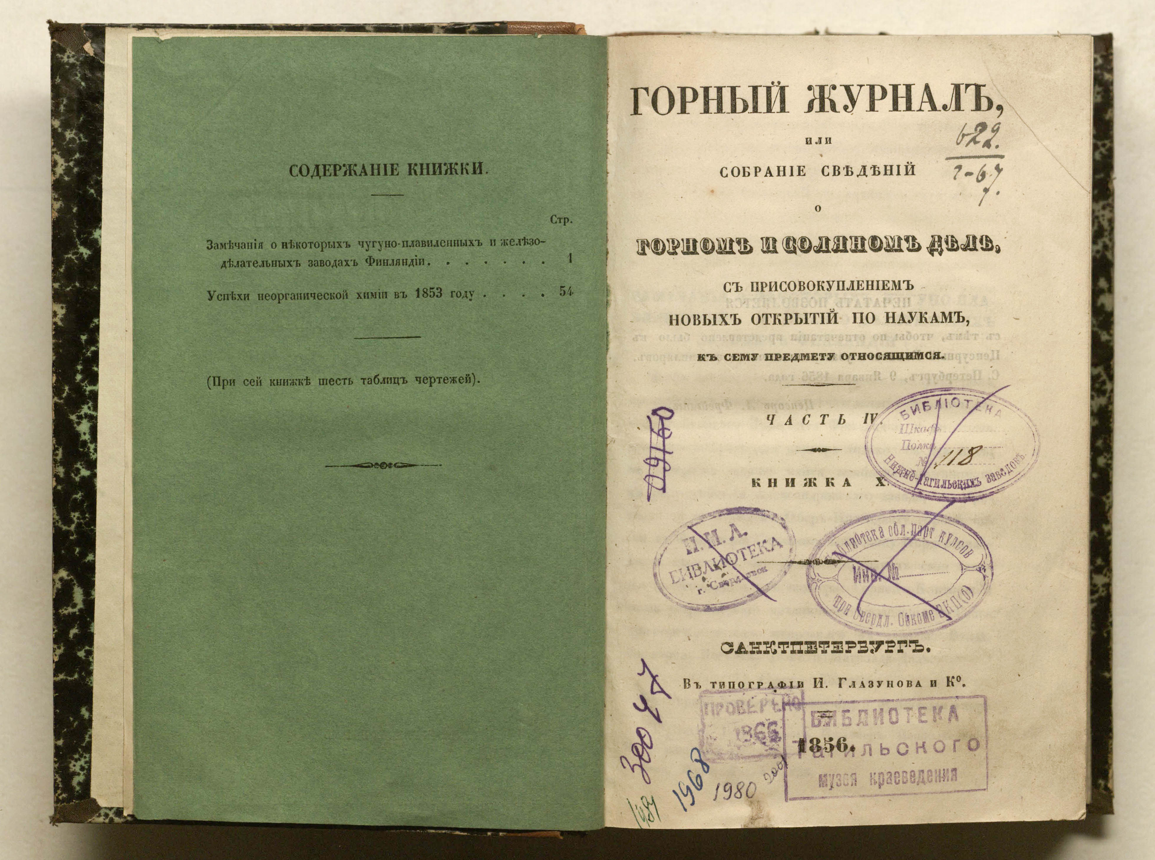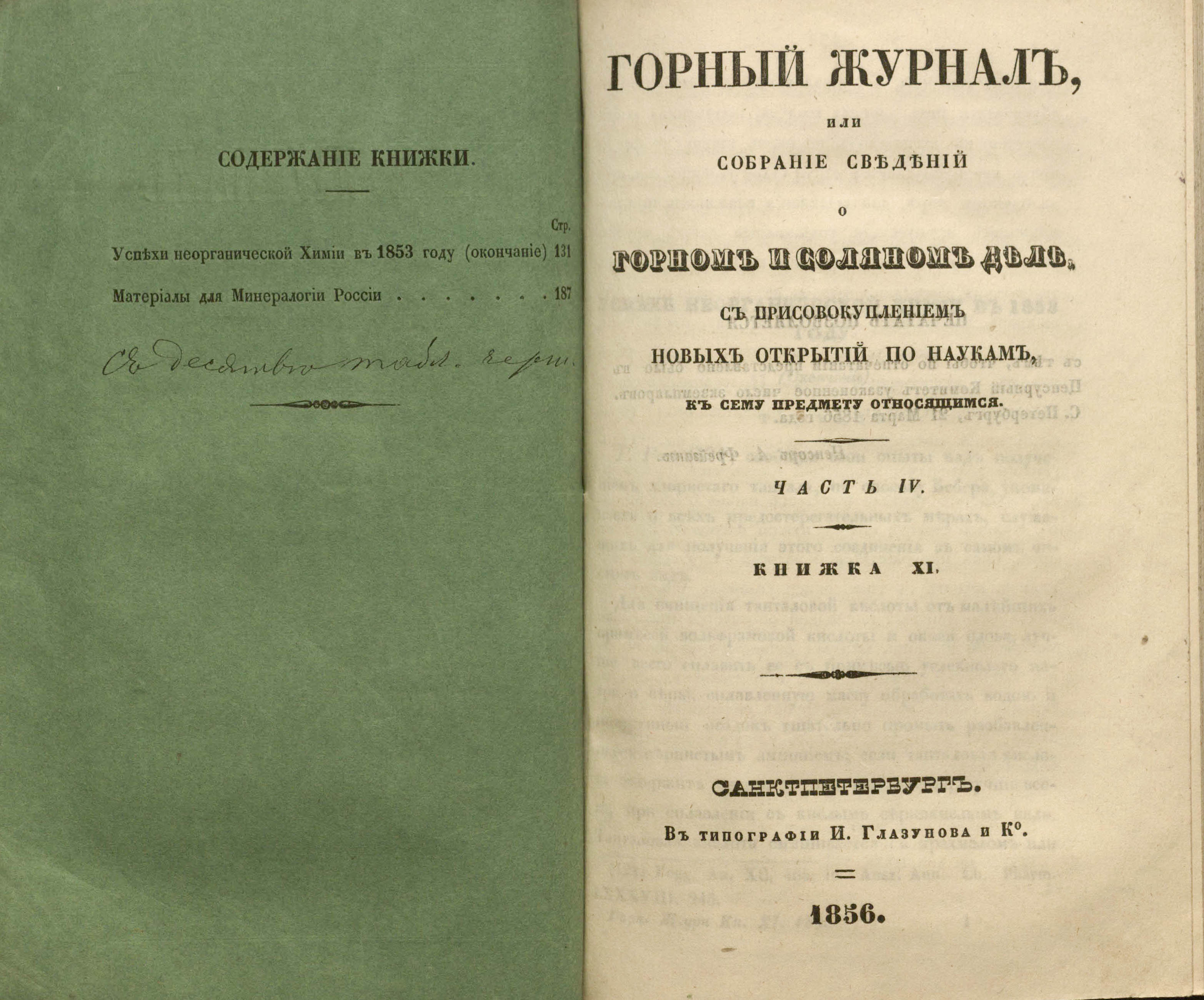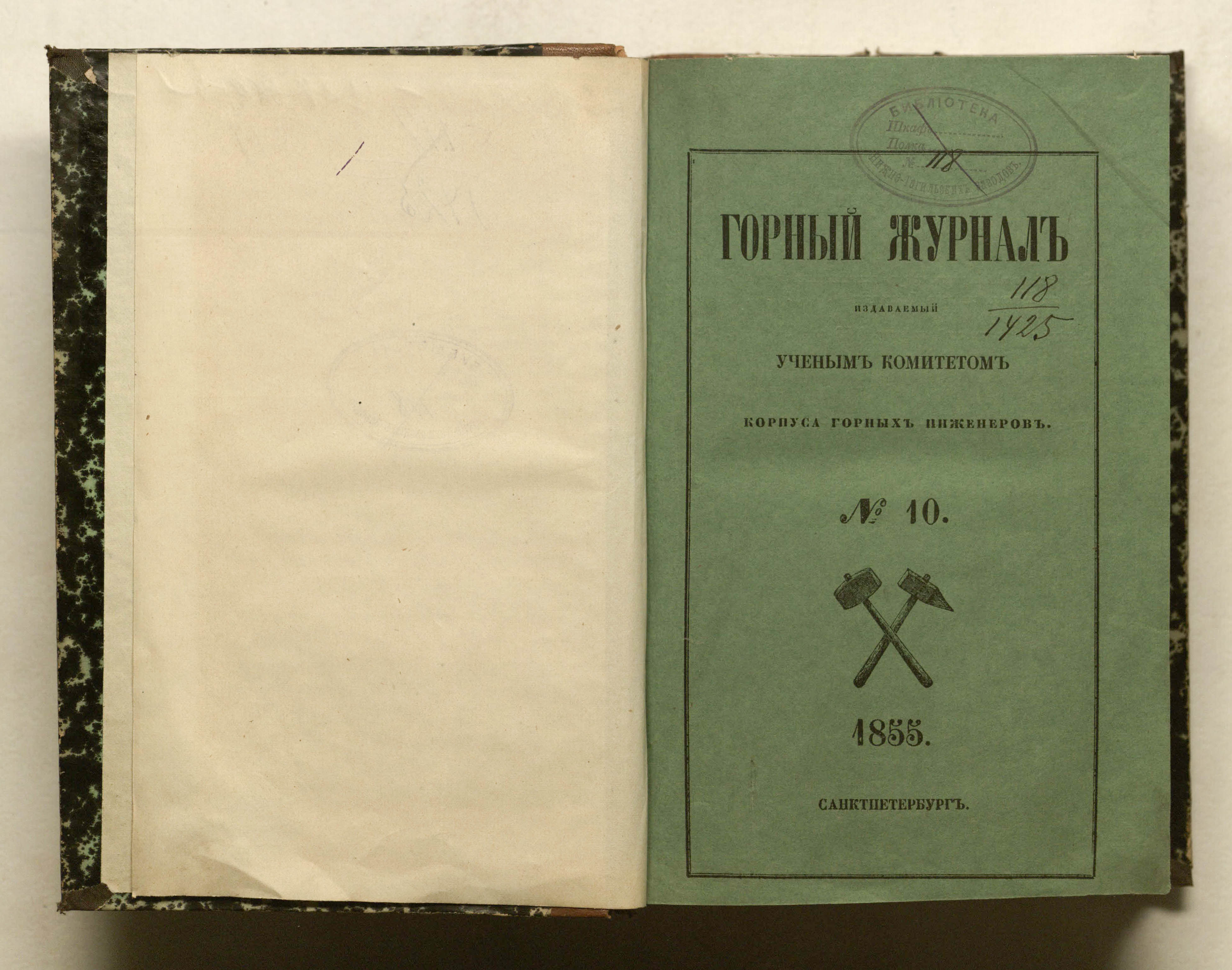 Горный журнал или Собрание сведений о горном и соляном деле, С присовокуплением новых открытий по наукам, к сему предмету относящимся. – Санкт-Петербург : печатано в Военной типографии Главнаго штаба его императорскаго величества ; в типографии Экспедиции заготовления государственных бумаг ; в типографии Карла Крайя ; в типографии императорской академии наук, 1825 - 1918.