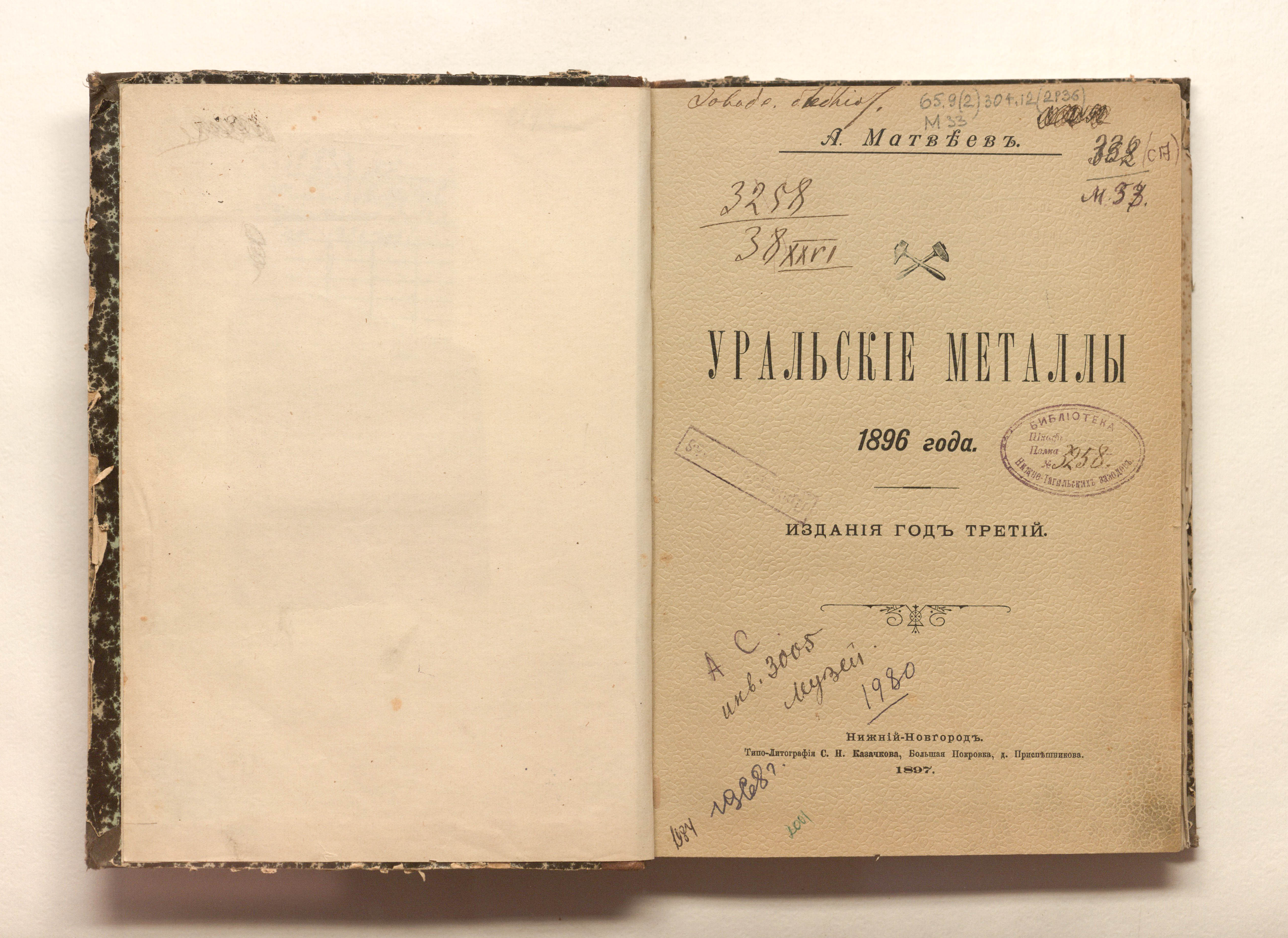 Матвеев, А. П. Уральские металлы 1896 года / А. П. Матвеев. — Нижний Новгород : Типолитография С. Н. Казачкова, 1897. — XVIII, [8], 90, 261 с. : 4 л. ил., табл. ; 25х18 см.