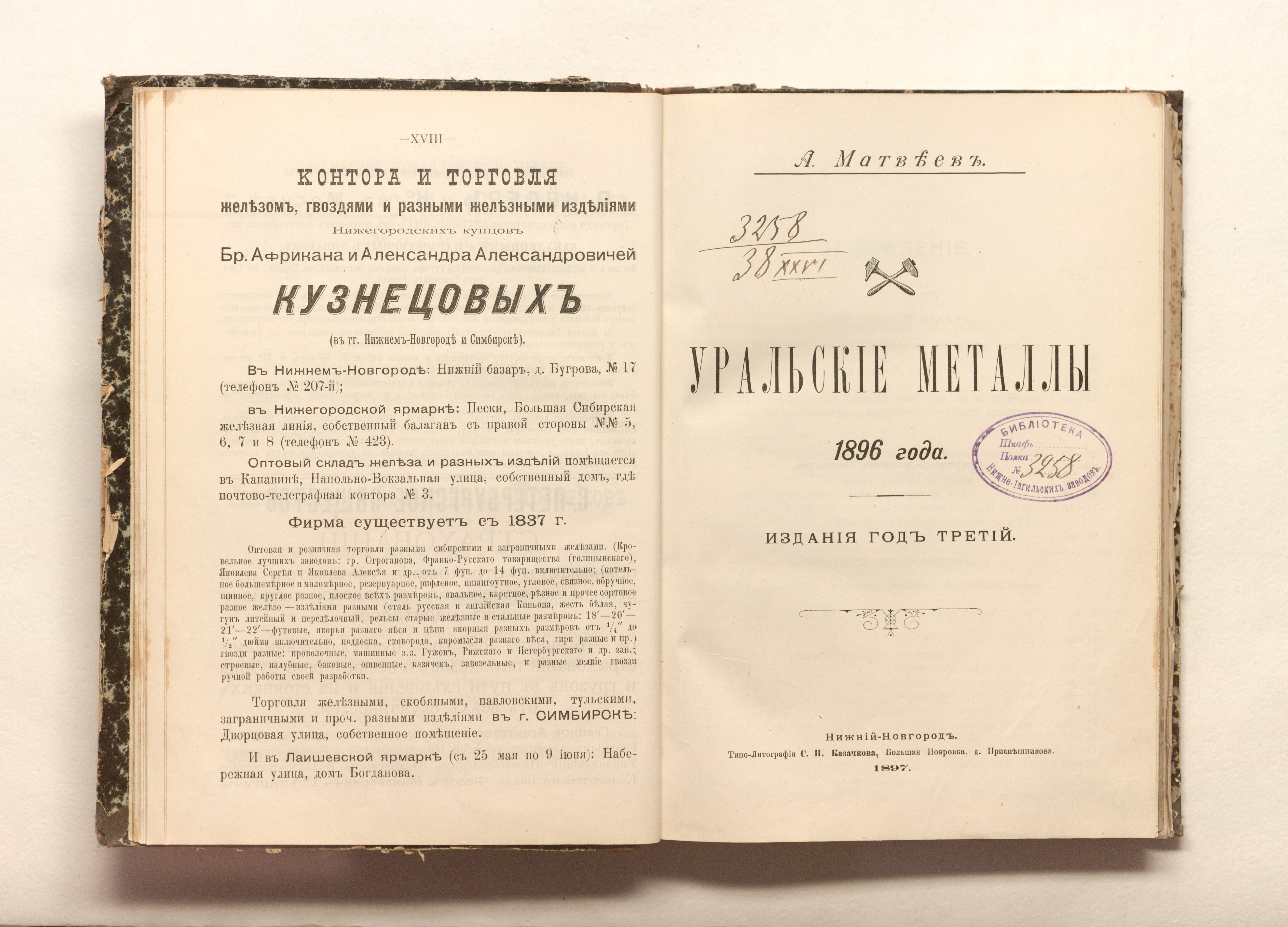 «Библиотека Нижне-Тагильских заводов. № 3258» (изд. обл., тит. л.).