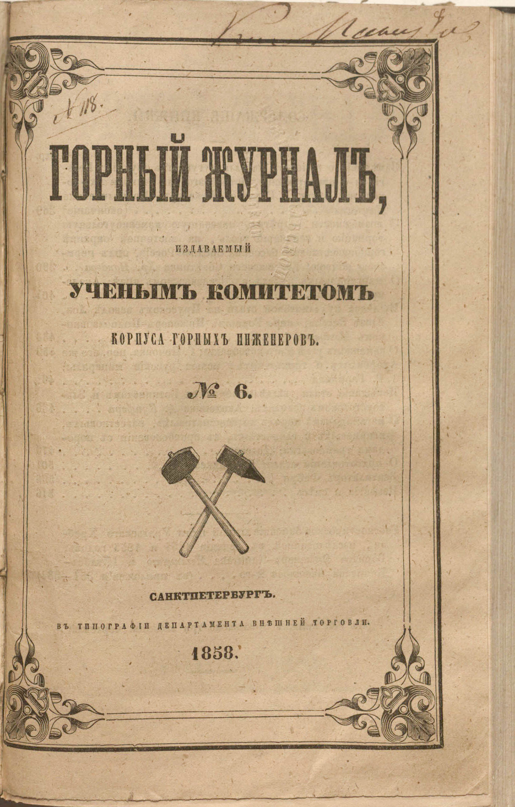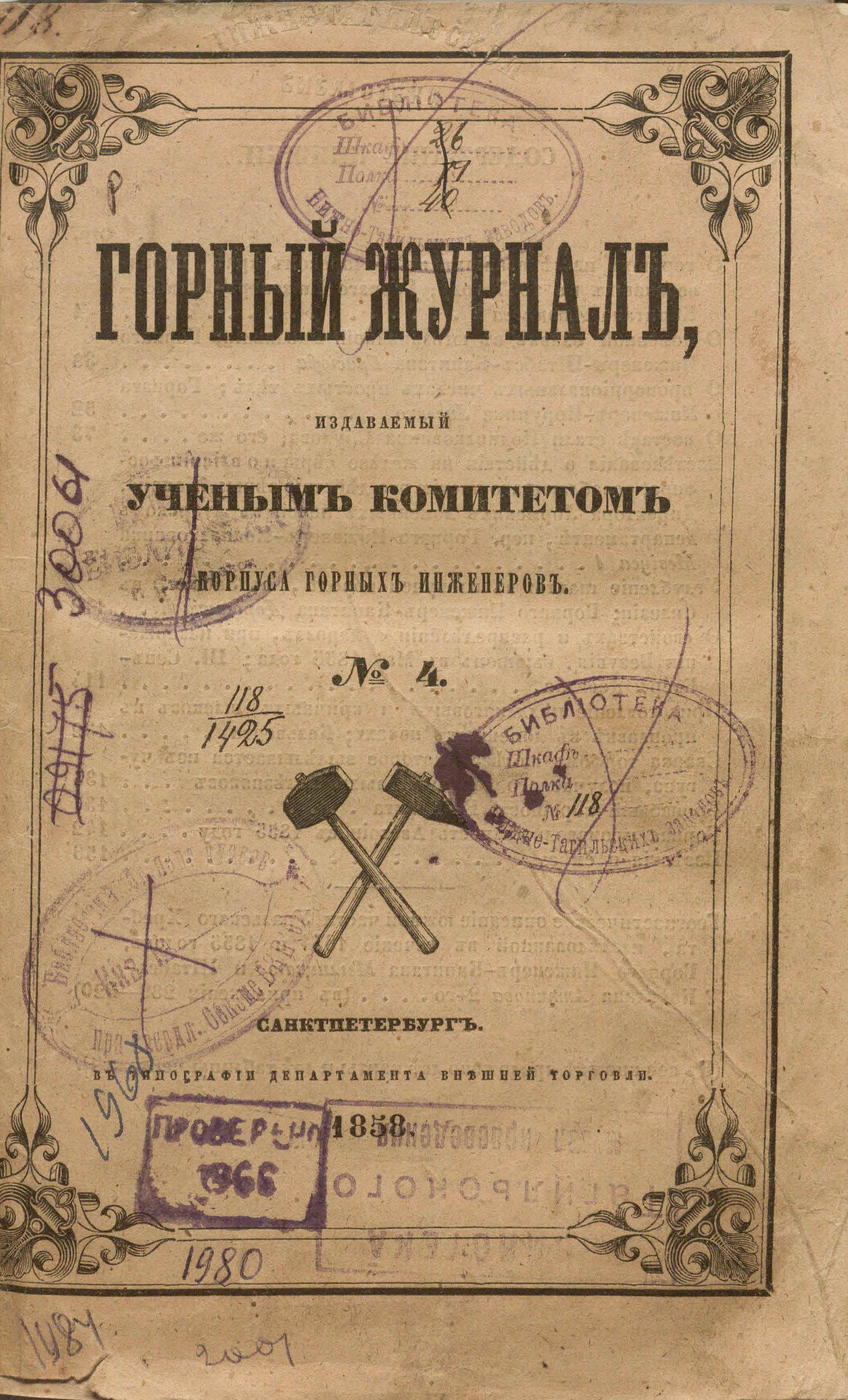 Горный журнал или Собрание сведений о горном и соляном деле, С присовокуплением новых открытий по наукам, к сему предмету относящимся. – Санкт-Петербург : печатано в Военной типографии Главнаго штаба его императорскаго величества ; в типографии Экспедиции заготовления государственных бумаг ; в типографии Карла Крайя ; в типографии императорской академии наук, 1825 - 1918.