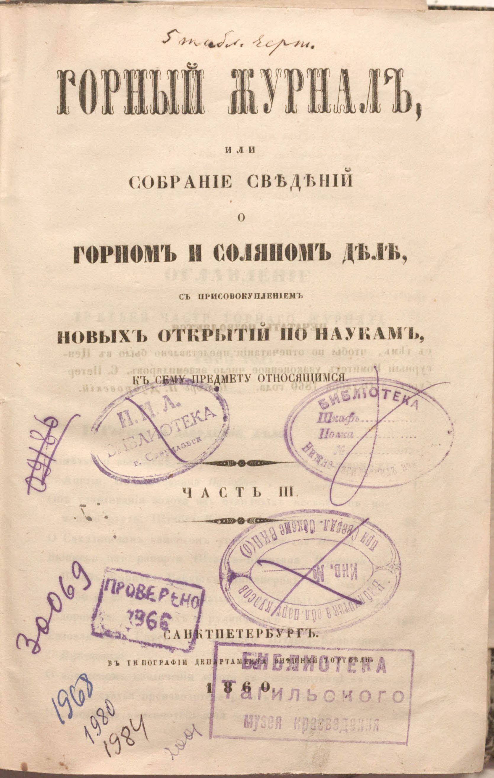 Горный журнал или Собрание сведений о горном и соляном деле, С присовокуплением новых открытий по наукам, к сему предмету относящимся. – Санкт-Петербург : печатано в Военной типографии Главнаго штаба его императорскаго величества ; в типографии Экспедиции заготовления государственных бумаг ; в типографии Карла Крайя ; в типографии императорской академии наук, 1825 - 1918.