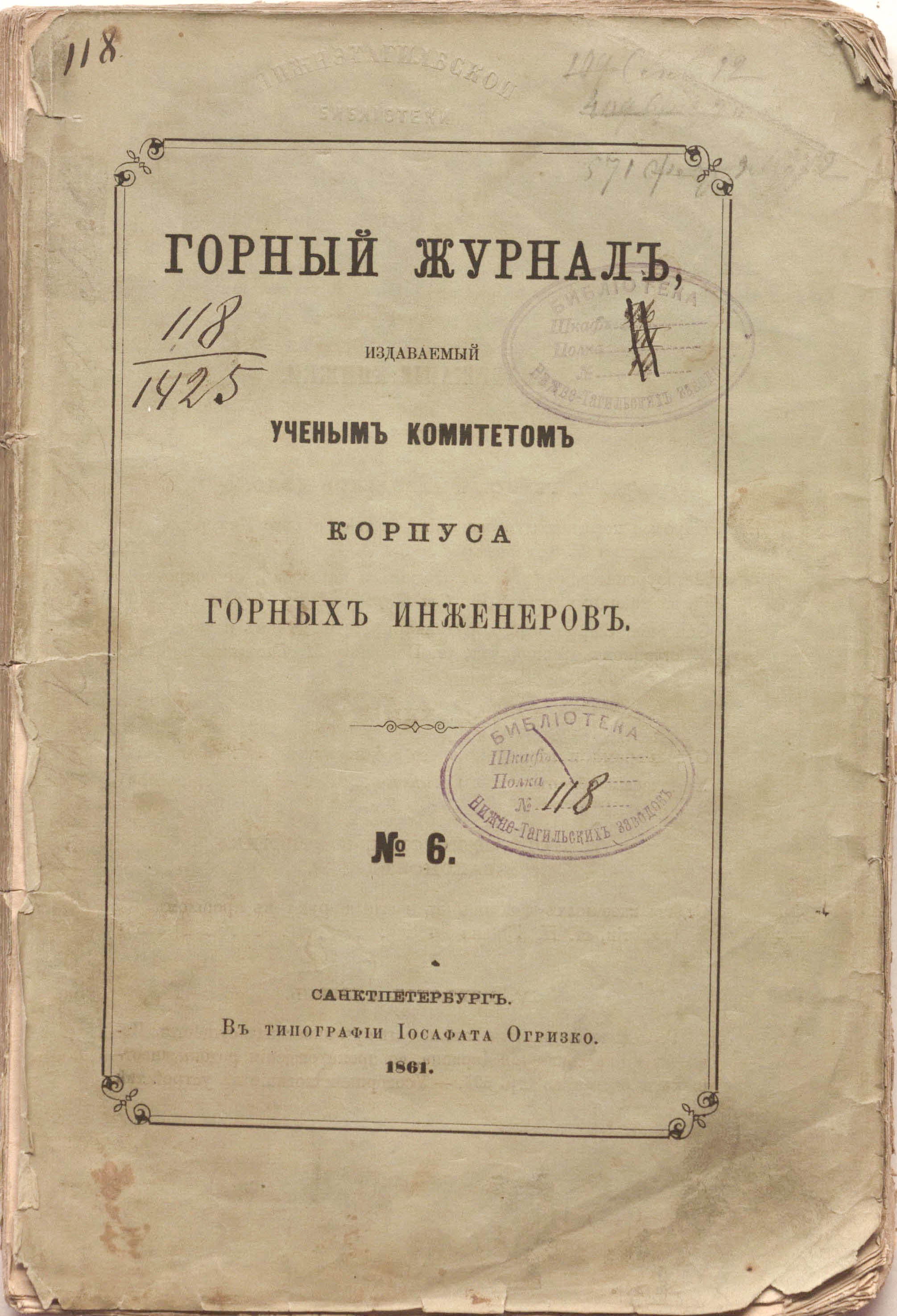 «Библиотека Нижне-Тагильских заводов.» (изд. обл., тит. л.);