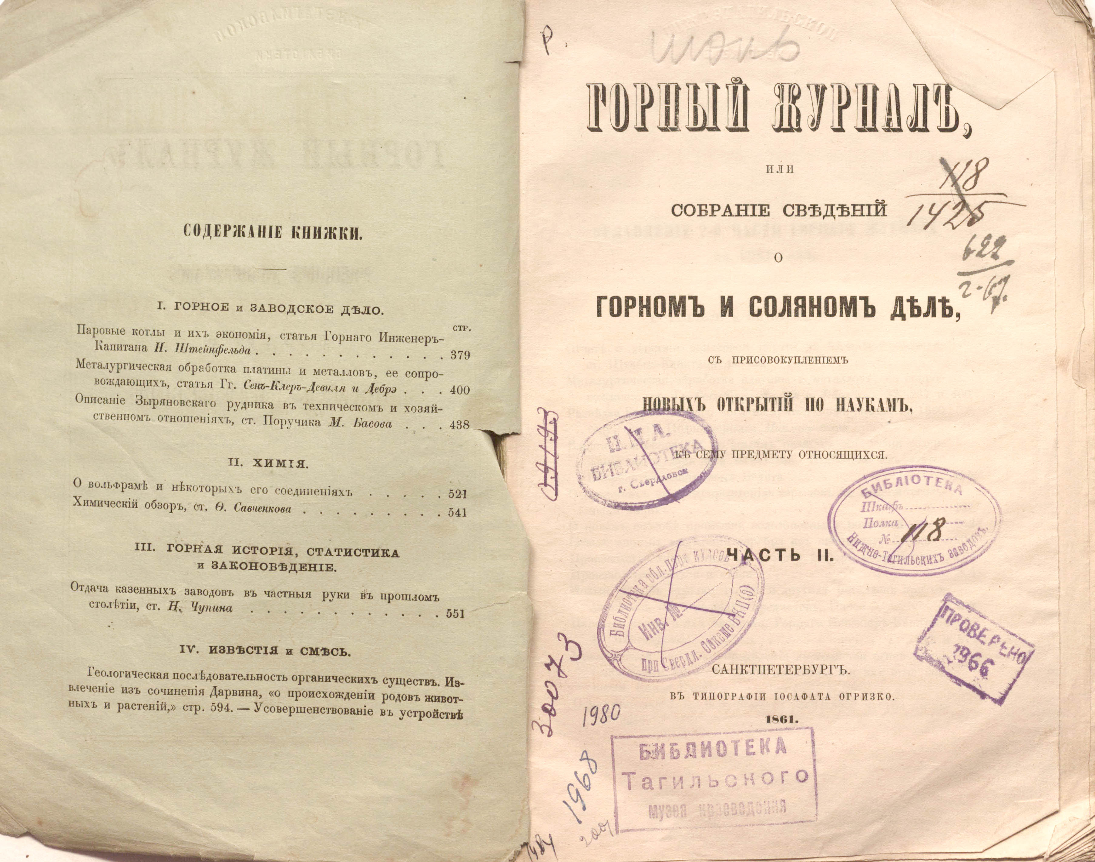 Горный журнал или Собрание сведений о горном и соляном деле, С присовокуплением новых открытий по наукам, к сему предмету относящимся. - Санкт-Петербург : Печатано в Военной типографии Главнаго штаба его императорскаго величества ; в типографии Экспедиции заготовления государственных бумаг ; в типографии Карла Крайя ; в типографии императорской академии наук, 1825 - 1918.