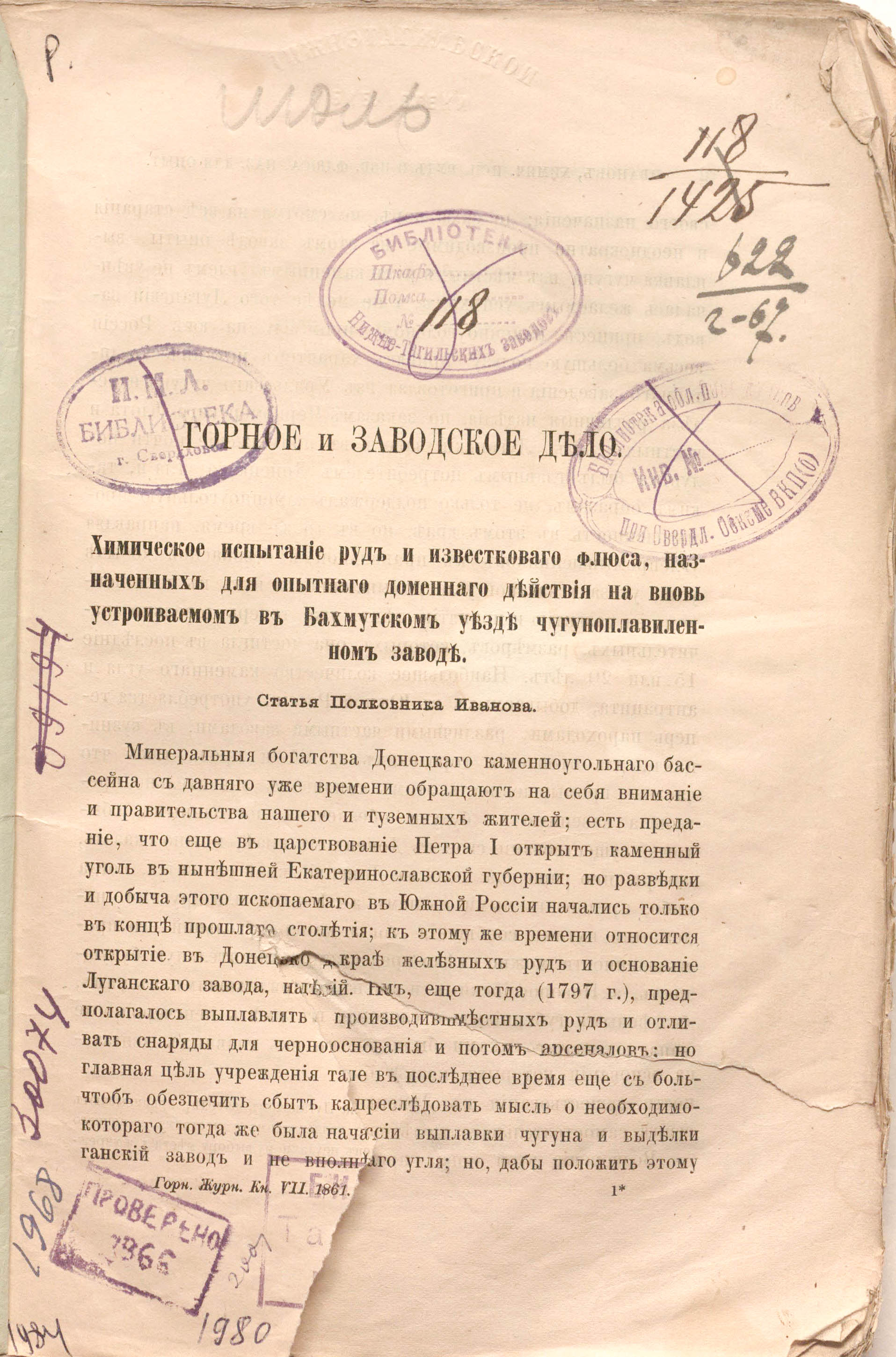 Горный журнал или Собрание сведений о горном и соляном деле, С присовокуплением новых открытий по наукам, к сему предмету относящимся. - Санкт-Петербург : Печатано в Военной типографии Главнаго штаба его императорскаго величества ; в типографии Экспедиции заготовления государственных бумаг ; в типографии Карла Крайя ; в типографии императорской академии наук, 1825 - 1918.