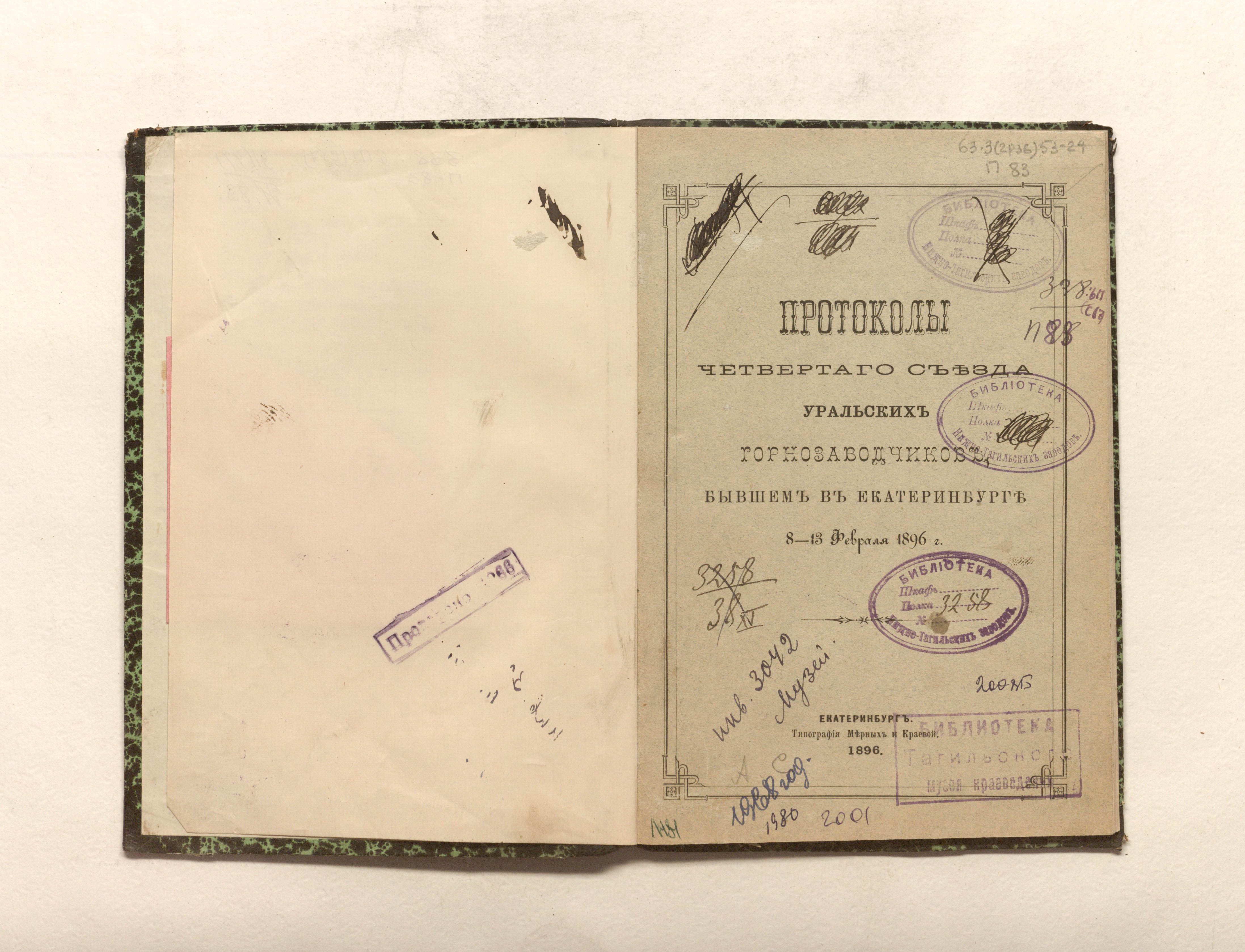 Протоколы четвертого съезда уральских горнозаводчиков, бывшем в Екатеринбурге 8-13 февраля 1896 г. — Екатеринбург : Типография Мерных и Краевой, 1896. — 39 с. ; 21,х14,5 см.