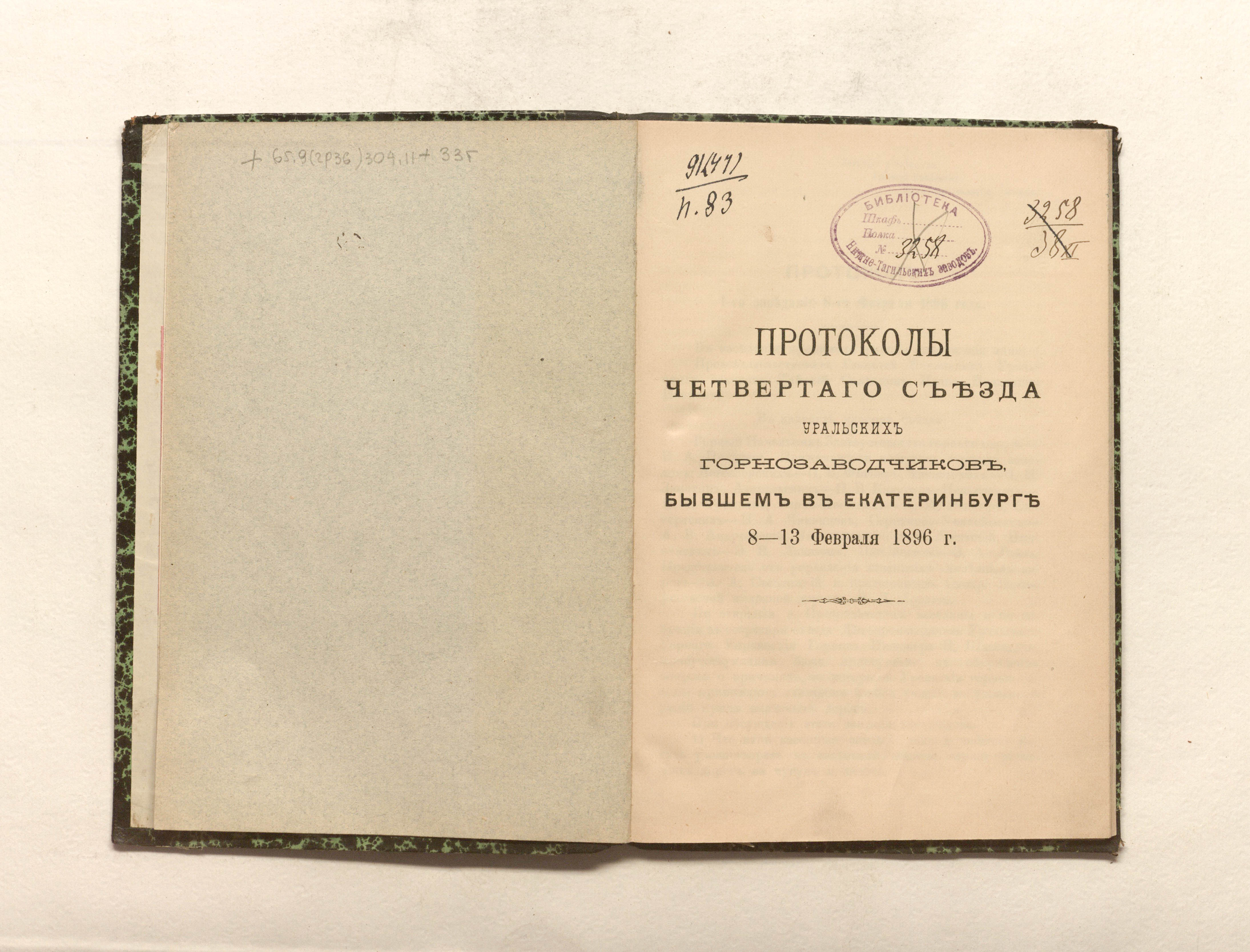«Библиотека Нижне-Тагильских заводов № 3258» (изд. обл., тит. л.).