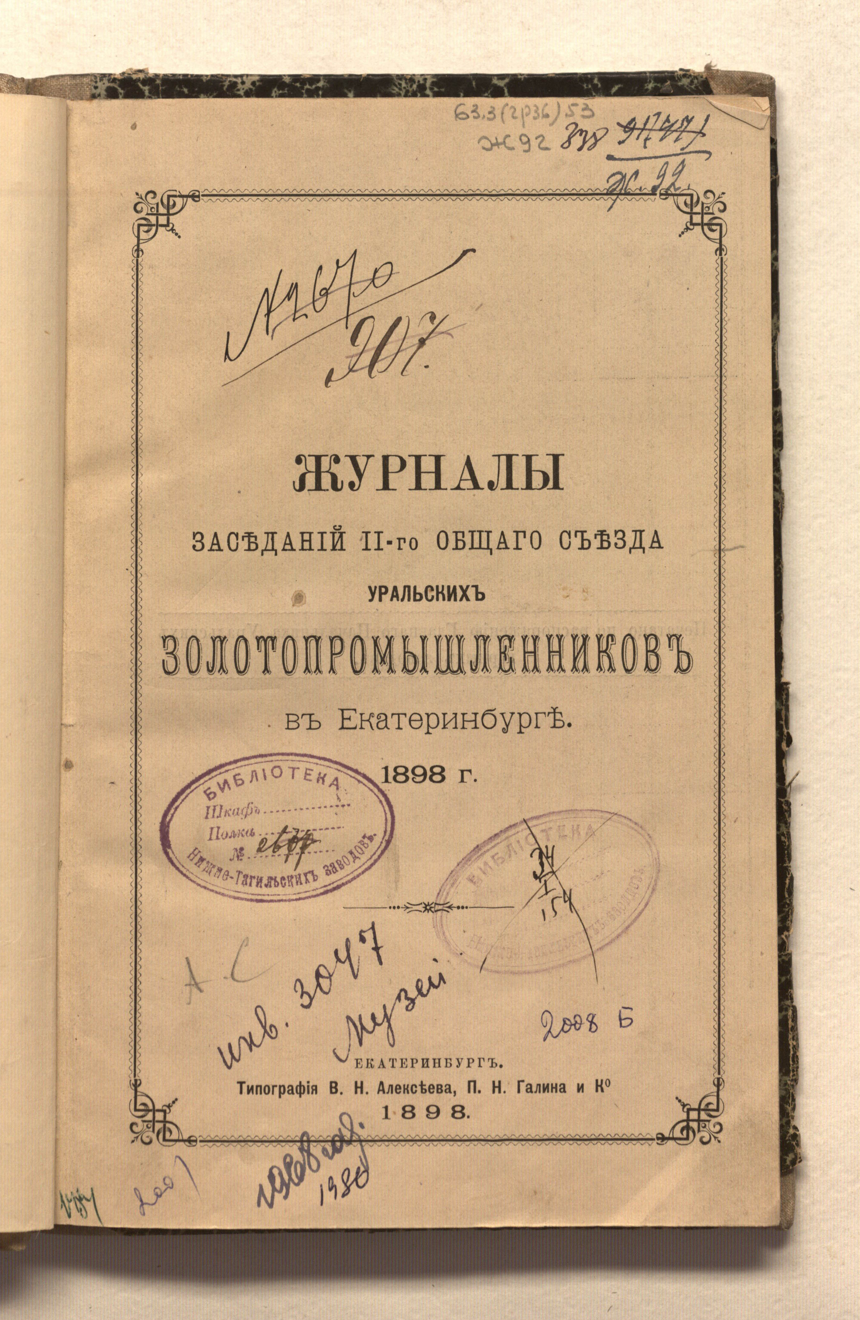 Журнал заседаний 2-го общего съезда уральских золотопромышленников в Екатеринбурге. 1898 г. — Екатеринбург : типография В. Н. Алексеева, Н. Н. Галина и К, 1898. — 191 с. ; 23х15 см.
