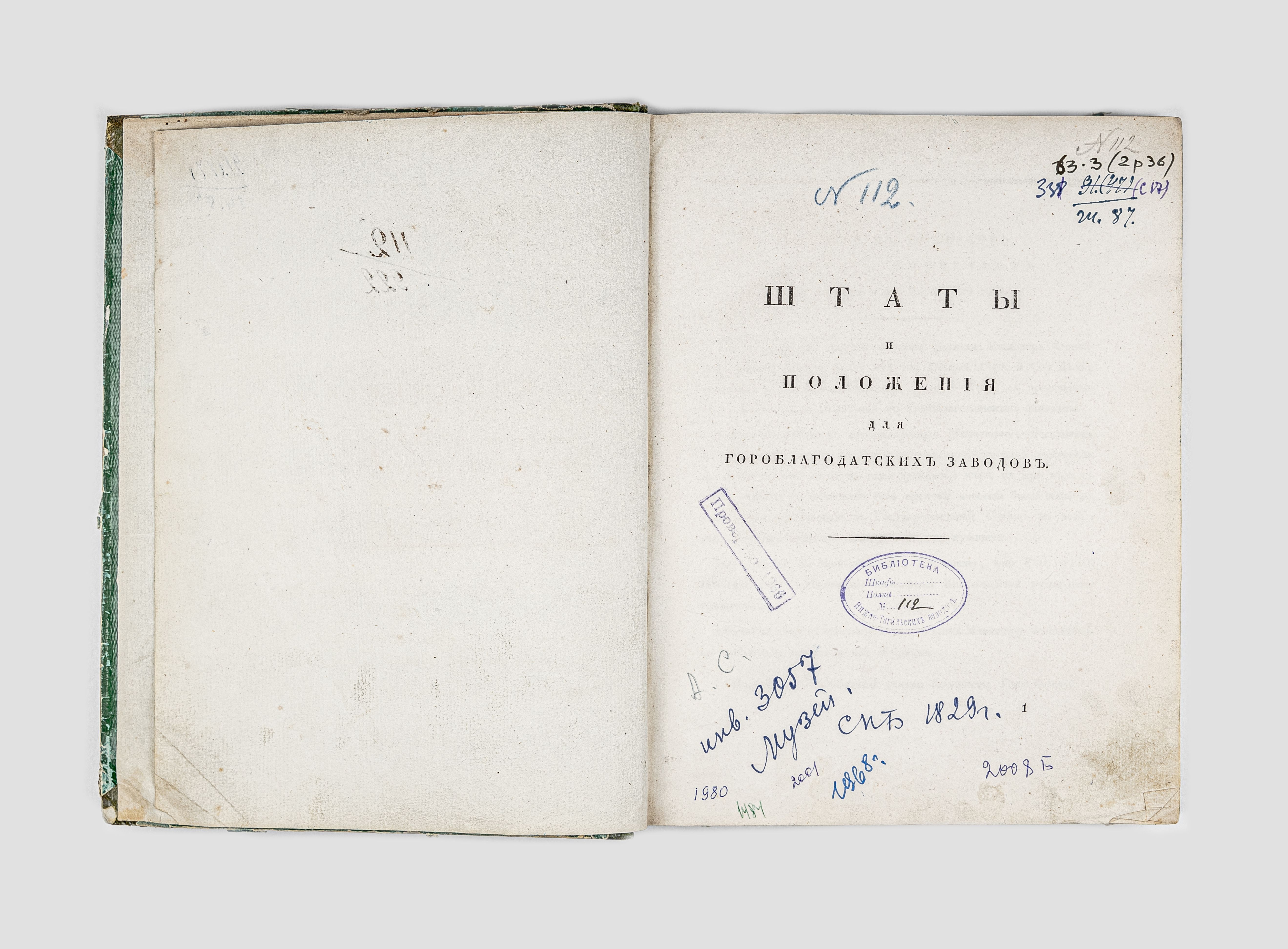 Штаты и положения для Гороблагодатских заводов. – [Санкт-Петербург : б. и., 1829]. – 604, [5] с. ; 26,5х20 см.