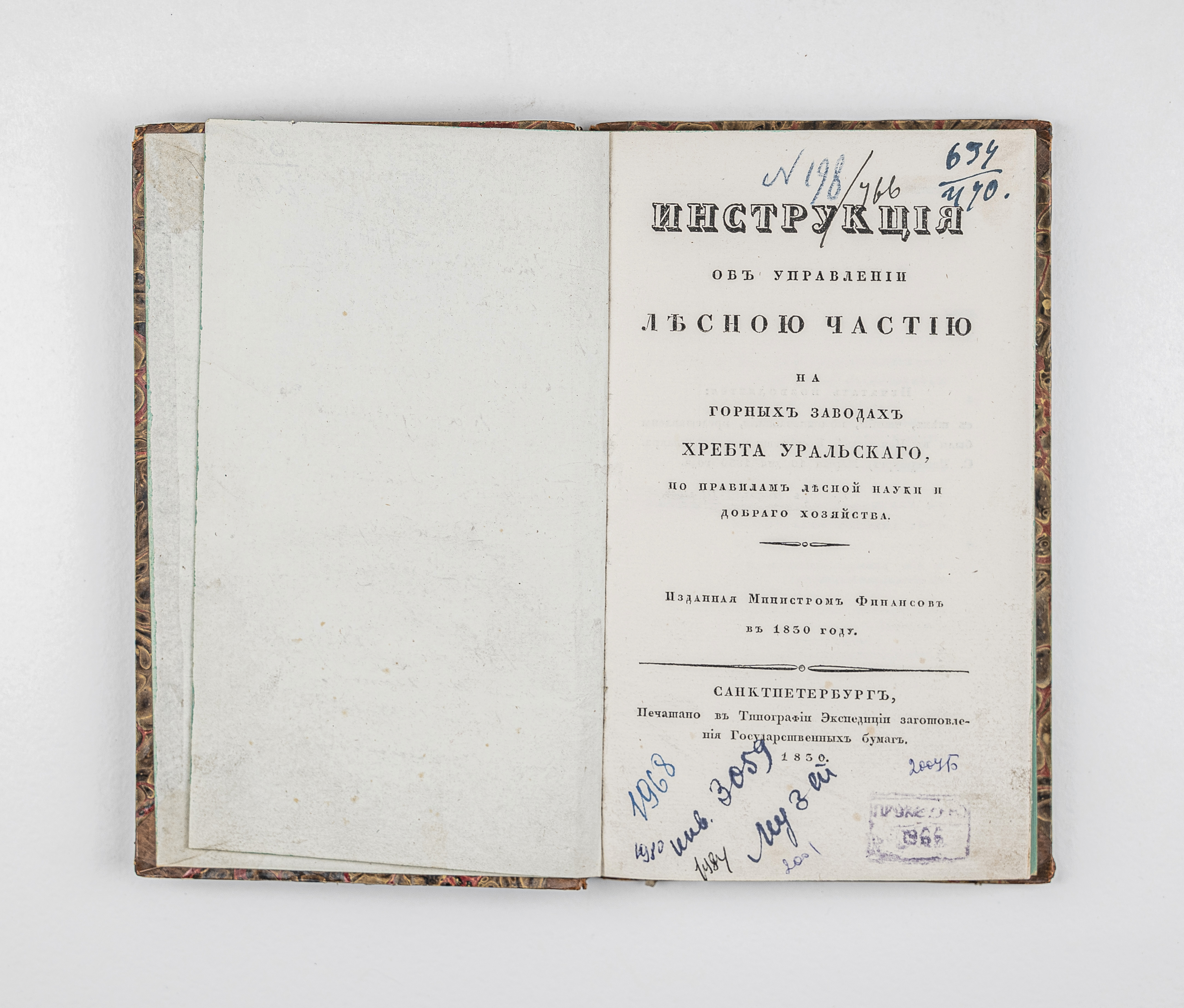 Канкрин, Е. Ф. (1774-1845). Инструкция об управлении лесною частию на горных заводах хребта Уральского, по правилам лесной науки и добраго хозяйства / Е. Ф. Канкрин. – Санкт-Петербург : в тип. Экспедиции заготовления государственных бумаг, 1830. – VIII, 175, [4] с. ; 21х13 см.