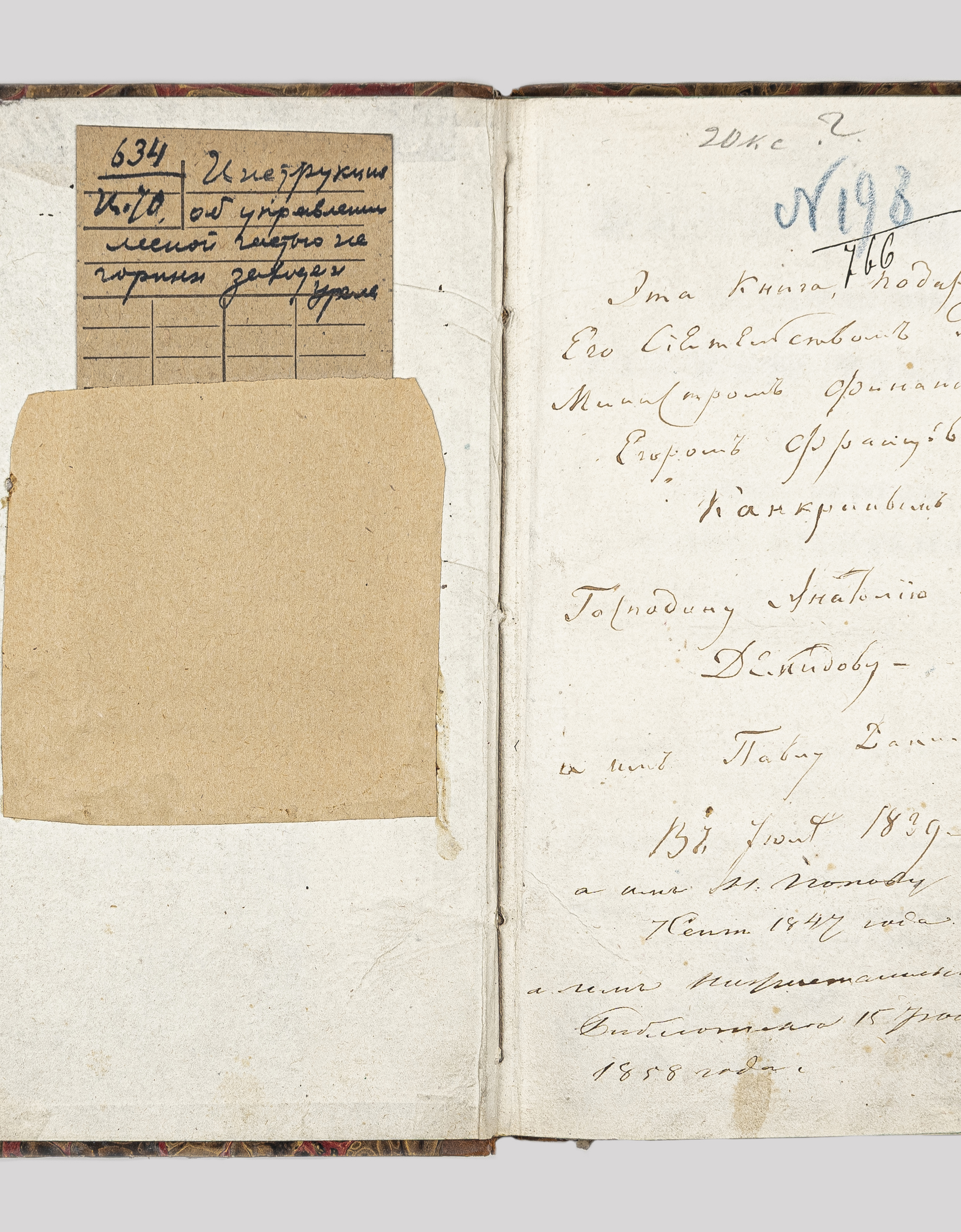 «Эта Книга подарена Его Сиятельством Господином Министром финансов Егором Францевичем Канкриным Господину Анатолию Николаевичу Демидову, а им Павлу Данилову в июле 1839.» Далее другим почерком «а им Н. Попову 1 сент. 1847 года, а им Нижнетагильской библиотеке 15 июня 1858 года» (форзац).