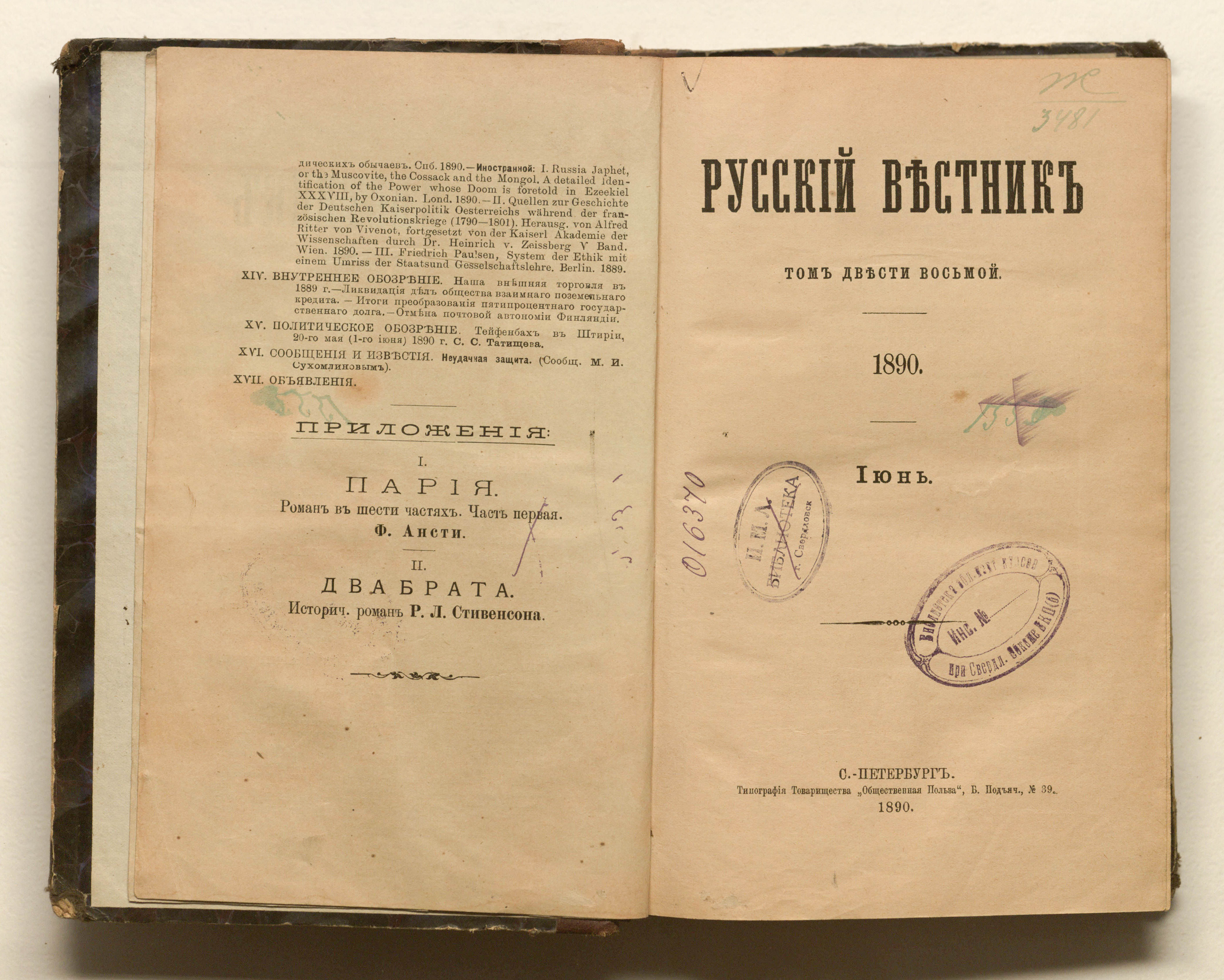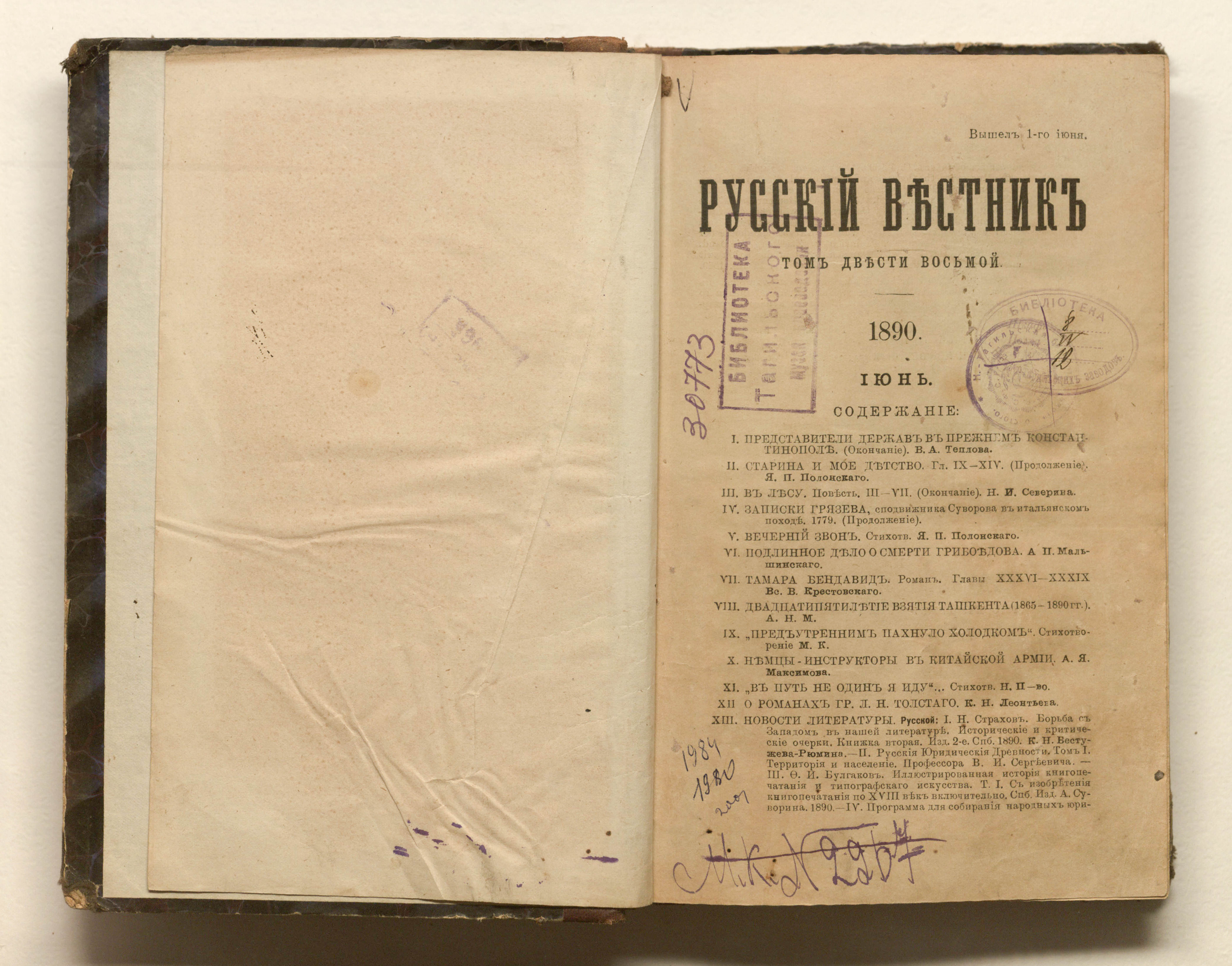 Русский вестник : журнал литературный и политический. № 6. Май : т. 208. – Санкт-Петербург : Товарищество "Общественная польза", 1890. – [404] с. разд. паг. ; 24х16 см.
