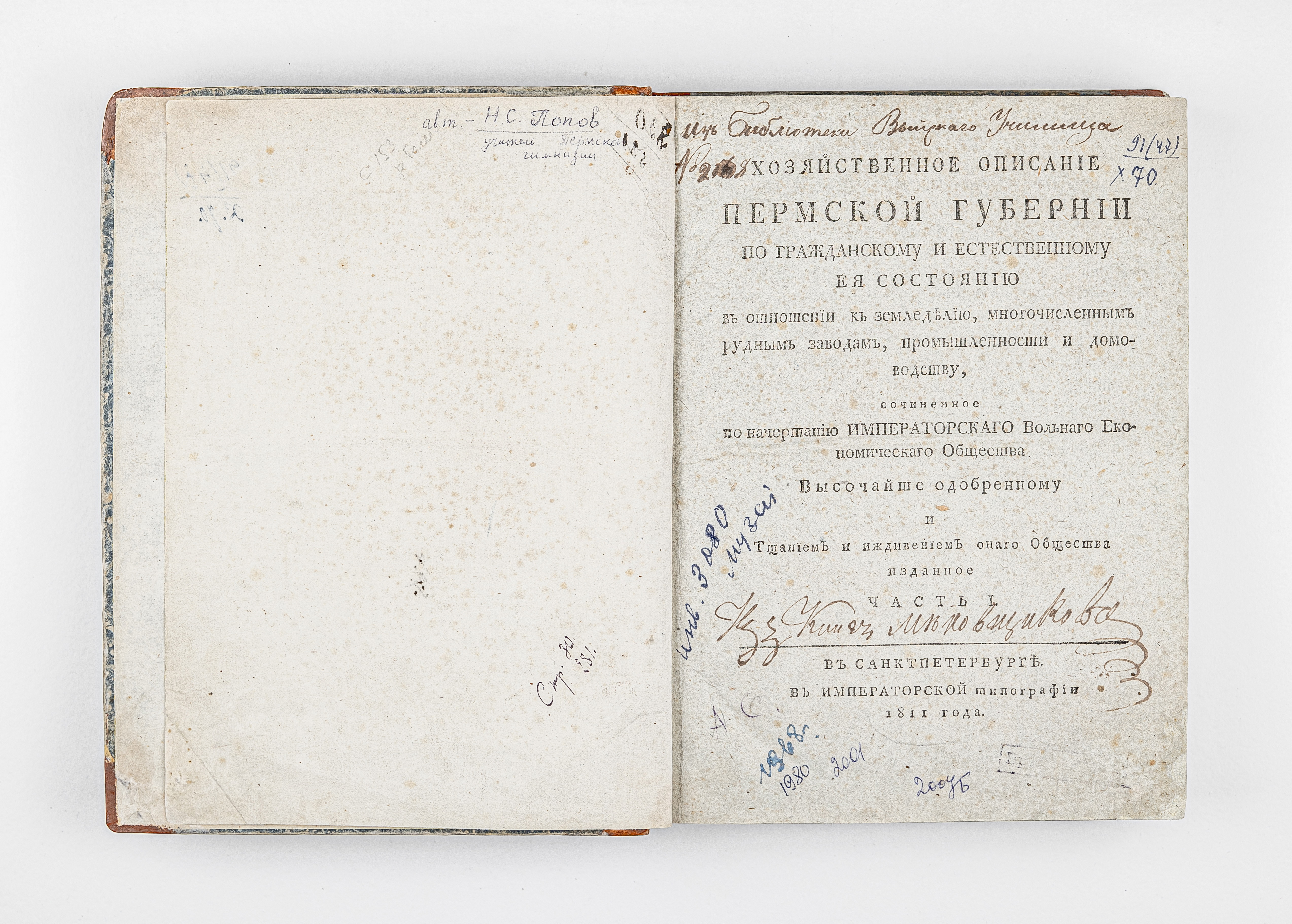 Попов, Никита Саввич (1763-1834). Хозяйственное описание Пермской губернии по гражданскому и естественному ея состоянию в отношении к земледелию, многочисленным рудным заводам, промышленности и домоводству / Н. С. Попов ; сочиненное по начертанию Императорскаго Вольнаго економическаго общества высочайше одобренному и тщанием и иждивением онаго общества изданное. Ч. 1-3. – Санкт-Петербург : В Императорской тип., 1811 ; 1813.