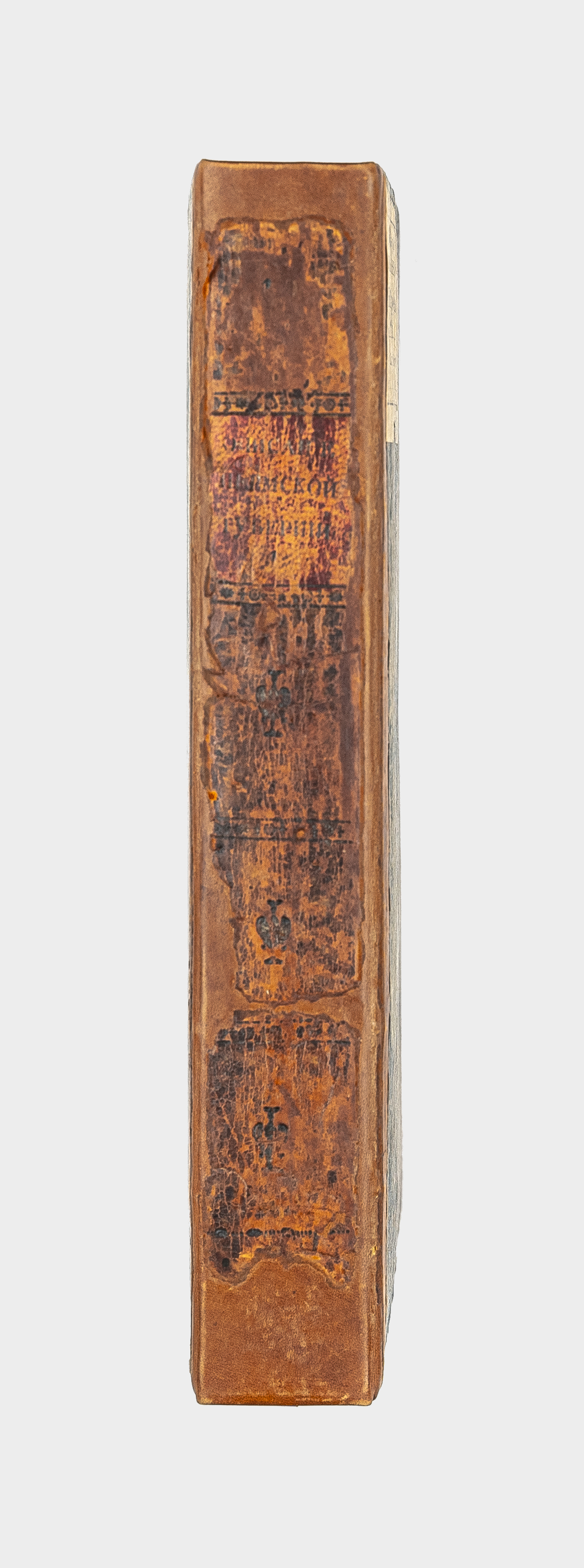 Книга в полукожаном владельческом переплете. Крышки переплета обтянуты бумагой с рисунком «под мрамор». Обрез тонированный. Бумага верже. Водяной знак (с.6 и далее).