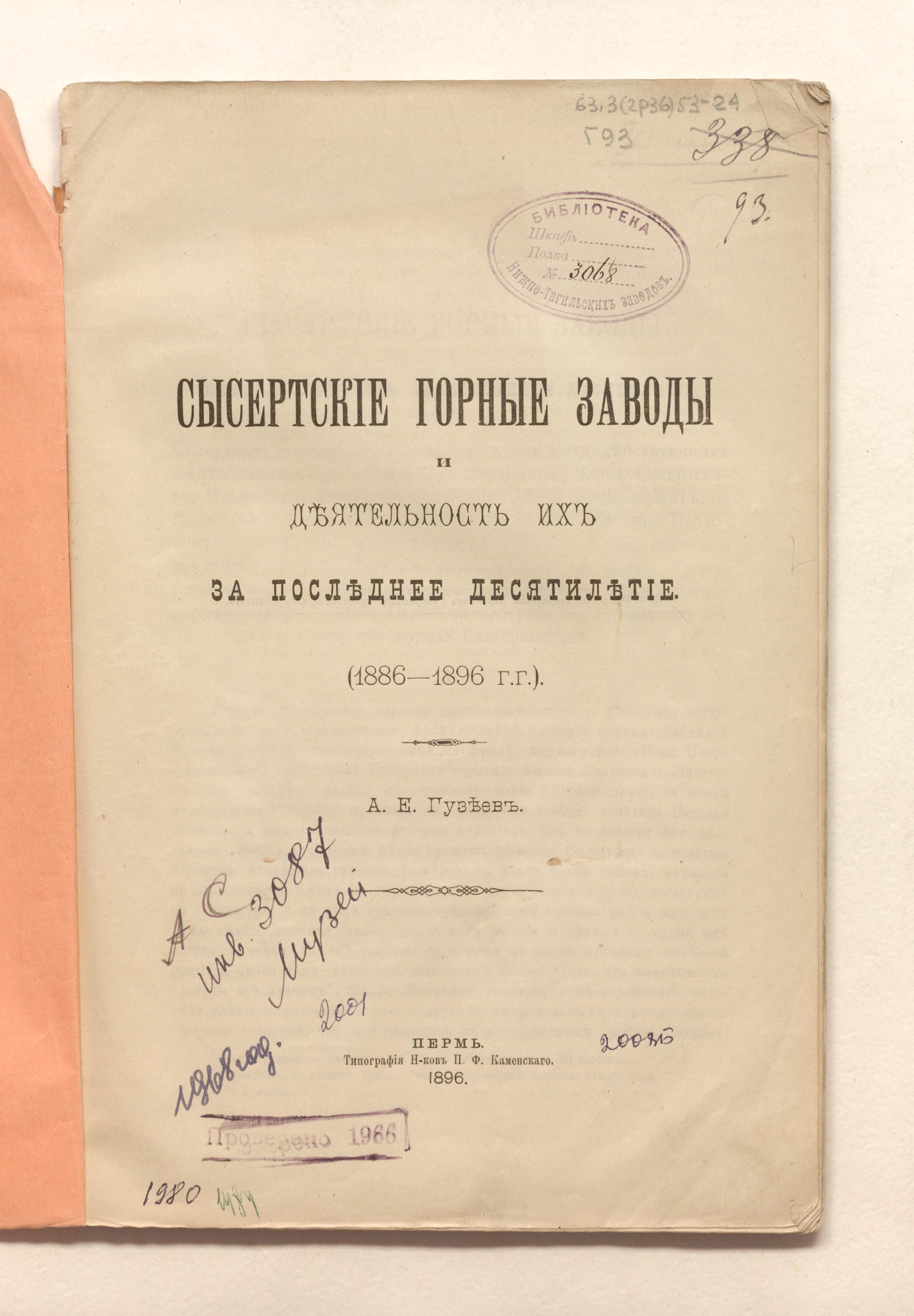 Сысертские горные заводы и деятельность их за последнее десятилетие (1886-1896 гг.) / А. Е. Гузеев. — Пермь : Типография Н-ков П. Ф. Каменского, 1896. — 72 с. : 11 диаграмм ; 26х17 см.