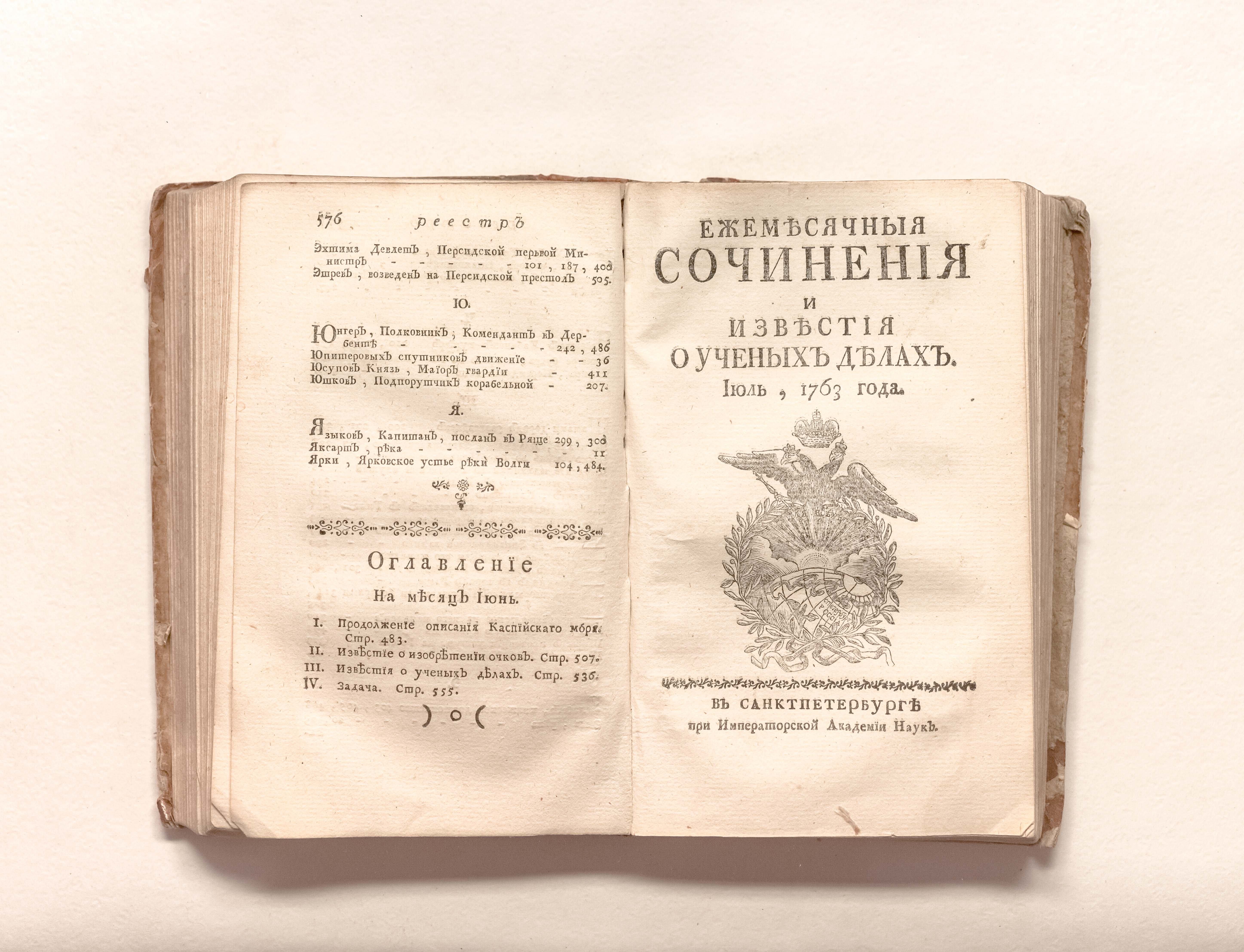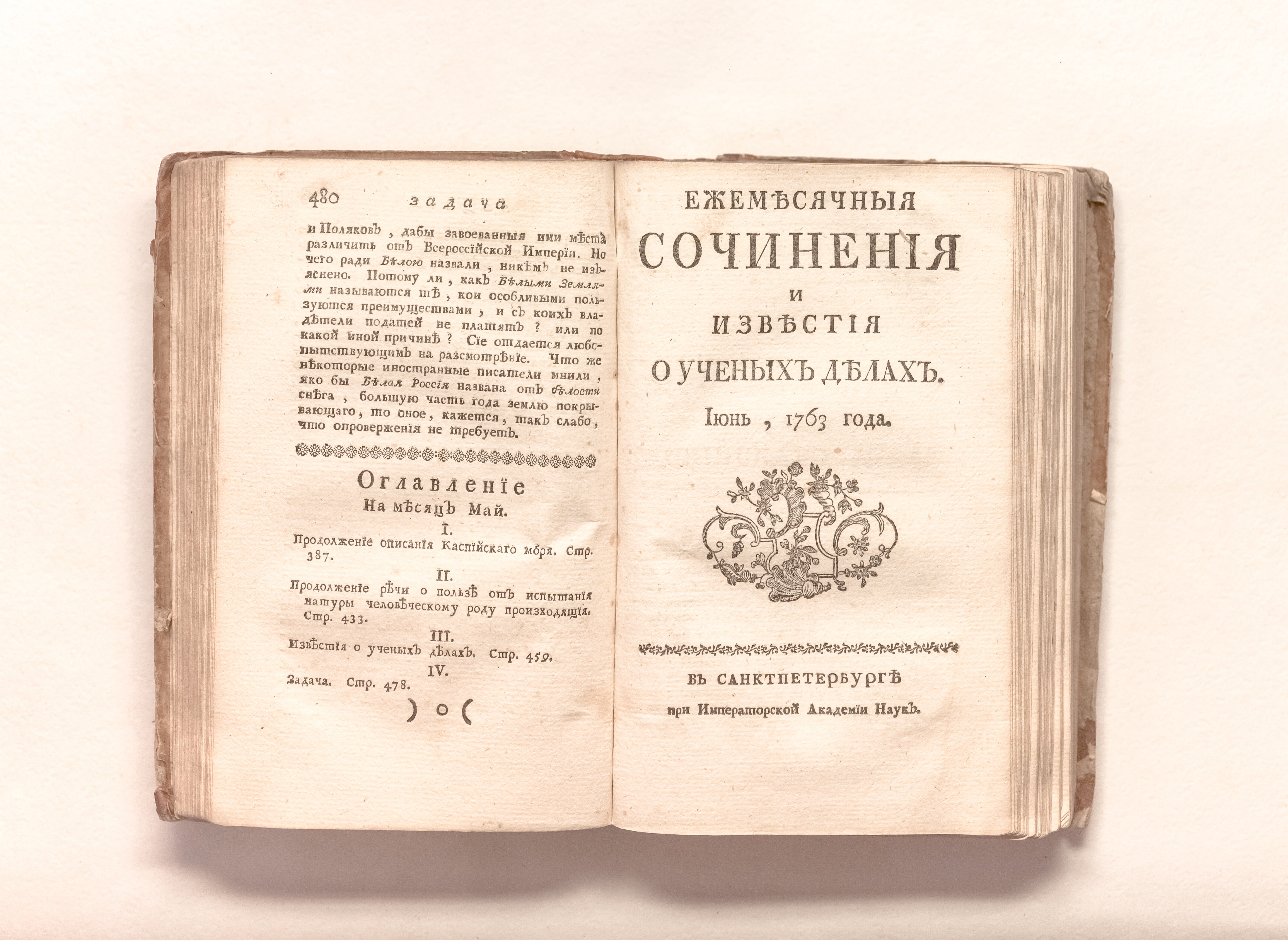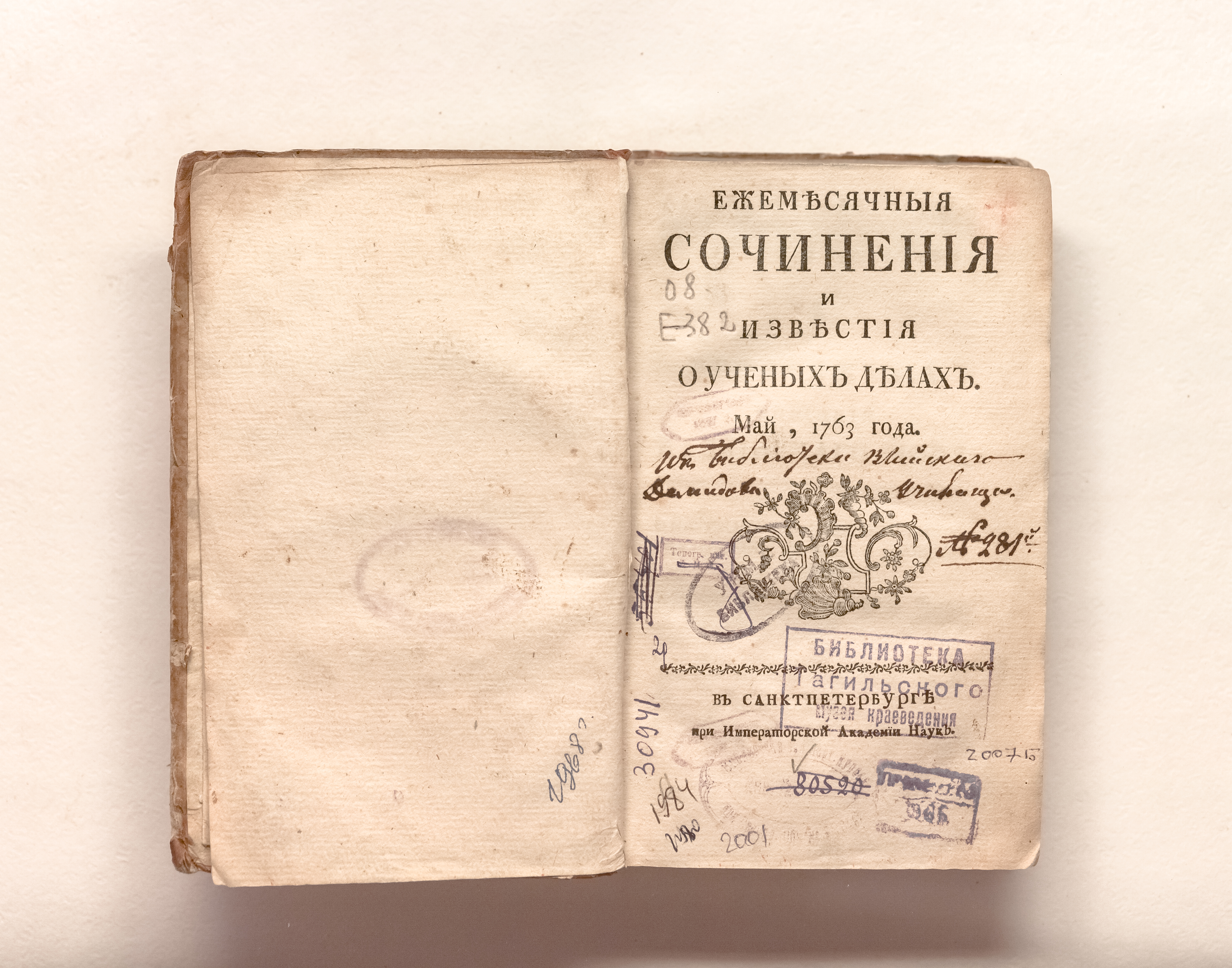 Ежемесячныя сочинения и известия о ученых делах. — Санкт-Петербург : При Императорской Академии наук. — 1763. — Май-август. — 387-576, 1-192 с. ; 19х12 см.