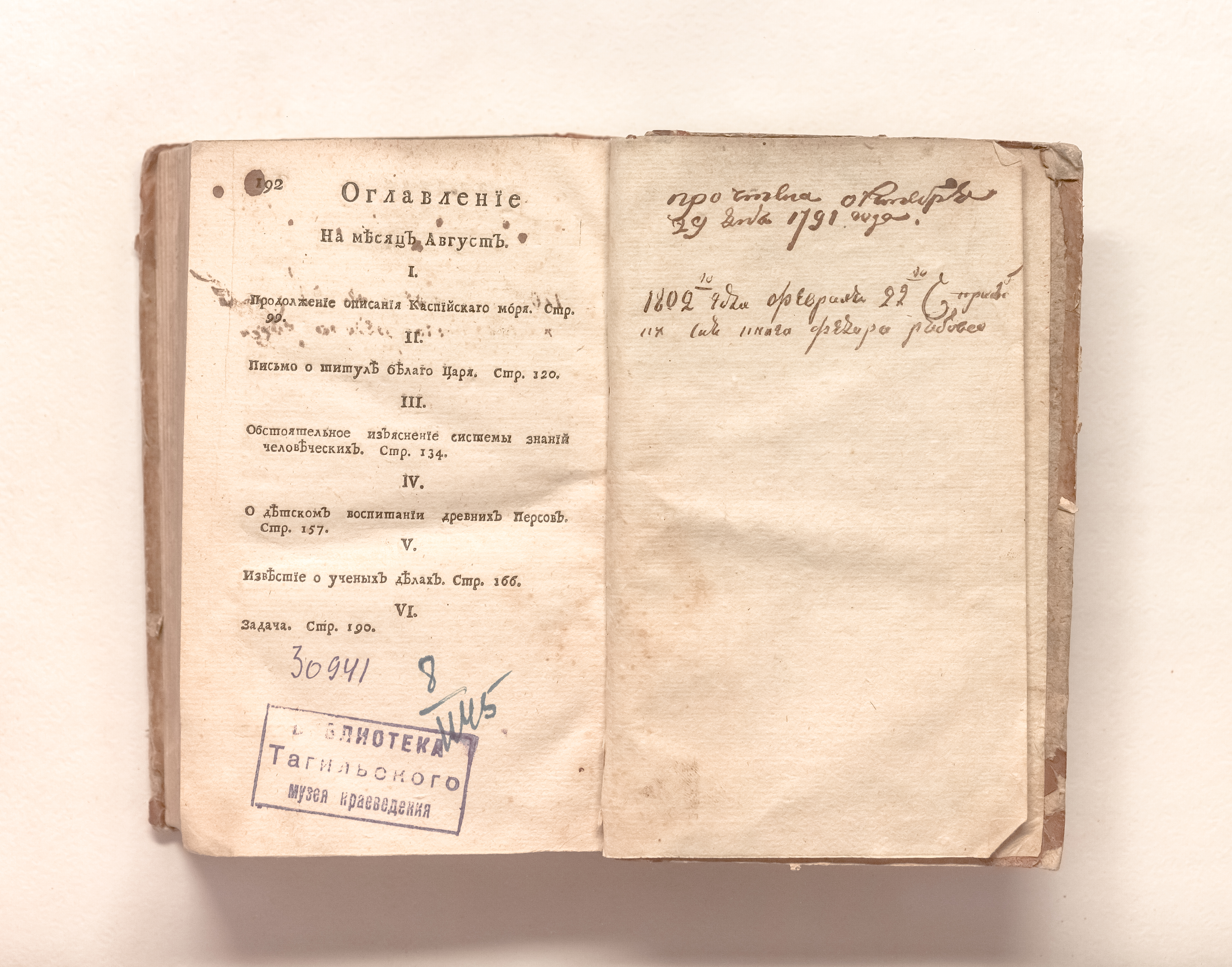 "Из библиотеки Выйскаго Демидовс. училища № 281»(тит. л.); "Из библиотеки Выйскаго училища»(форзац.); "Прочтено октября 29 дня 1791 года."; "1802 года февраля 22-го /неразборчиво/ Федора Рябова" (нахцац).