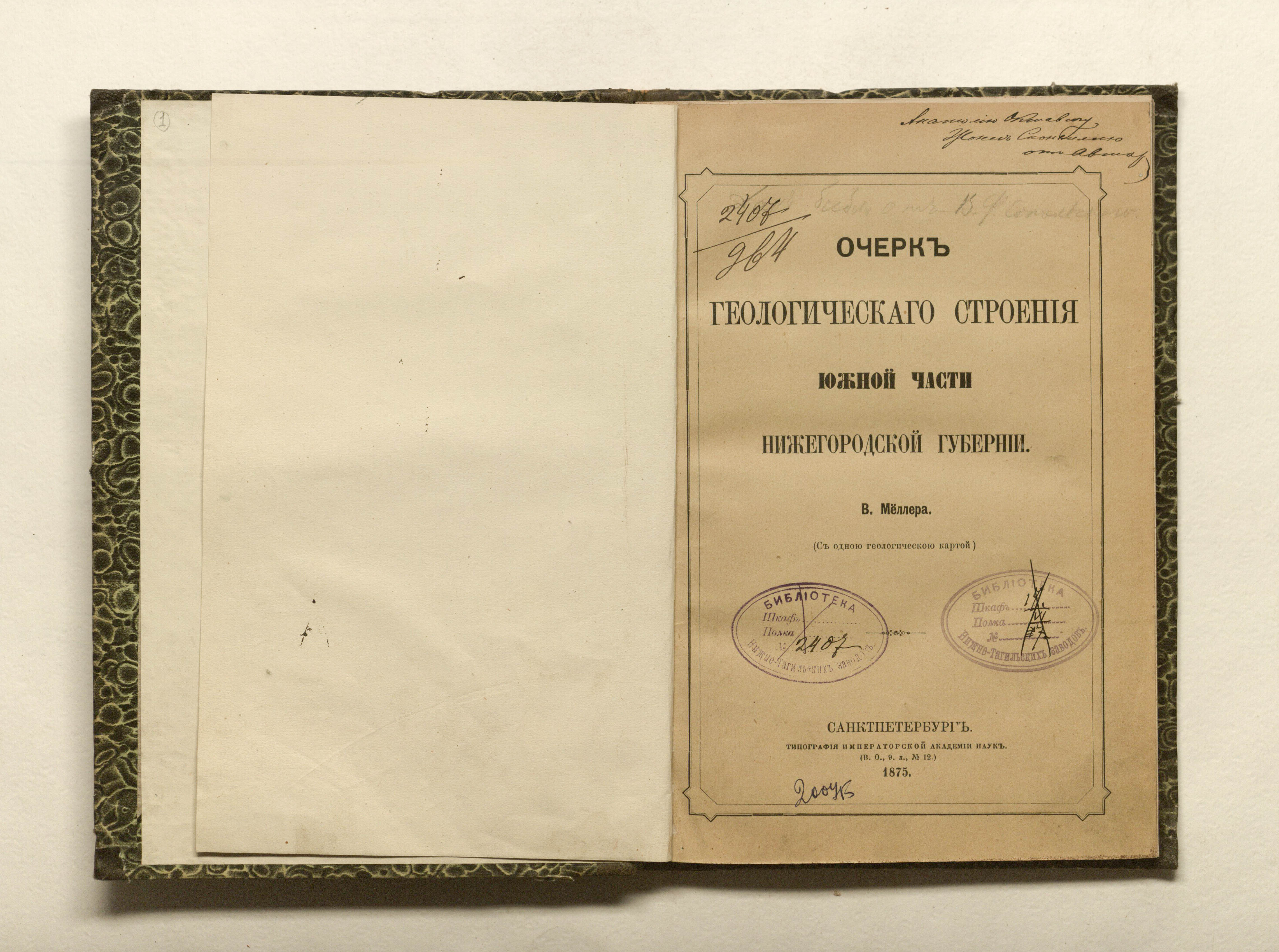 «Библиотека Нижне-Тагильских заводов № 2407» (изд. обл.);