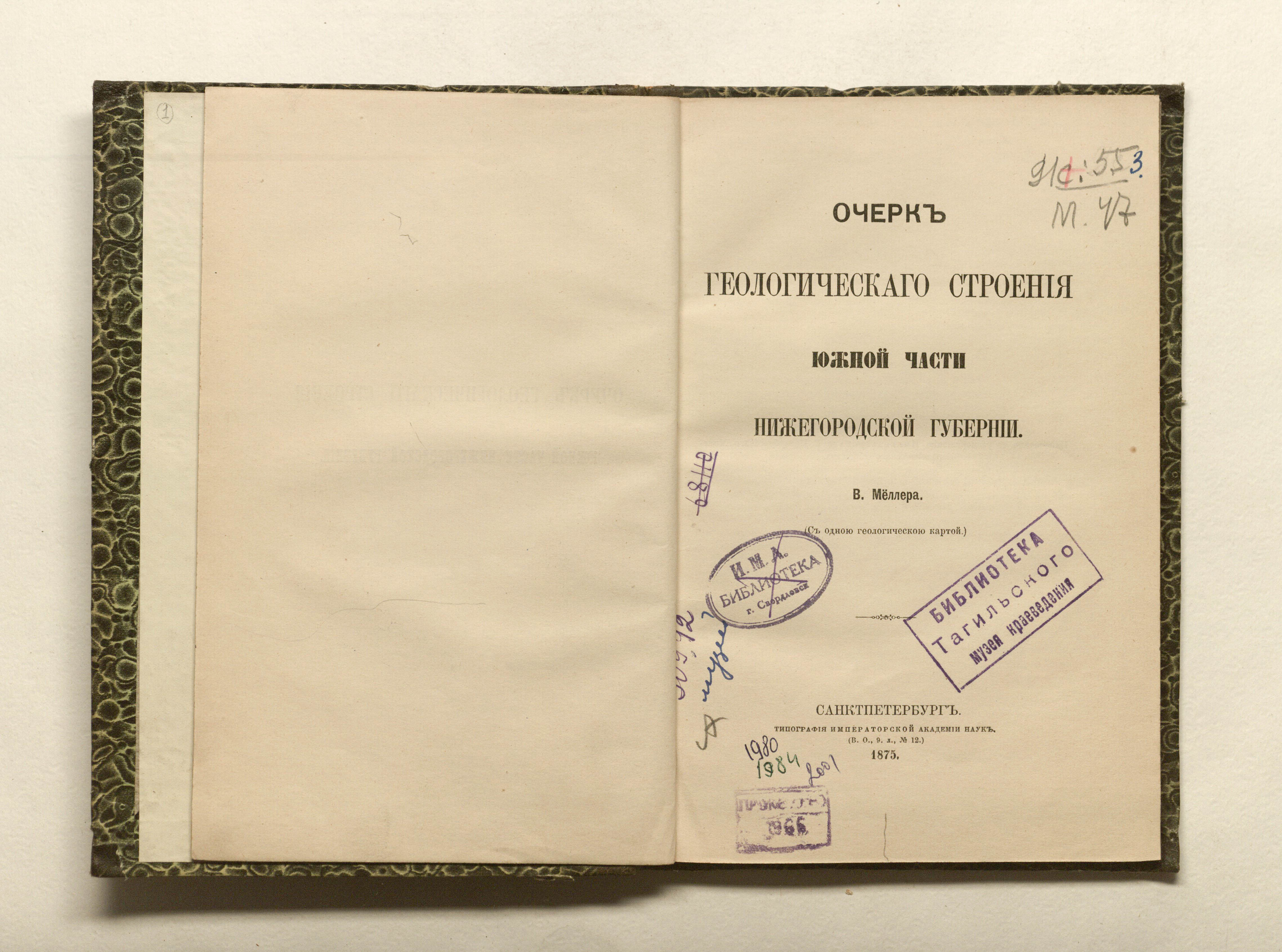 Меллер, Валериан Иванович (1840-1910). Очерк геологического строения южной части Нижегородской губернии : (с одной геологической картой) / [Соч.] В. Меллера. — Санкт-Петербург : тип. Имп. Акад. наук, 1875. — [6], 89 с. : карты.