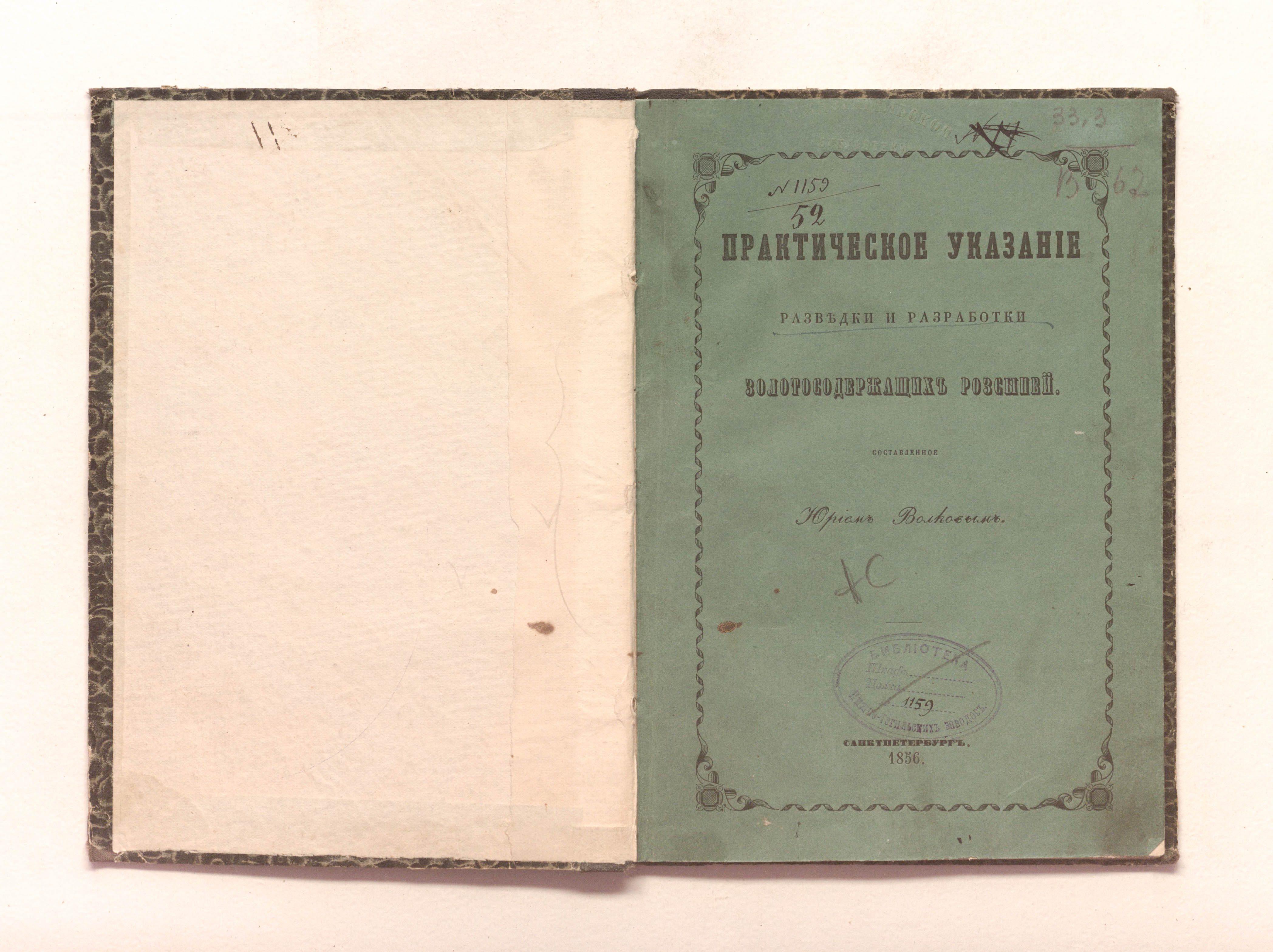 Волков, Юрий. Практическое указание разведки и разработки золотосодержащих россыпей / Ю. Волков. — Санкт-Петербург : типография Э. Веймара, 1856. — 63 с.