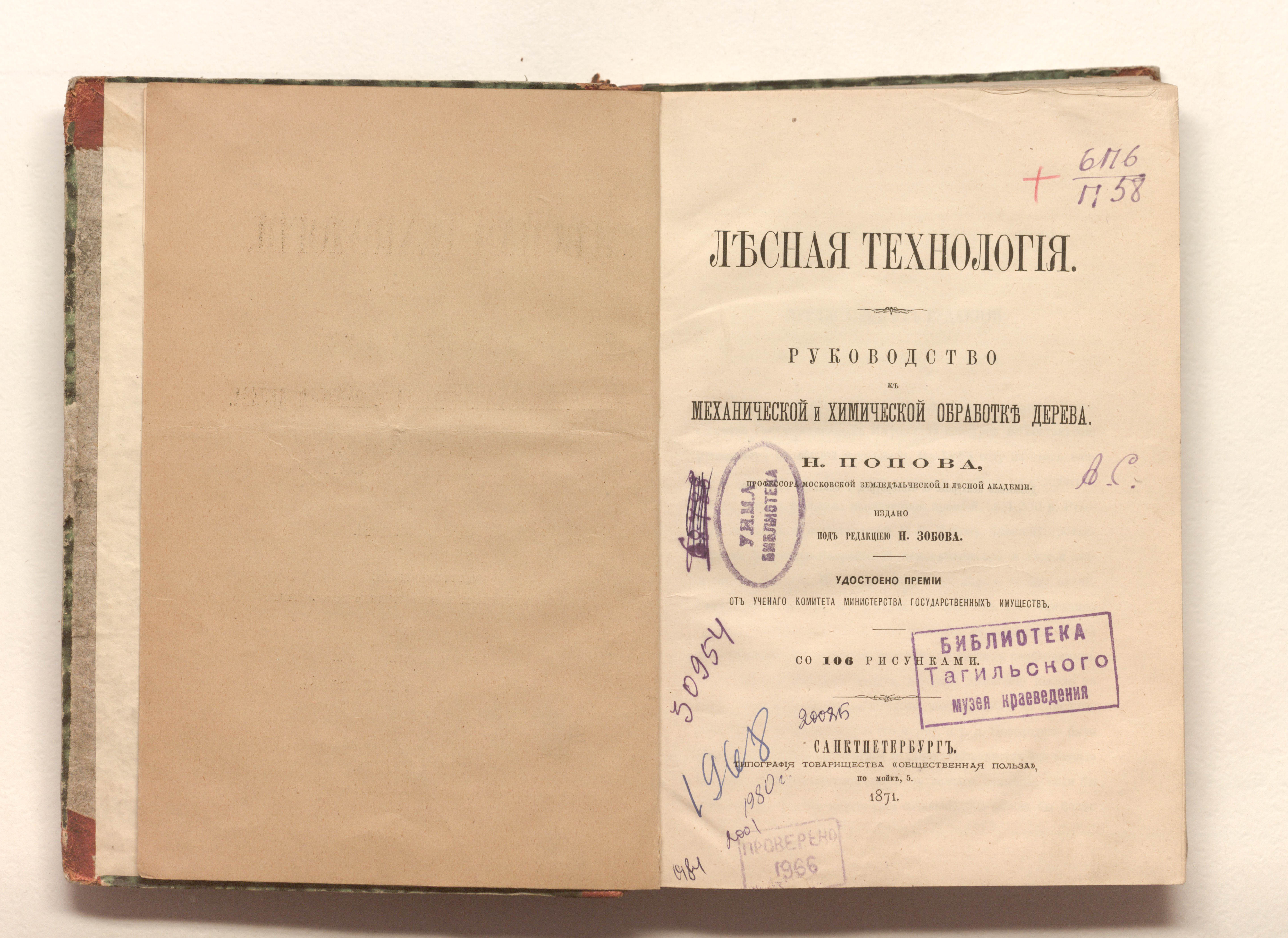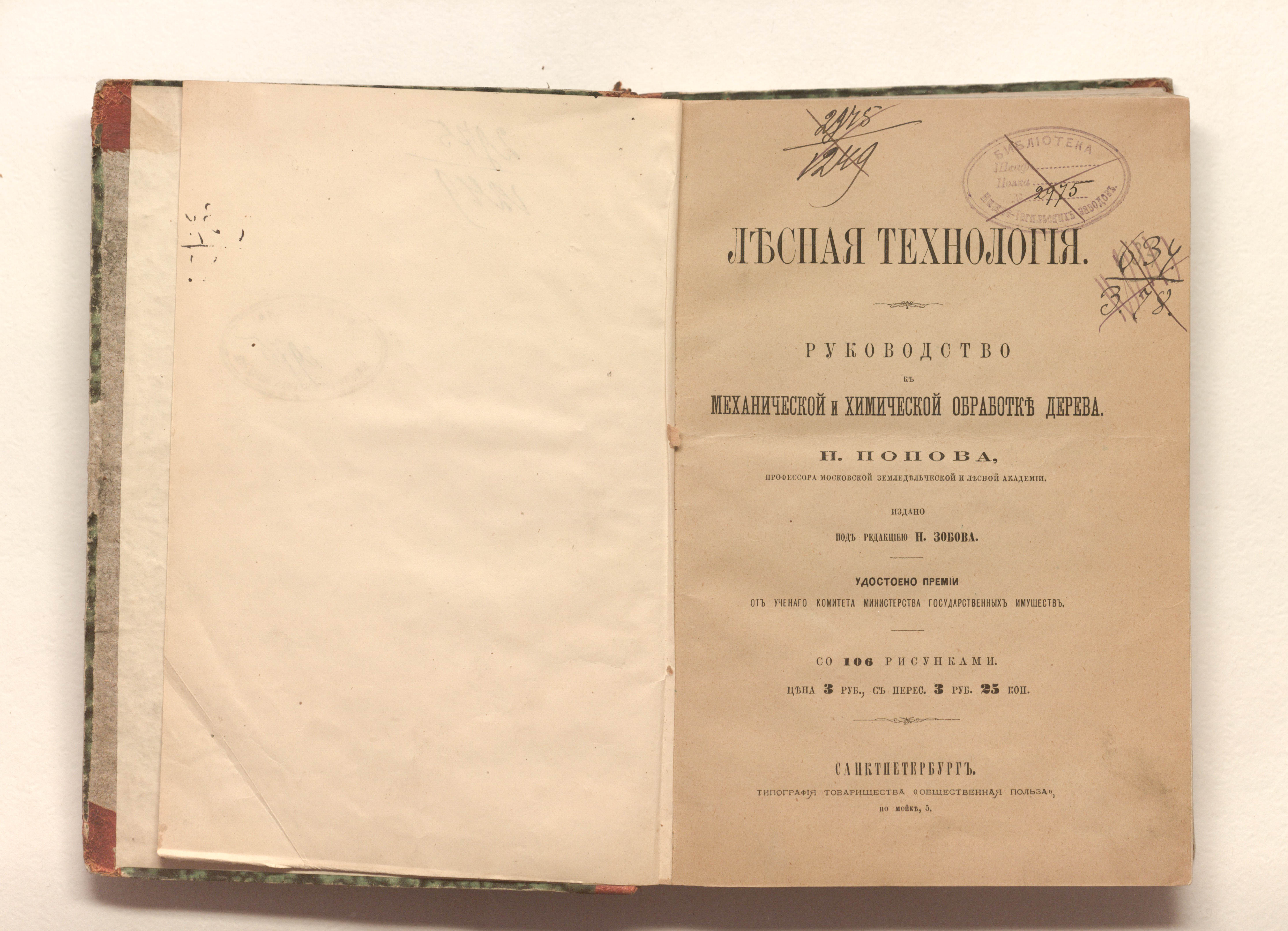 Лесная технология : руководство к механической и химической обработке дерева / [Соч.] Н. Попова, проф. Моск. земледельч. и Лесн. акад.; Изд. под ред. [и с предисл.] Н. Зобова. — Санкт-Петербург : тип. т-ва "Обществ. польза", 1871. — [4], IV, 357 с. : ил. ; 22х15 см.