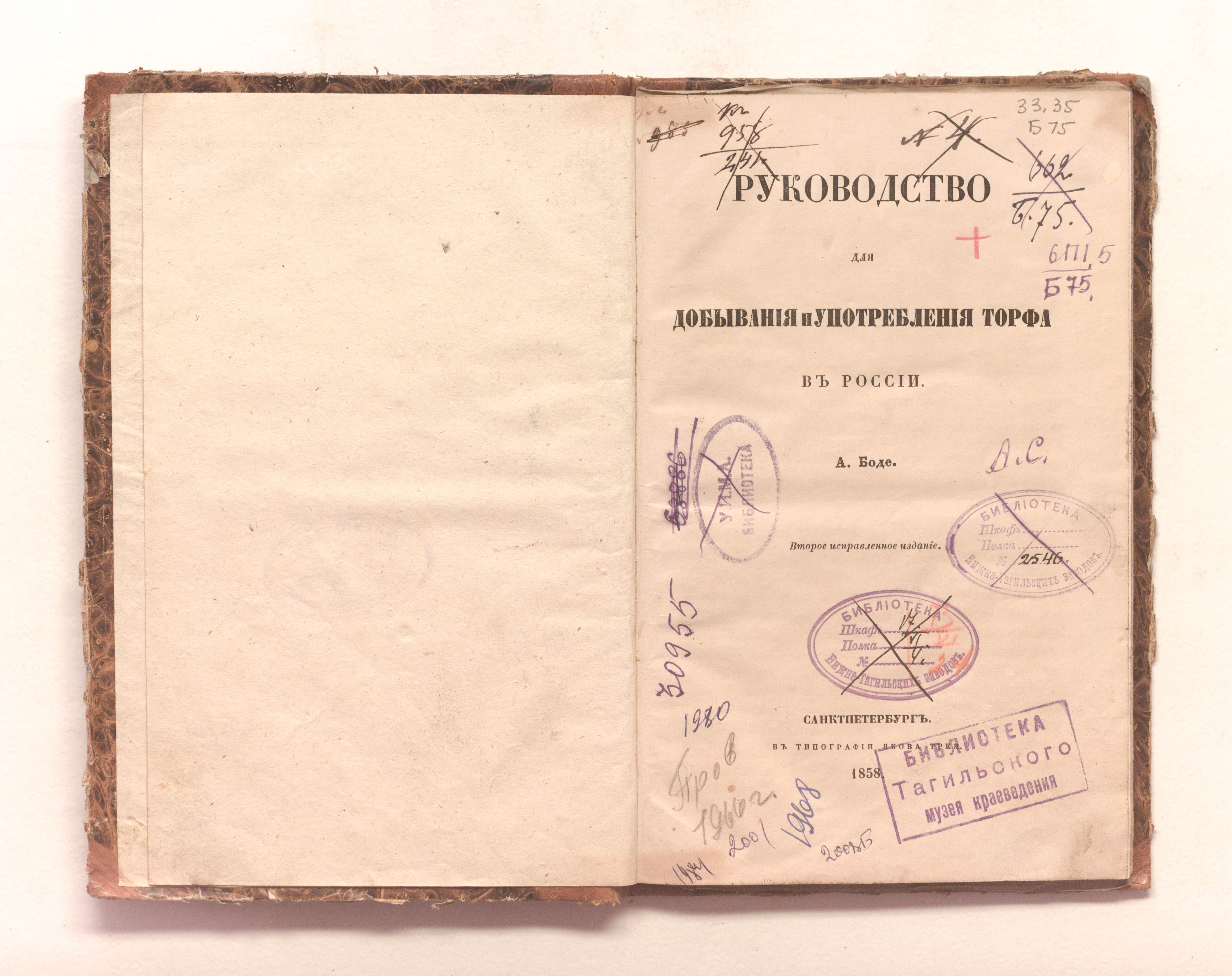Боде, Адольф Фридрих Карл. Руководство для добывания и употребления торфа в России / А.Ф. К. Боде. — 2-е изд., испр. — Санкт-Петербург : тип. Якова Трея, 1858. — [2], 127, [2], 31 с. ; 22,5х14,5 см.
